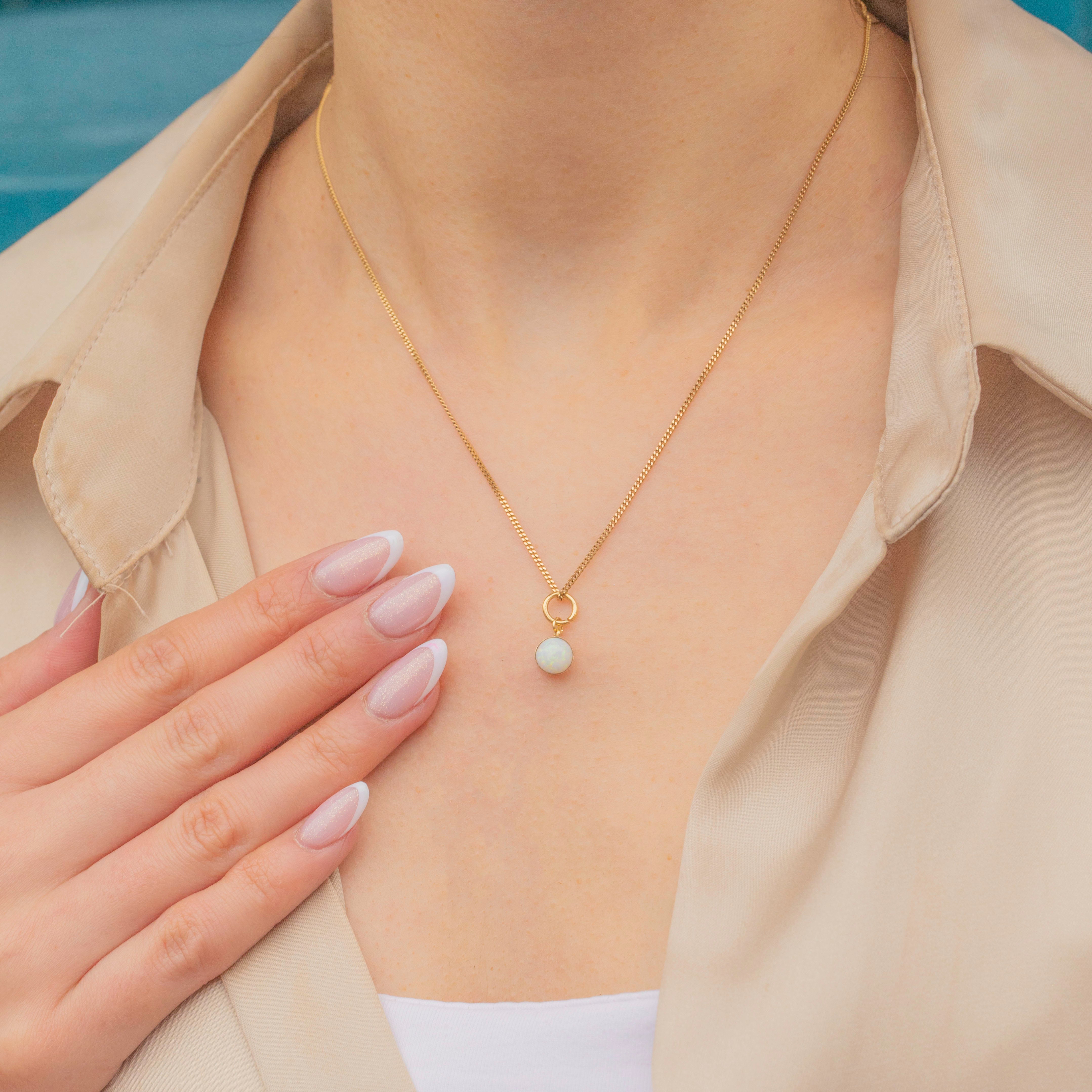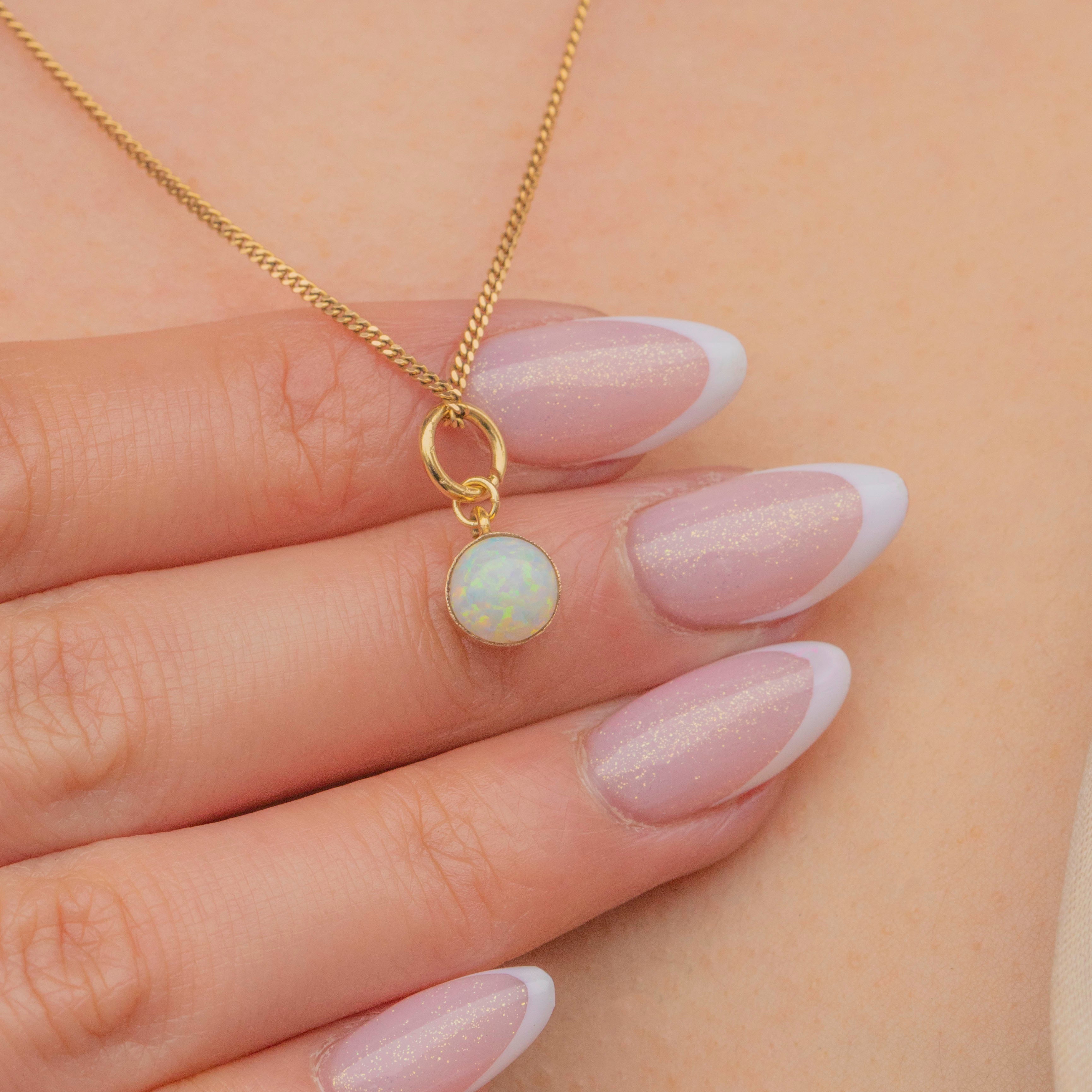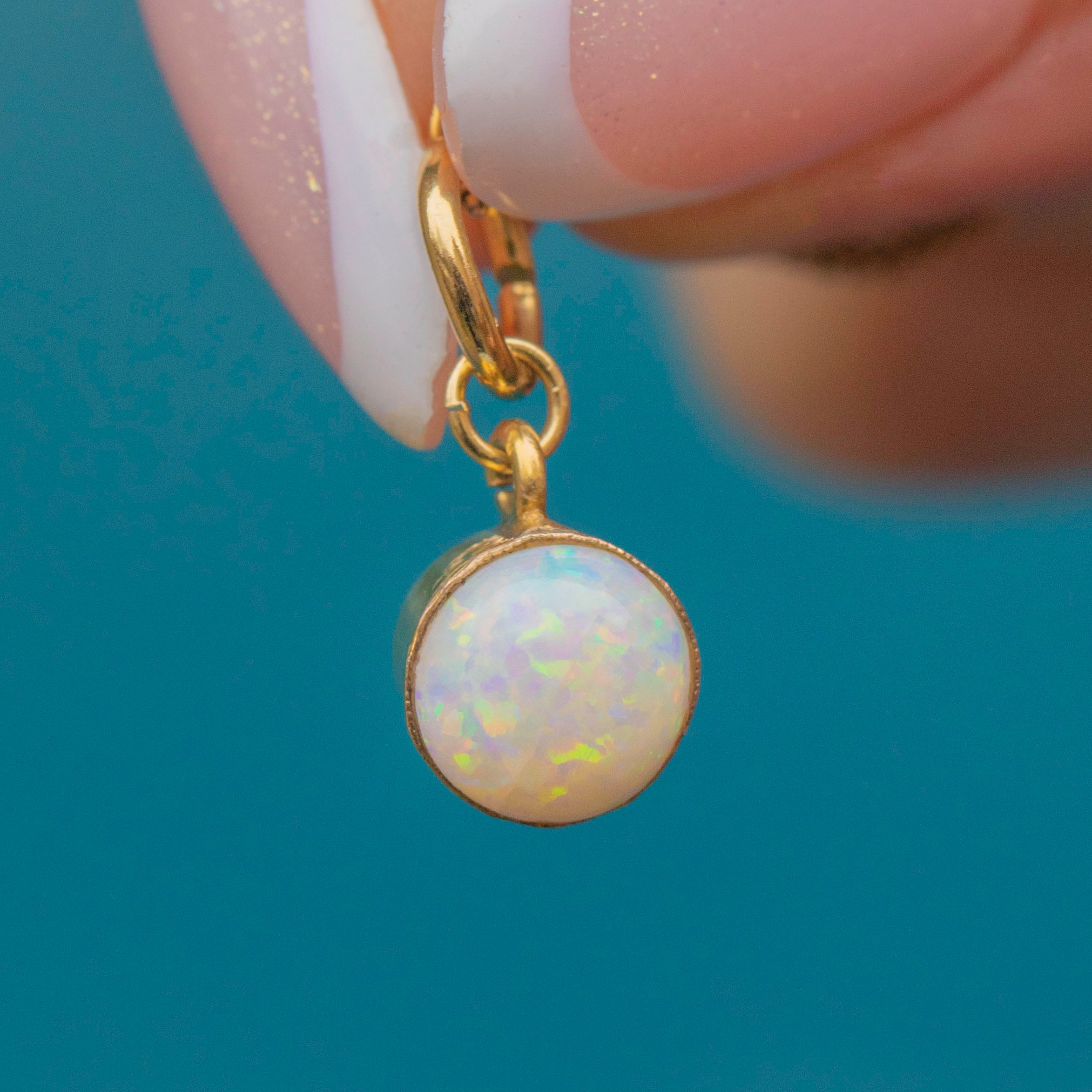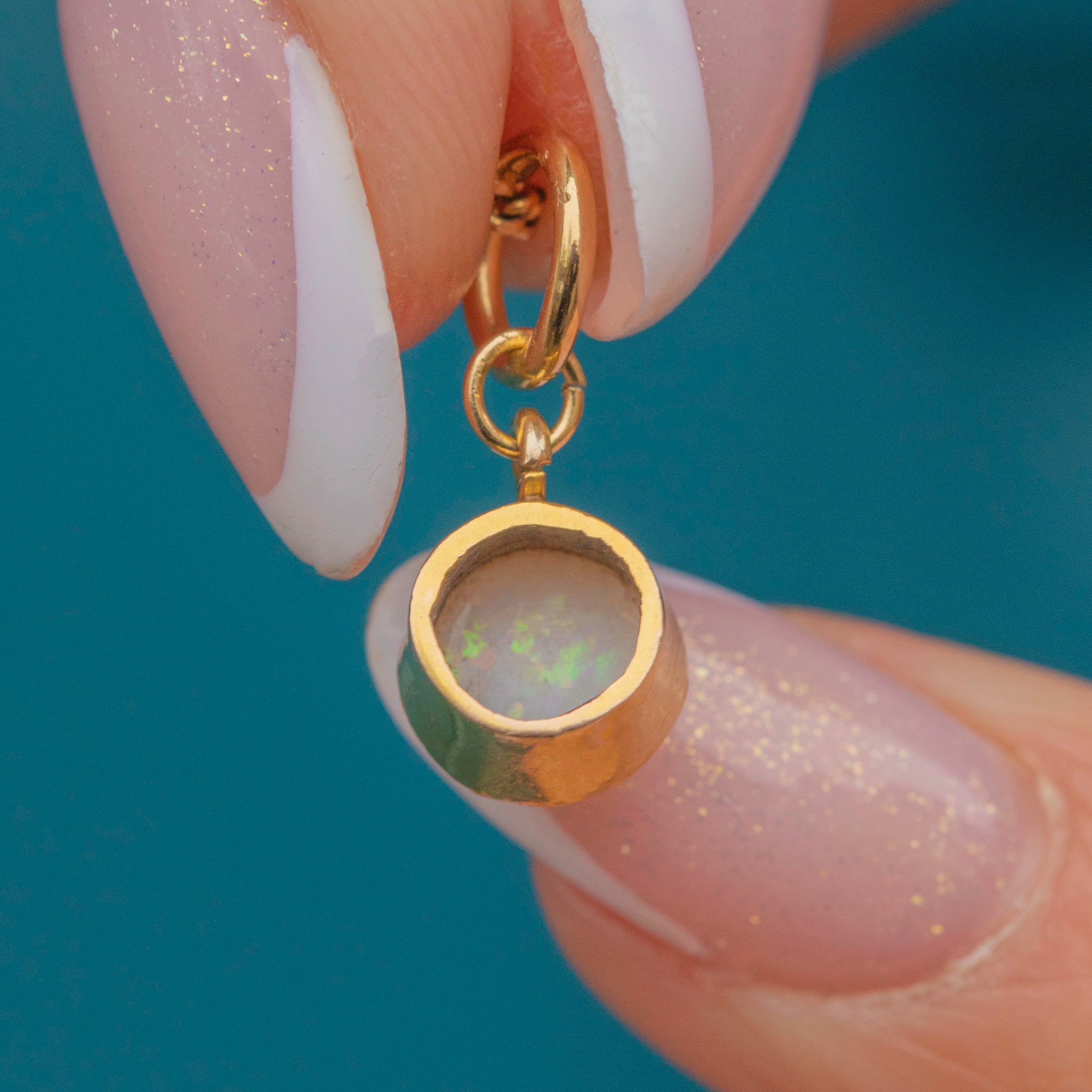 In her centre sits a petite Opal cabochon, with a creamy iridescence, radiating flashes of bright green and orange as she catches the light. The Opal is set within a buttery yellow 9ct Gold bezel, providing a lovely warmth to the charm.