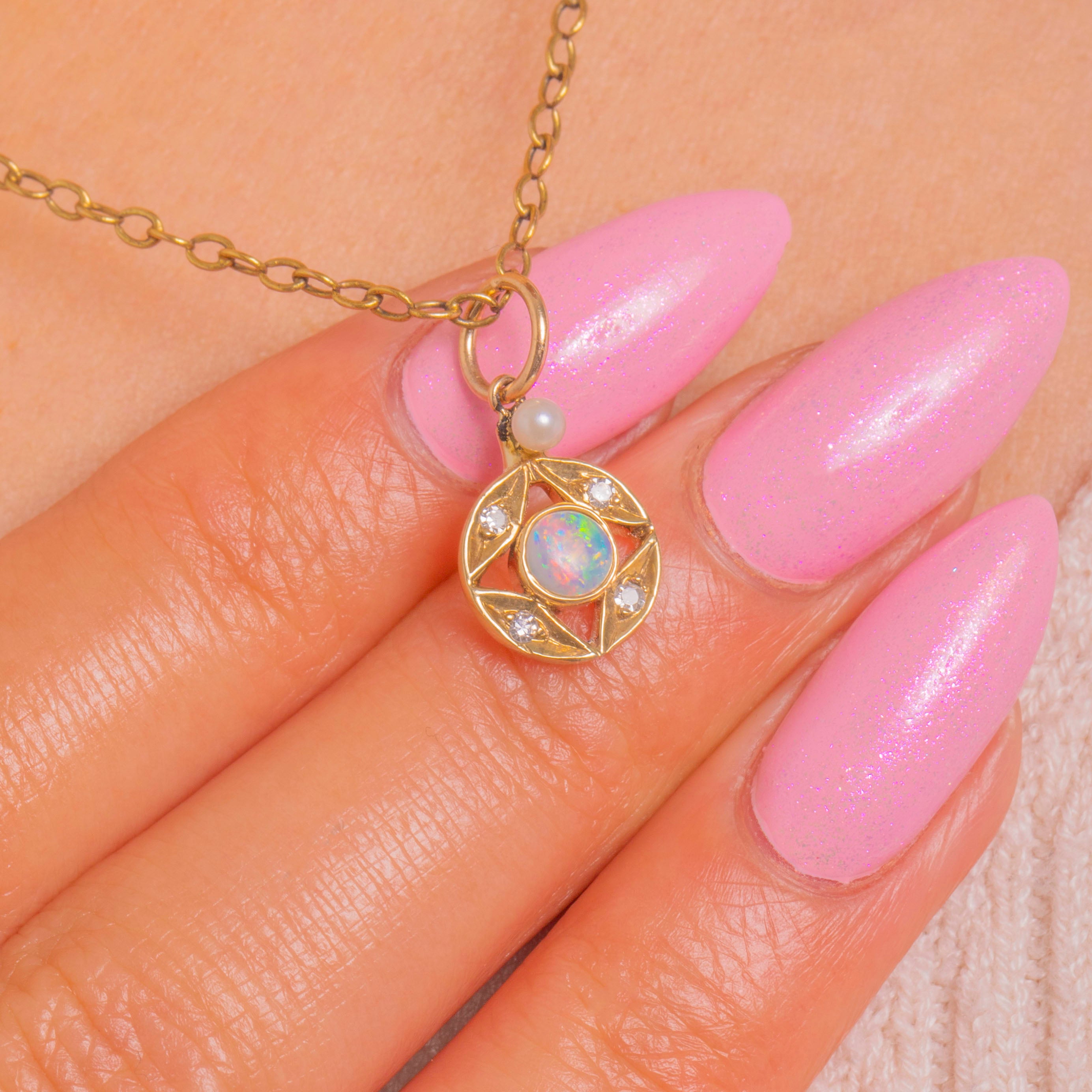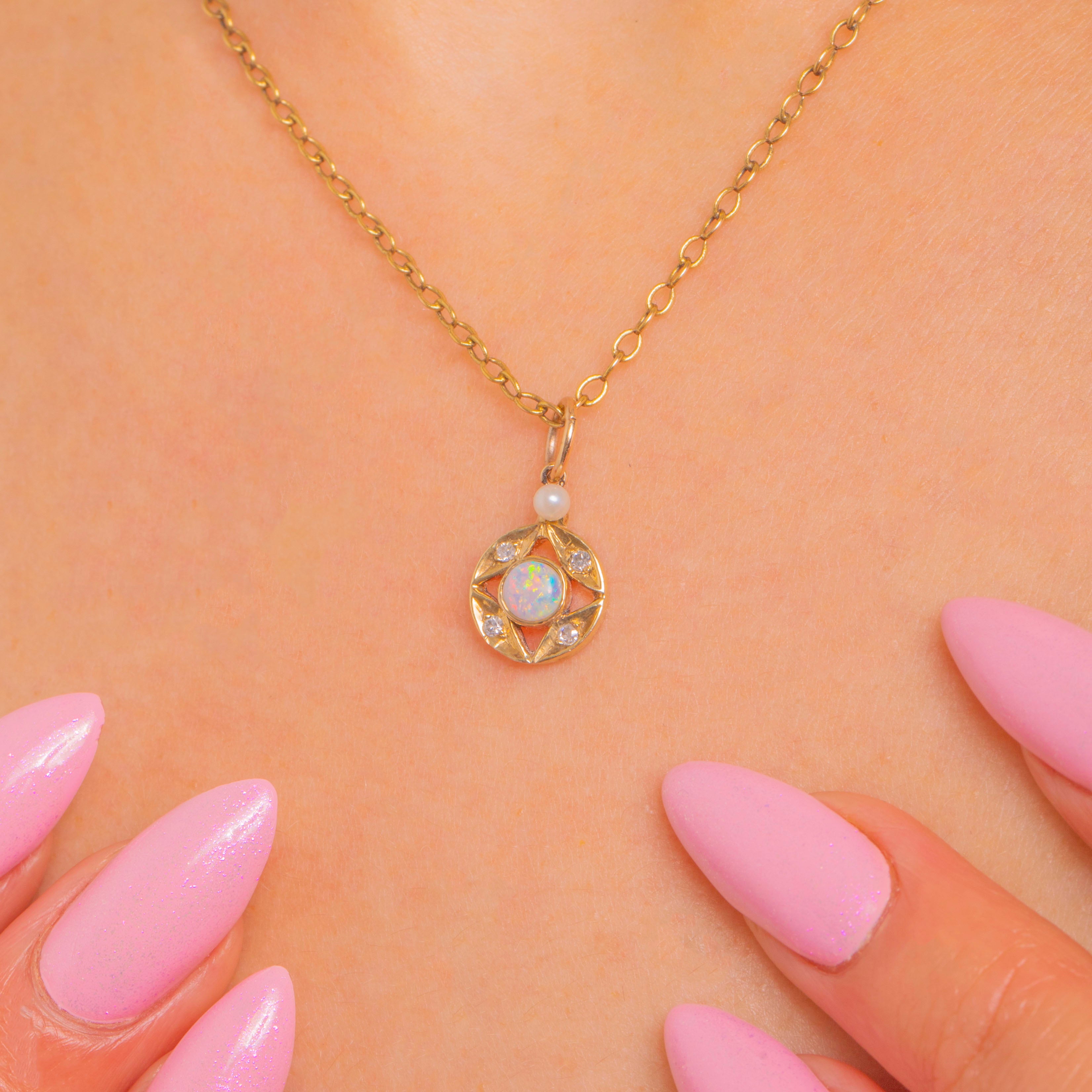 EXCELLENT: The Opal is smooth and lively, the Diamonds bright and secure, and the Pearl displays a pleasing lustre. The Gold shows minimal surface wear with crisp openwork and a secure bail. Overall beautifully preserved with light wear consistent with age.