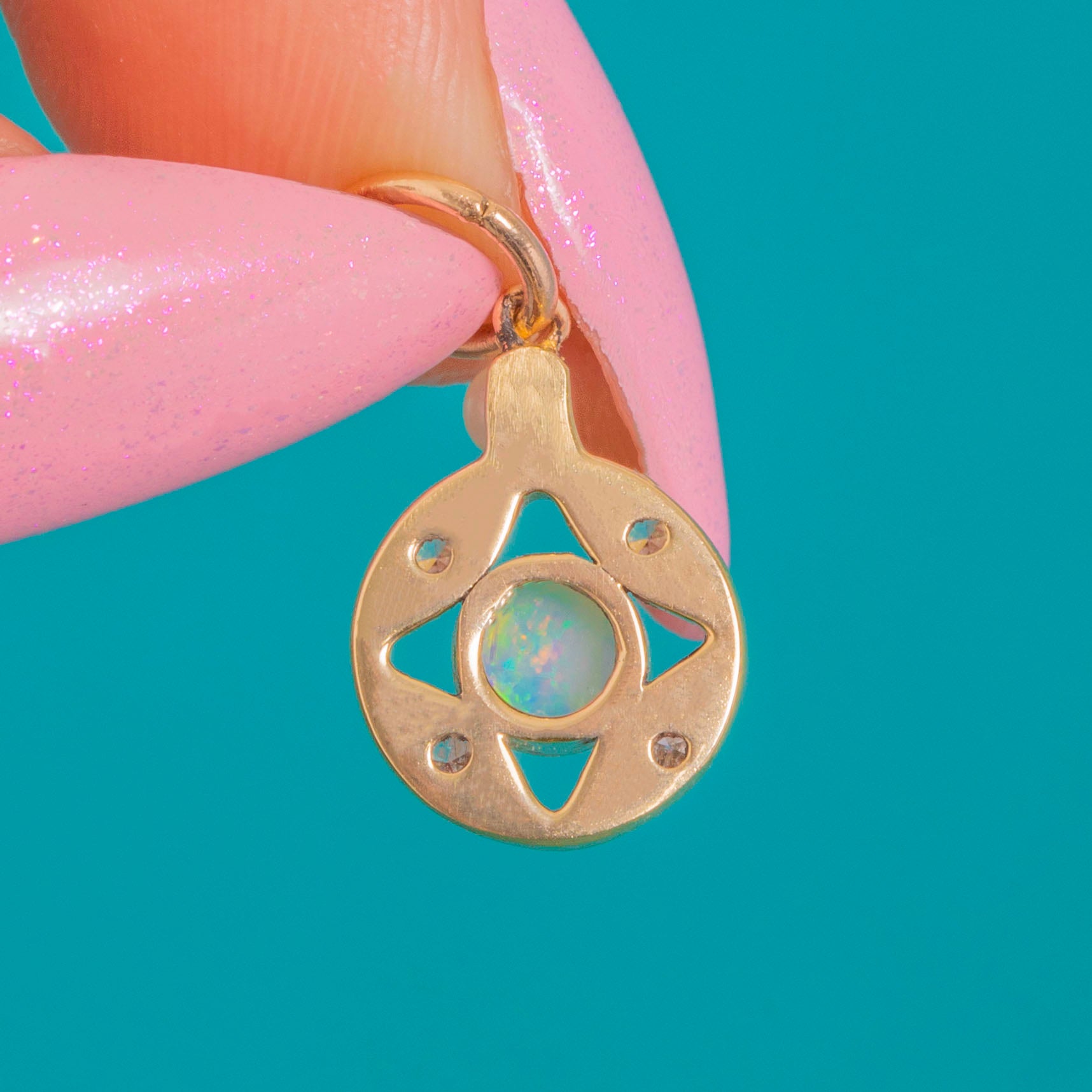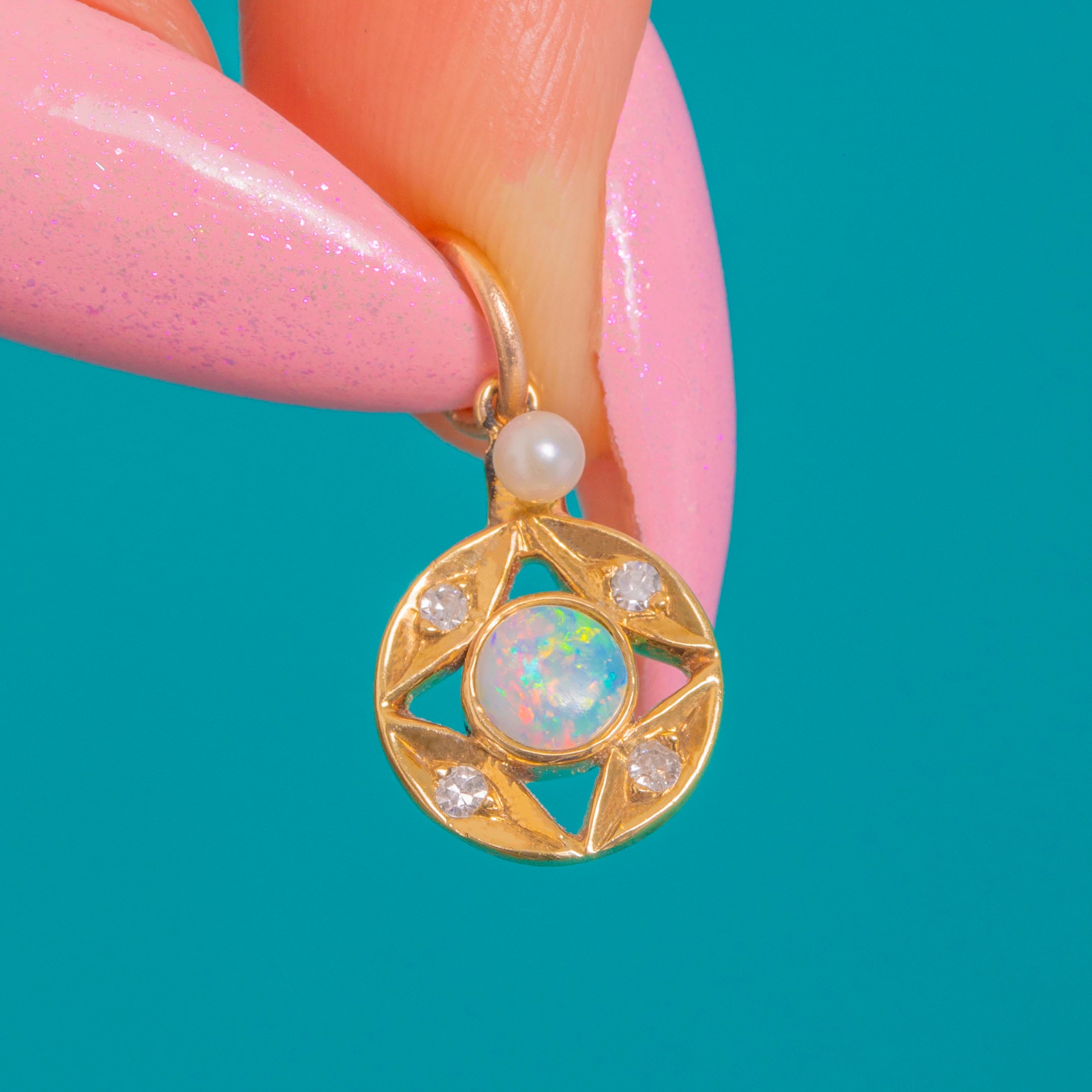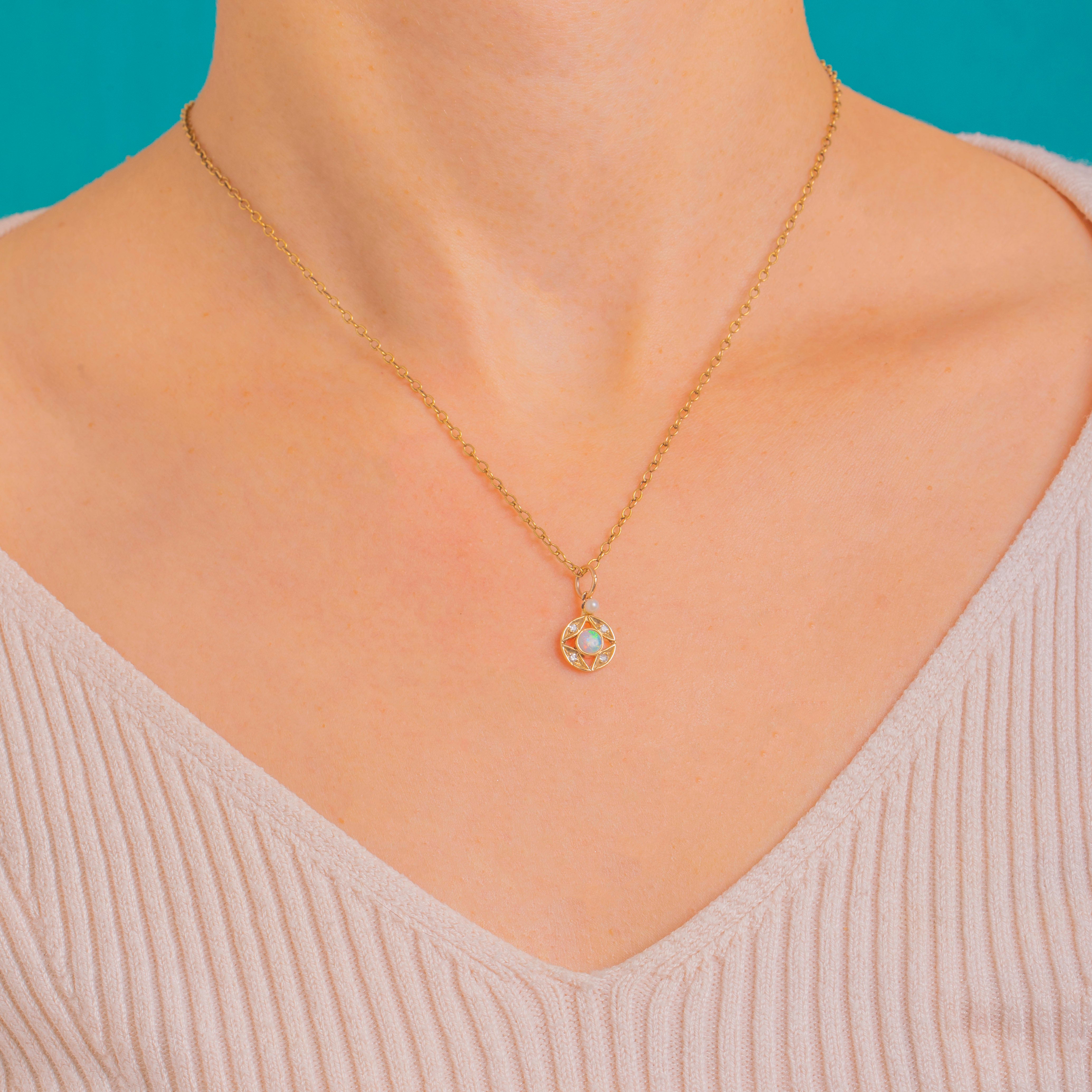 A petite Art Deco charm with starry allure, crafted in 9ct Gold and shaped as an openwork circle that draws the eye to its luminous Opal centre. The Opal’s gentle play-of-colour is framed by four twinkling Diamond accents, while a delicate Pearl set at the bail adds a final touch of softness and grace.