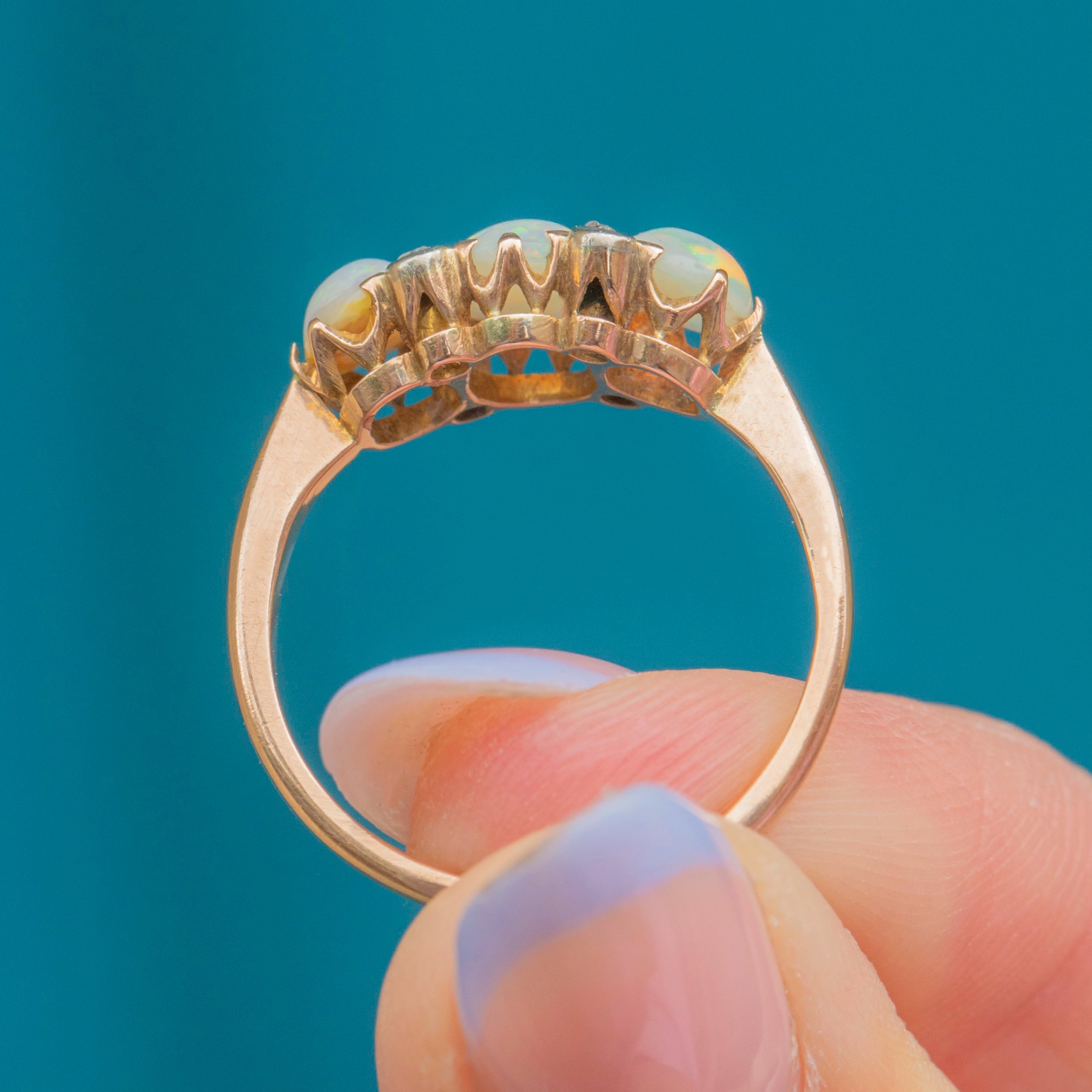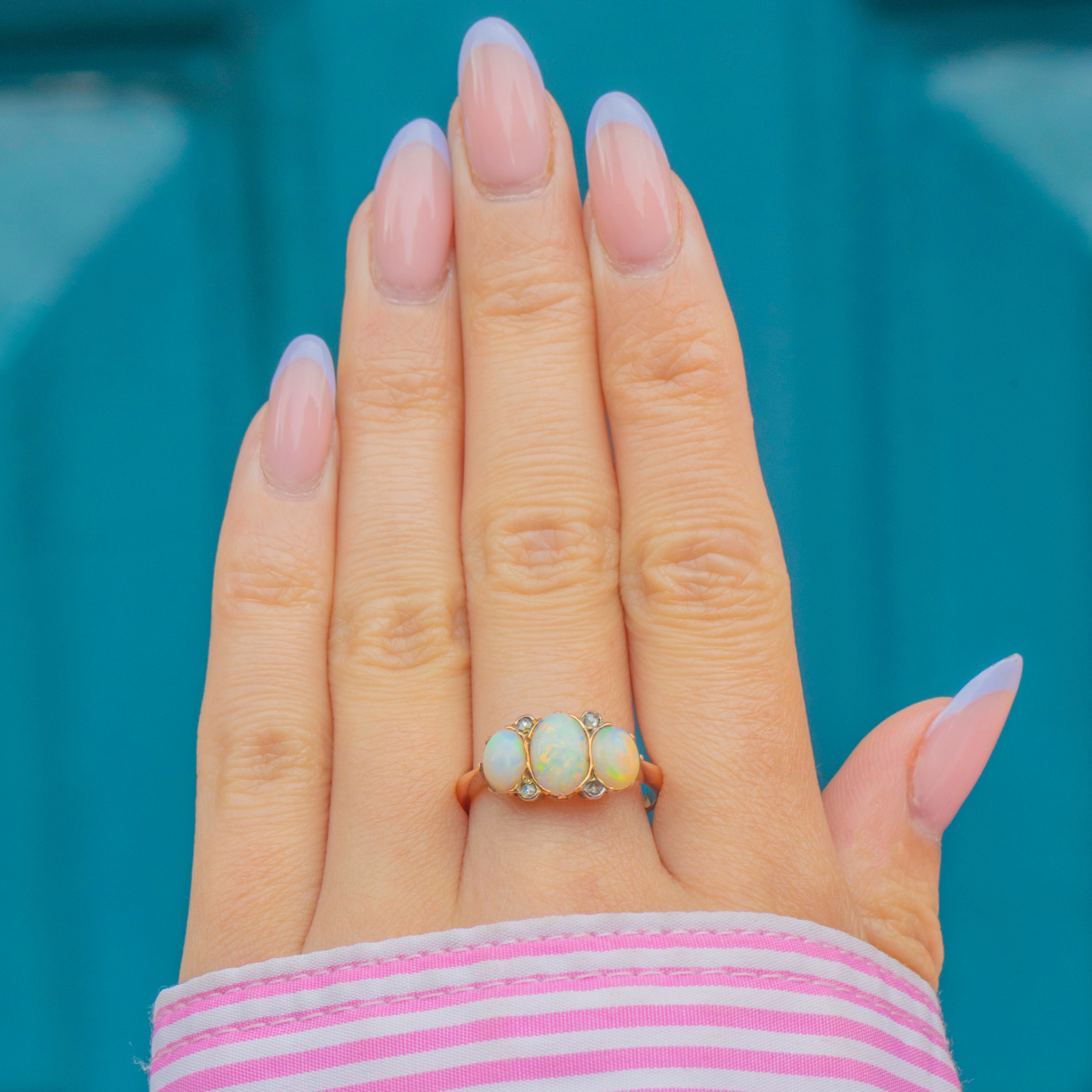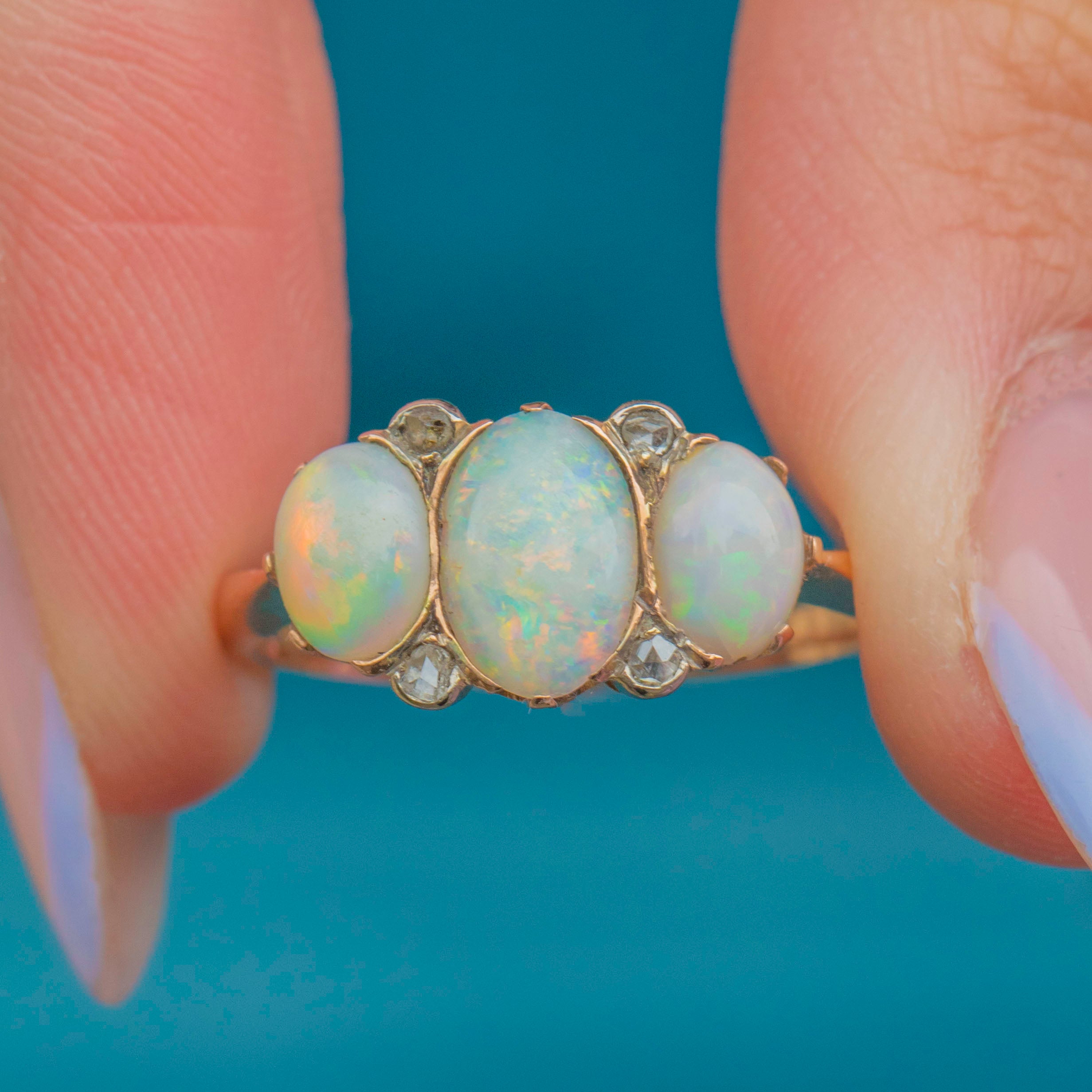 VERY GOOD: This antique 9ct Gold Opal Diamond trilogy ring is in very good condition. The Gold is bright and buttery with only minor surface wear throughout, and the band robust, promising confident wear. The gemstones are all present and securely set, and although the Opals have some mild surface wear, commensurate with age, they still have a fiery play-of-colour. If you have a penchant for exquisite jewels, this Victorian Opal ring is a must for your collection!