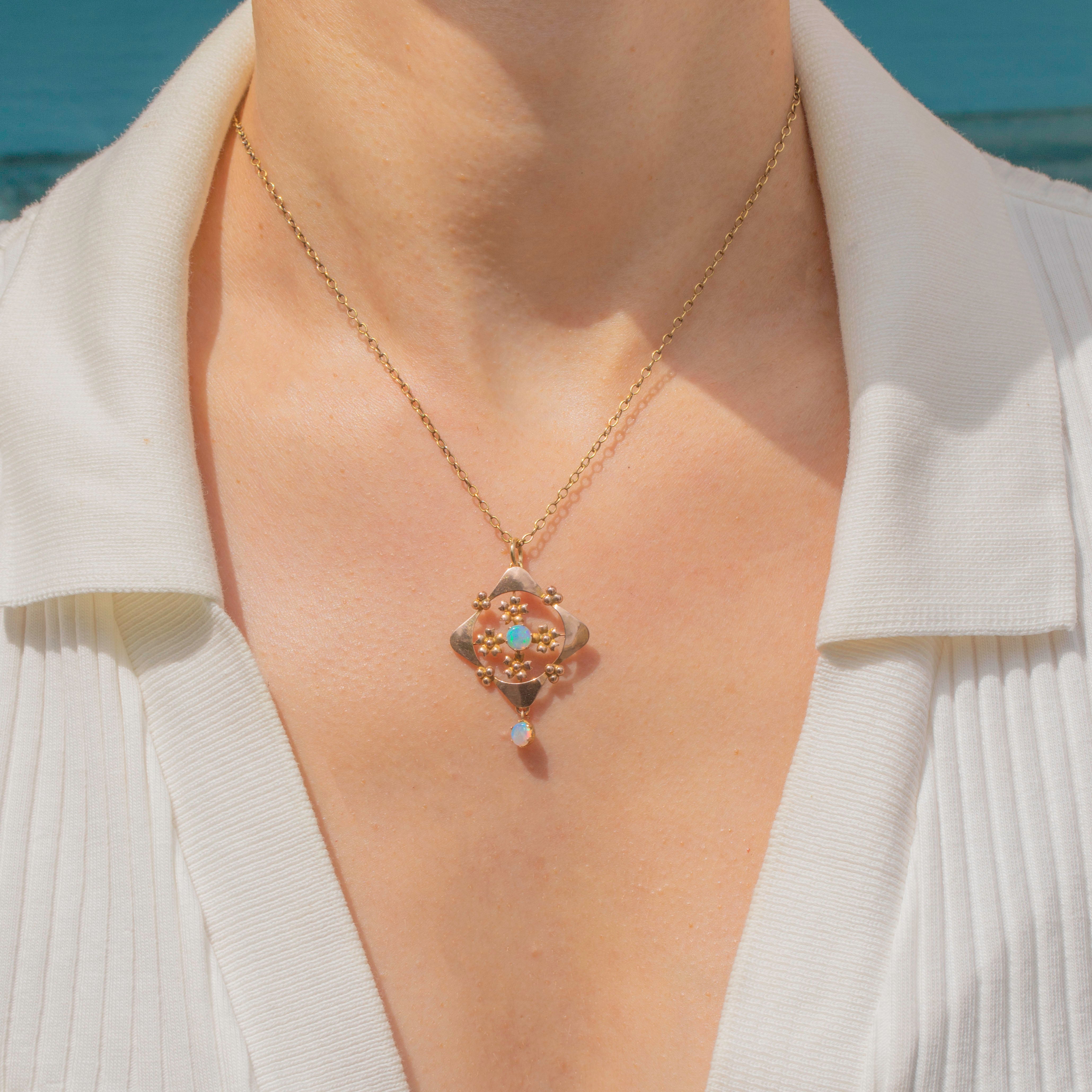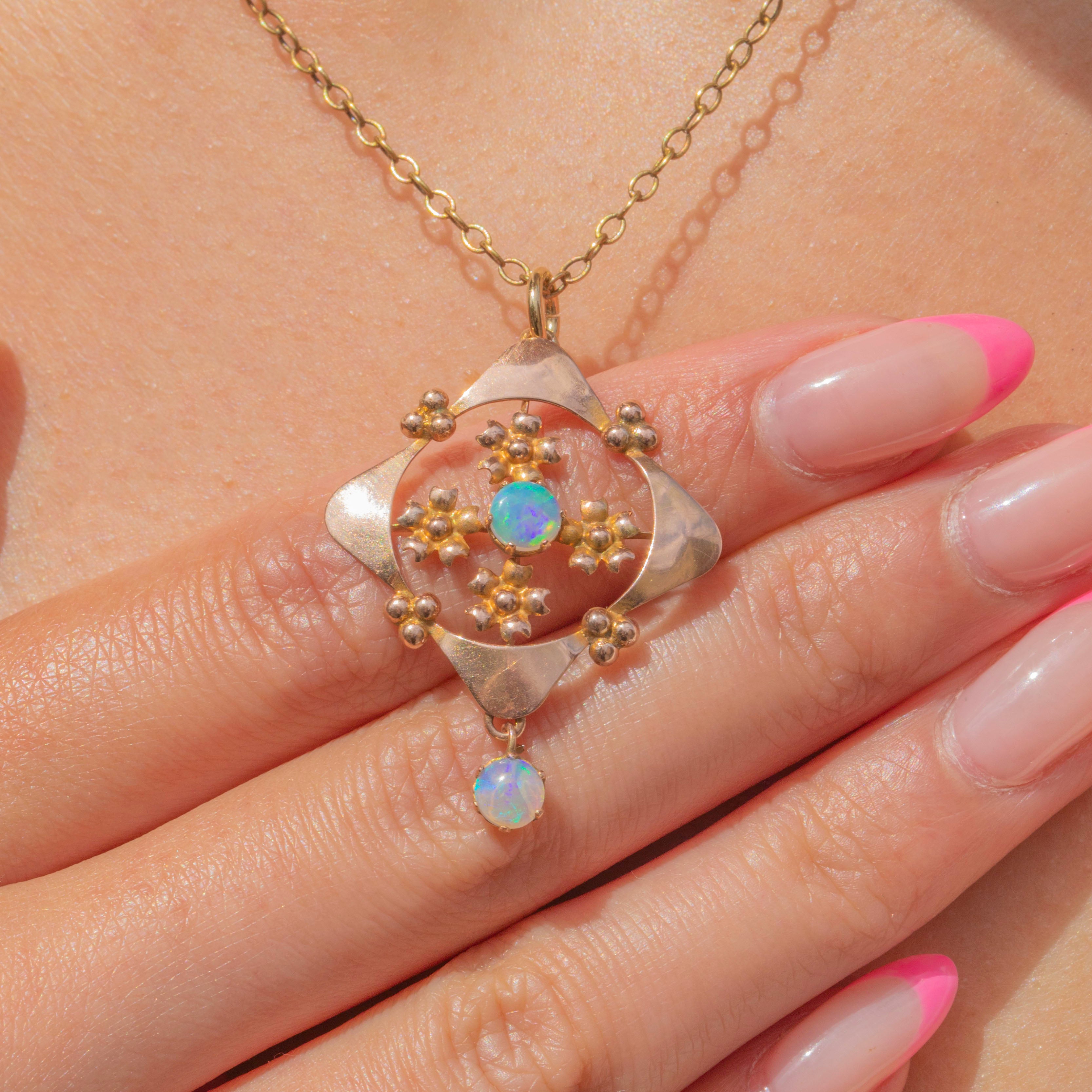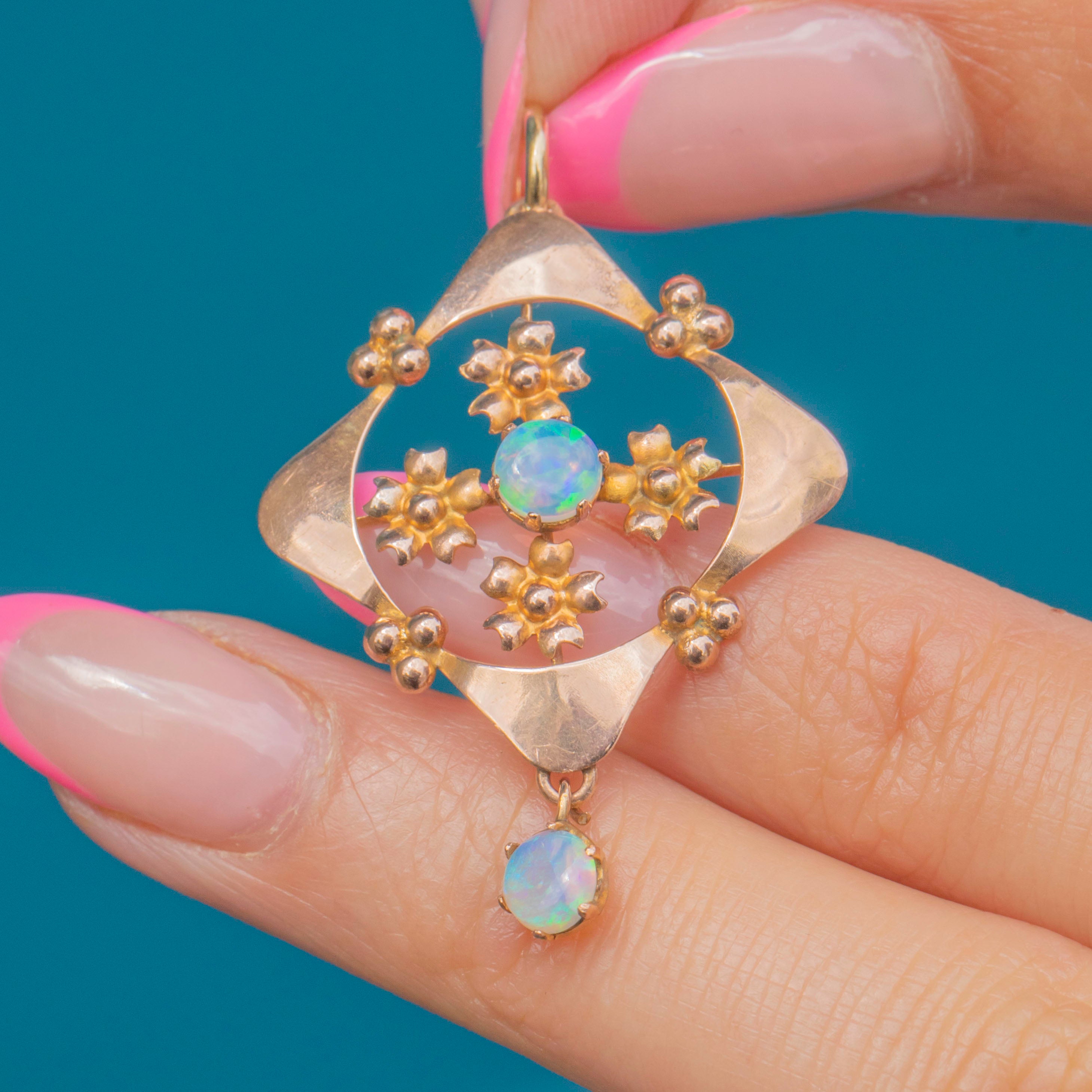 VERY GOOD-EXCELLENT: This adorable antique 9ct Gold Opal floral pendant is in great condition. Each Opal is radiant and sits securely in its settings. She has been crafted meticulously, with the Gold remaining glossy and lustrous. There are some spots of discolouration to the Gold on the back of the pendant, though this cannot be seen when wearing. With a securely soldered jump ring, this Edwardian pendant can be worn with utmost confidence.
