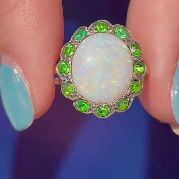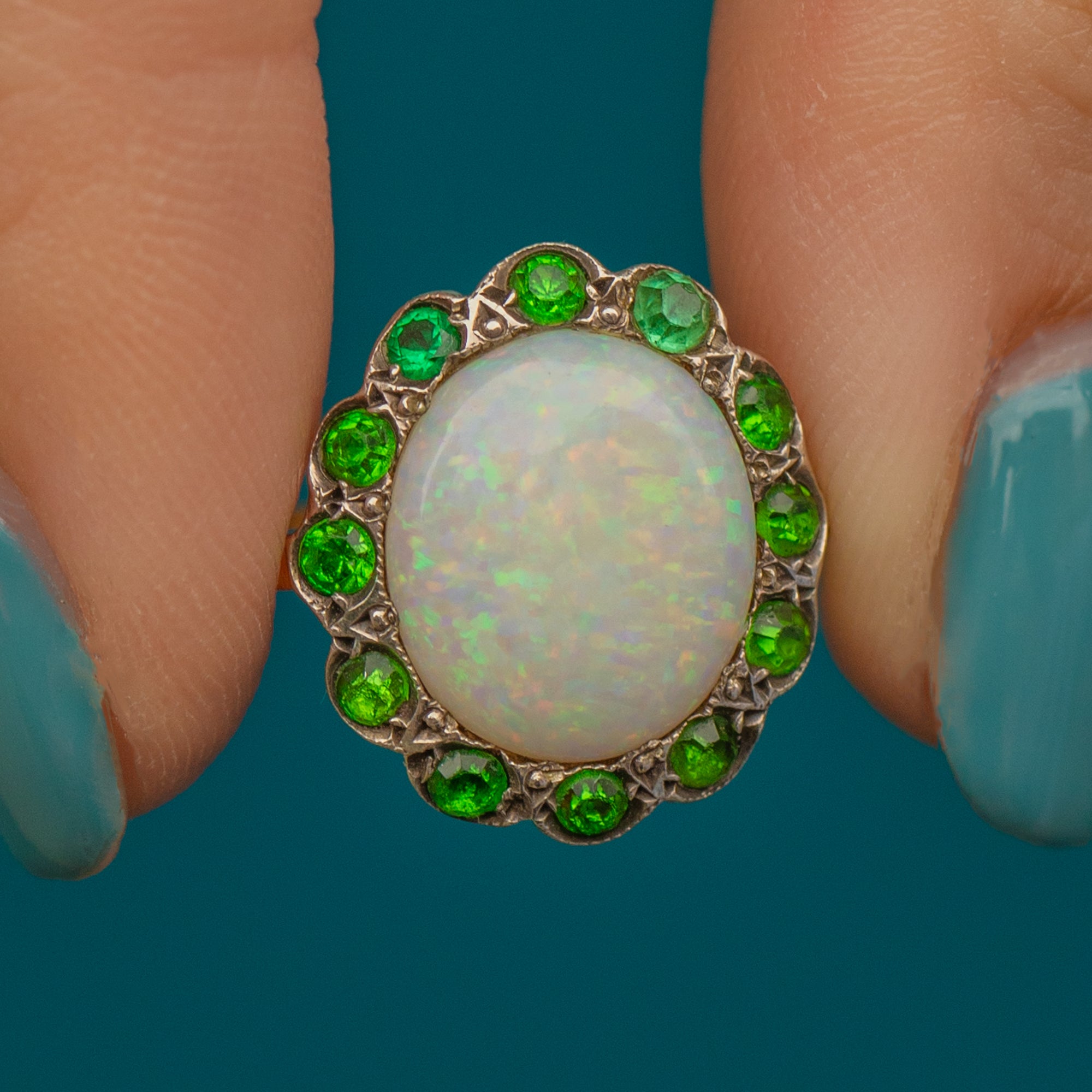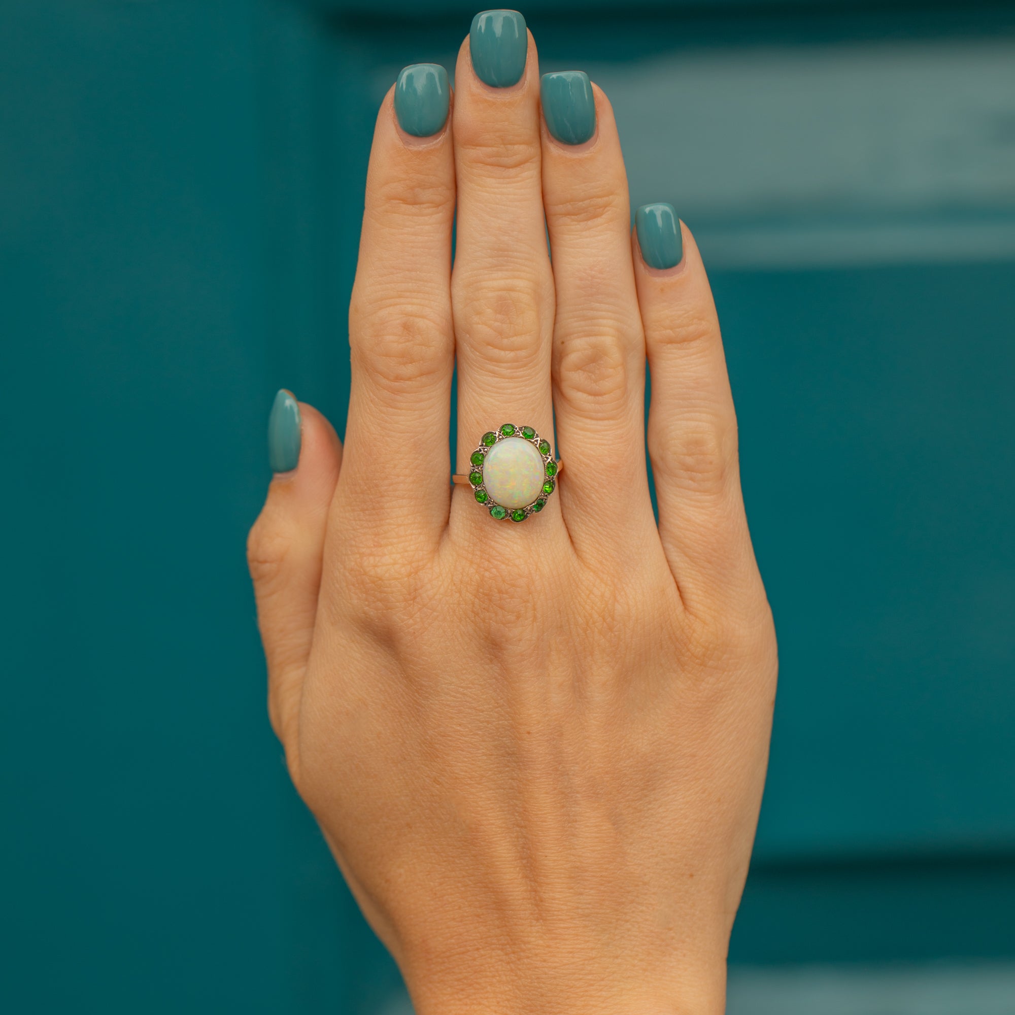If you're looking for something one-of-a-kind, look no further than this antique 9ct Gold Opal and Paste cluster ring! Homing a 1.80ct Opal cabochon with a colourful core layered with flashes of lime and pops of peach, she is haloed by green Paste petals for an enchanting touch.