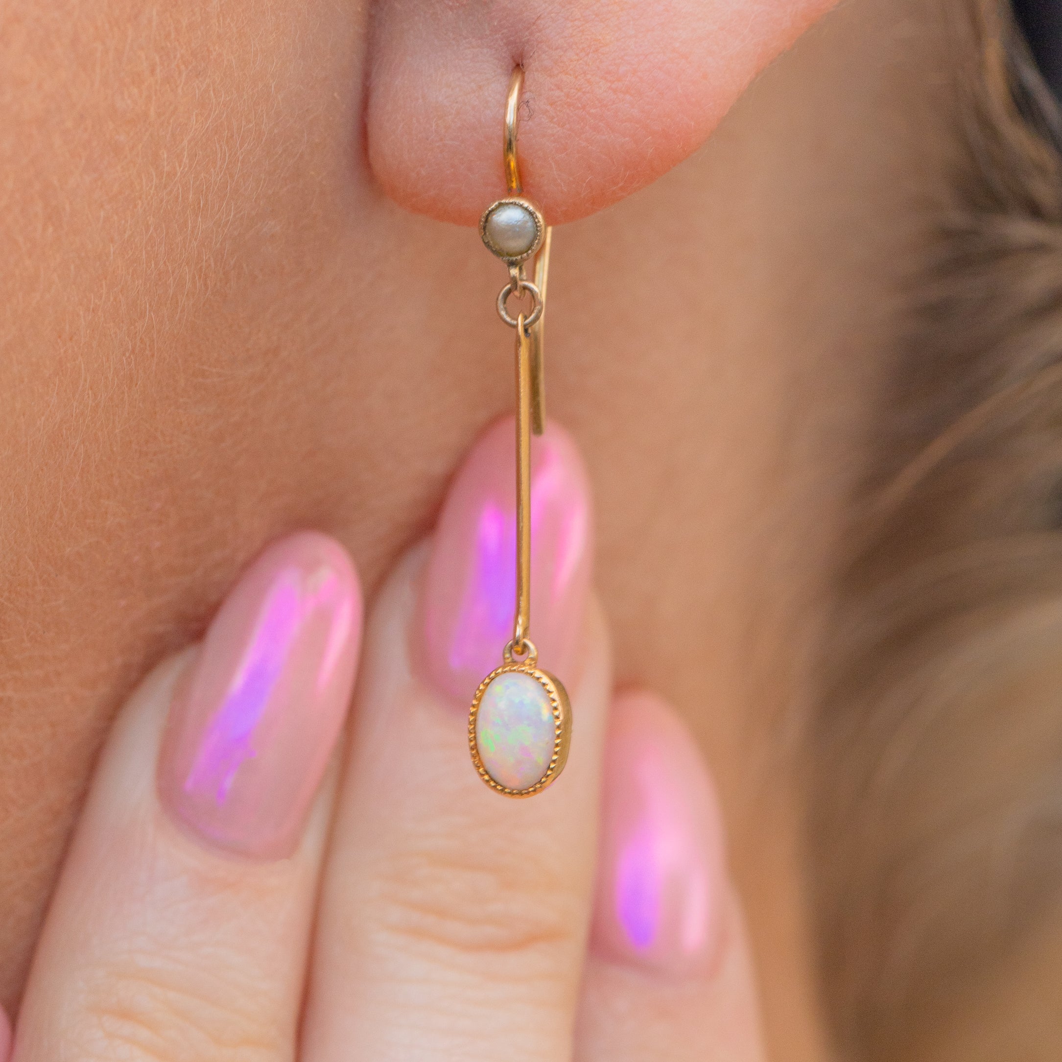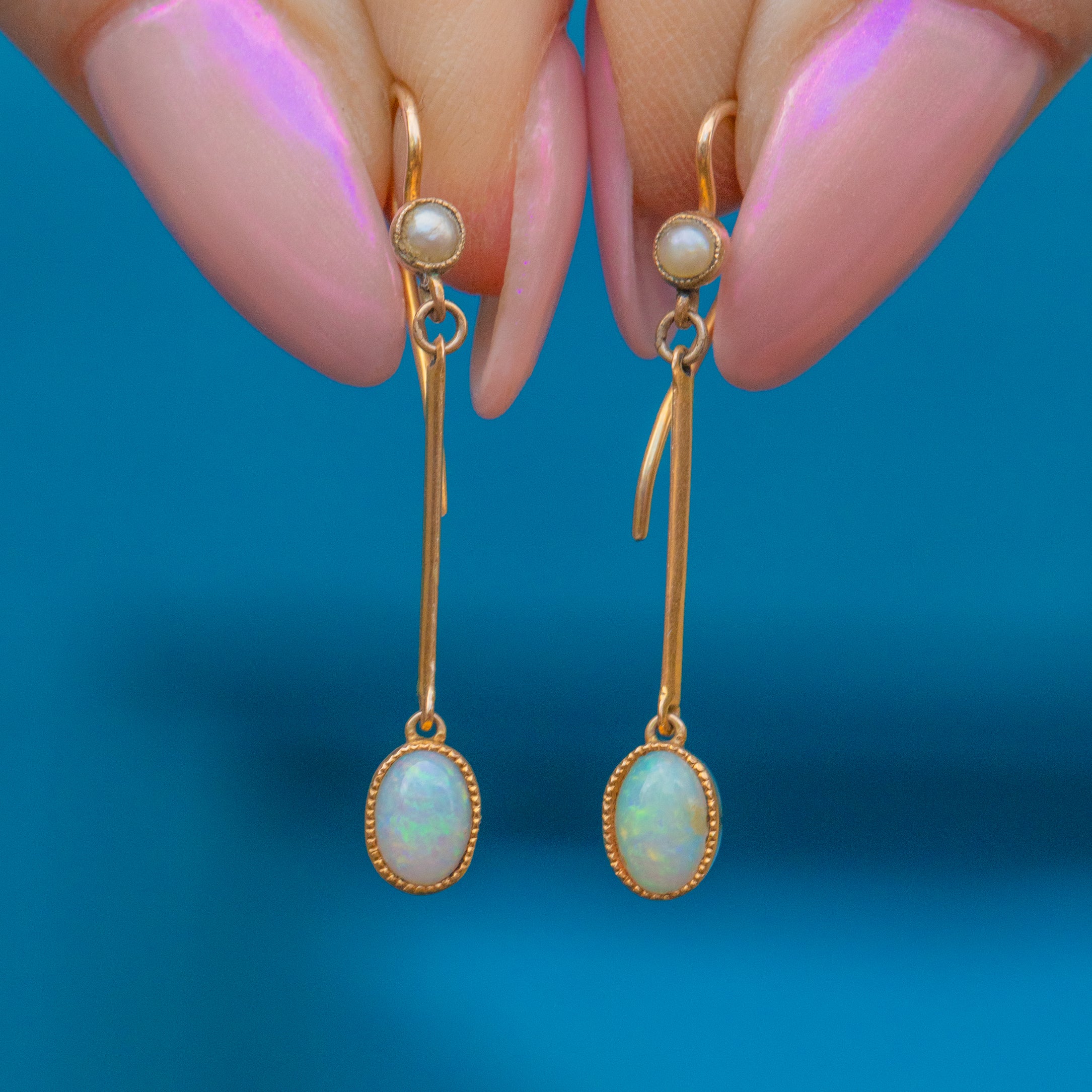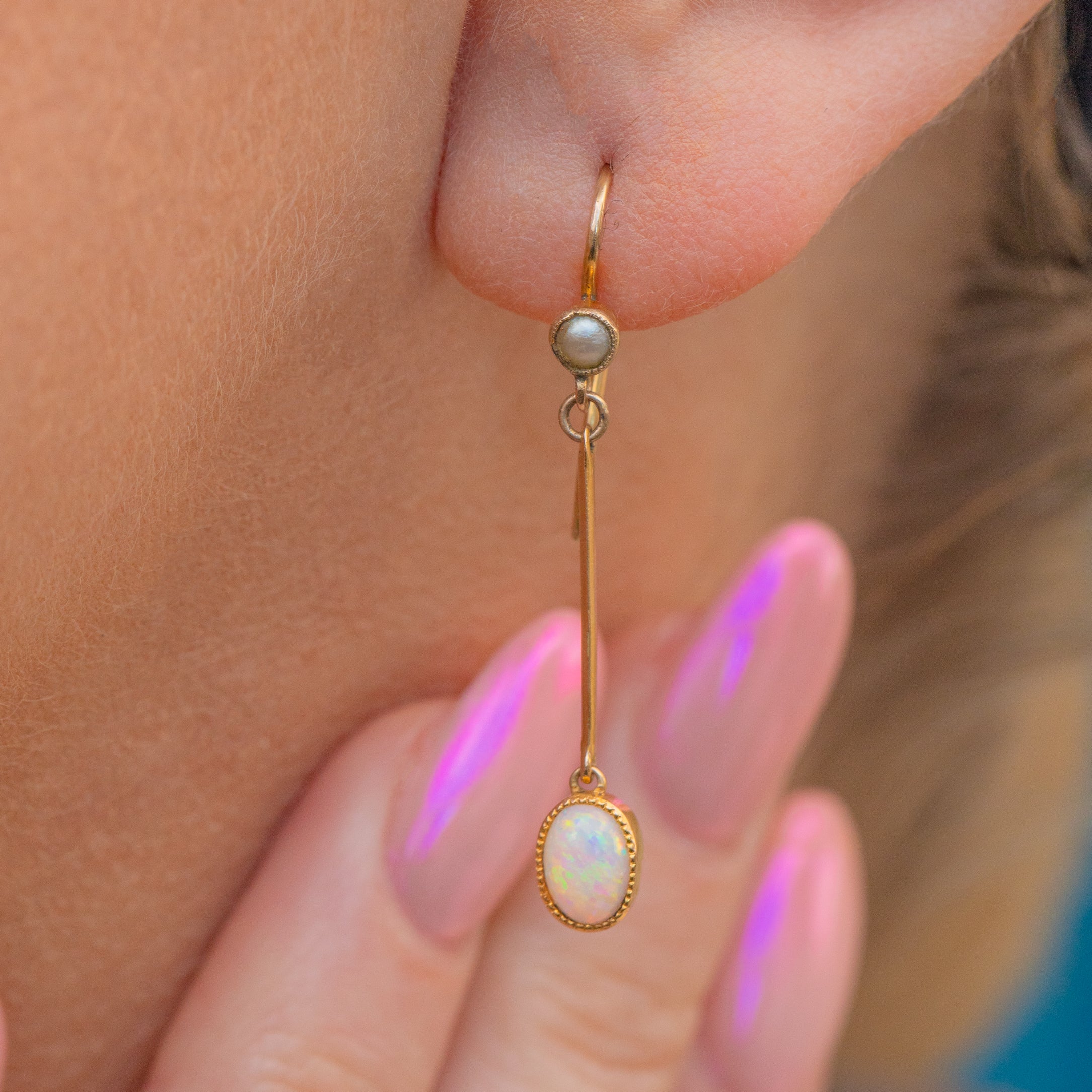 Antique 9ct Gold Opal Pearl Drop Earrings