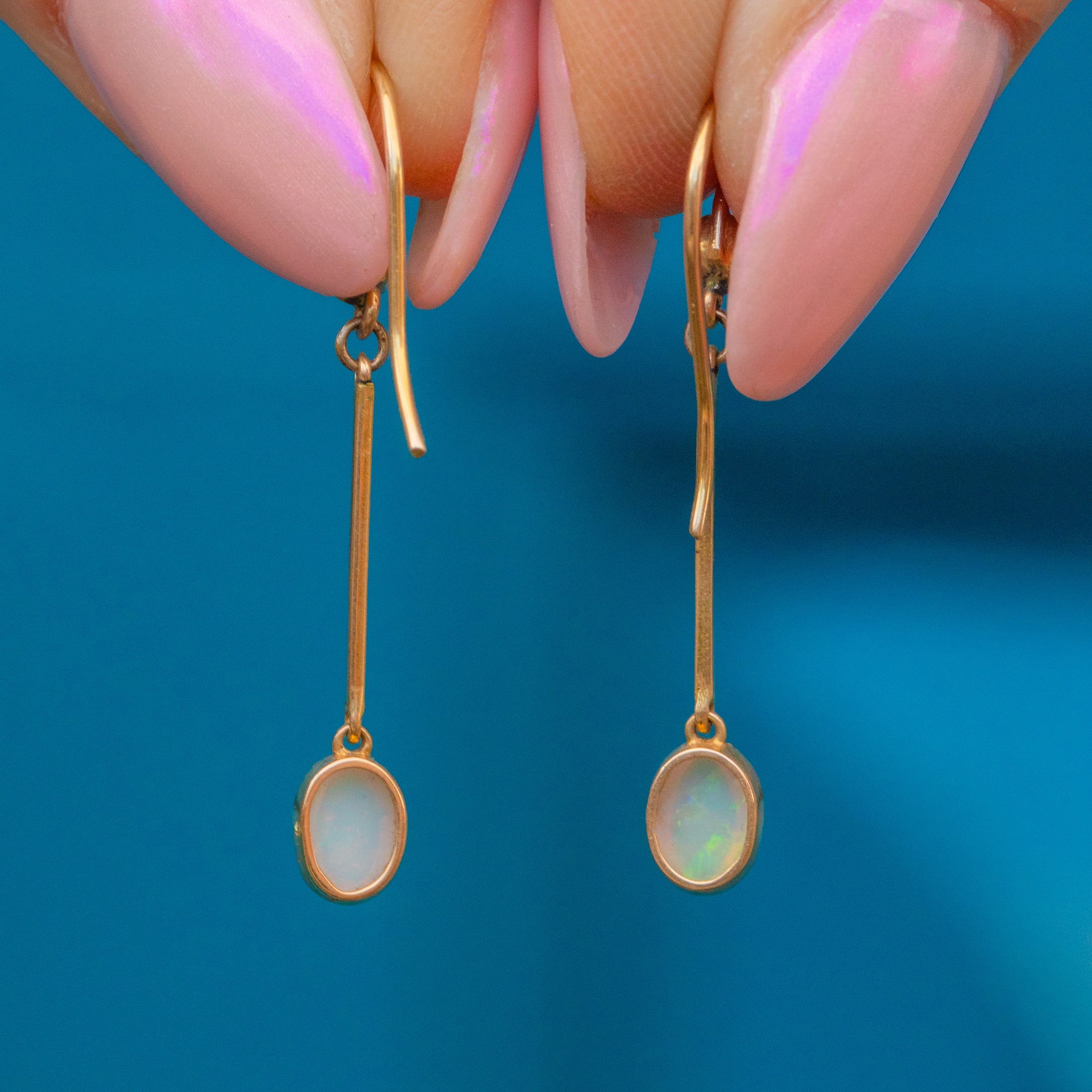 Each bezel Opal is smoothly domed, displaying vivid pops of pinks, greens, and yellows across its light blue core. The articulated components provide lovely movement, ensuring that these Edwardian earrings don't go unnoticed as they shimmy in the light!
