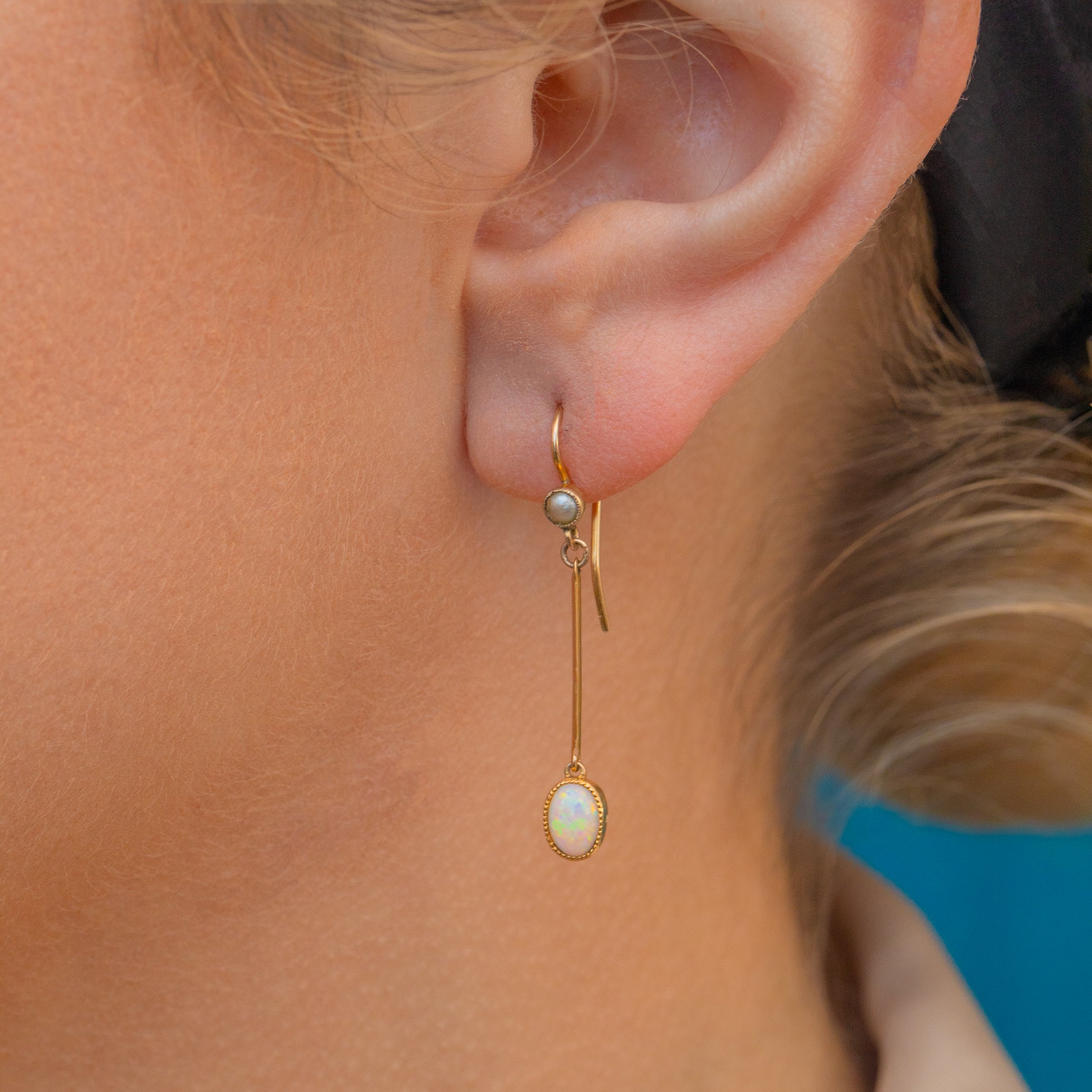 These antique 9ct Gold Opal Pearl drop earrings will bring undeniable elegance to your lobes! Finely crafted from luminous 9ct Gold, each earring boasts a silky Pearl at the base of the hooks, suspending a vibrant Opal cabochon at the base.