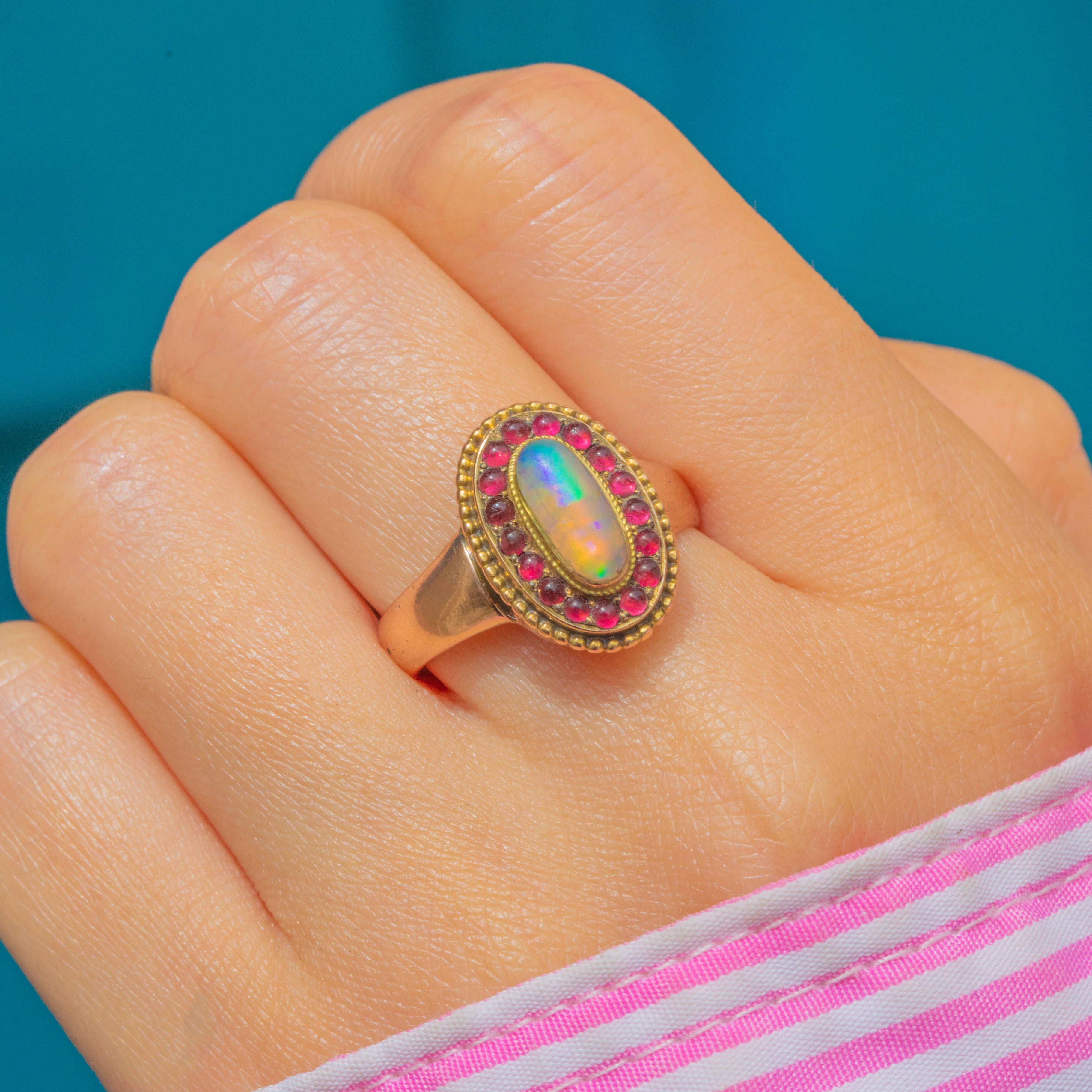 This striking and unusual Victorian ring is centred by a radiant Opal cabochon, projecting hypnotic blue, green, and lilac hues, and is encircled by a halo of vibrant pink Paste gems!