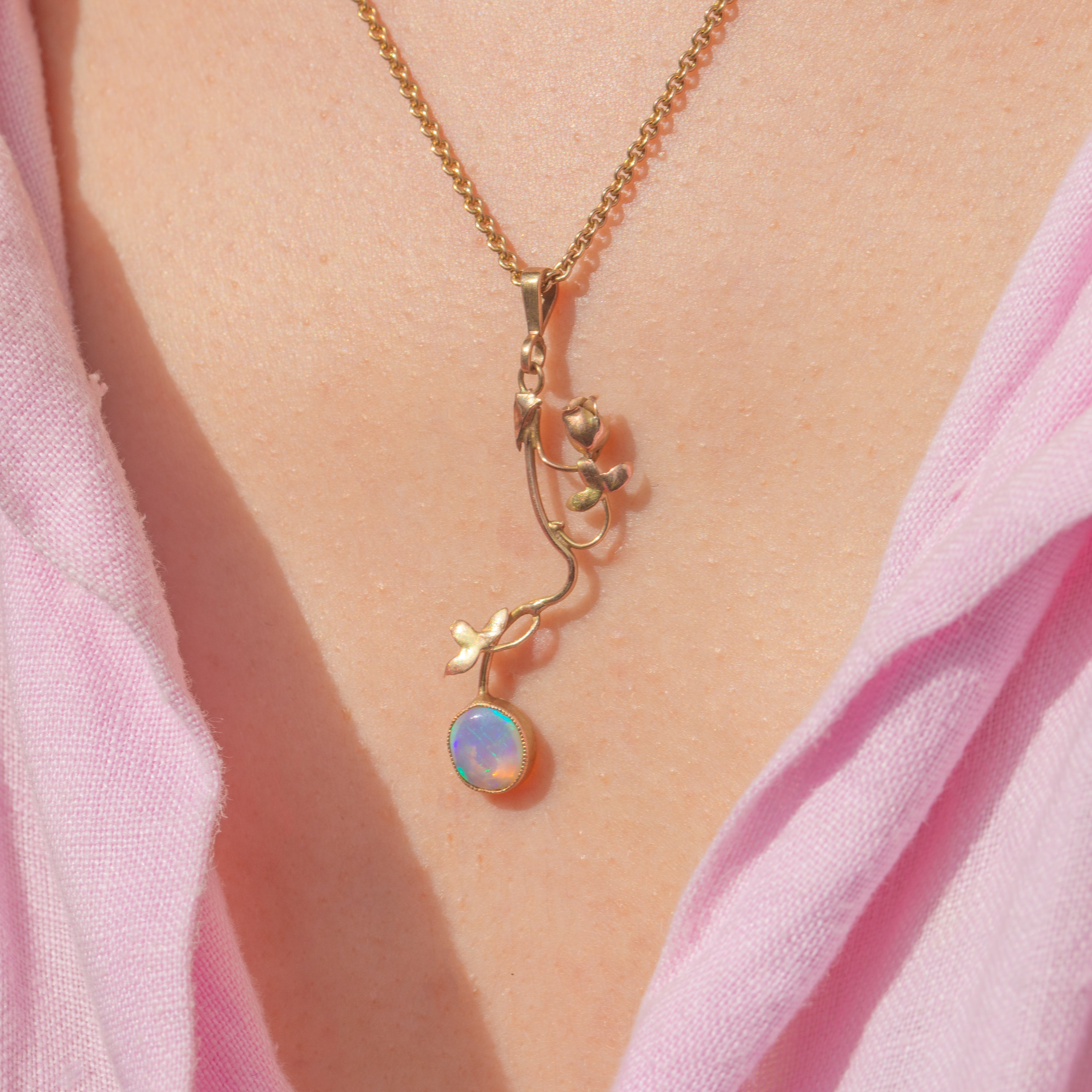 Antique 9ct Gold Opal Rose Pendant with 16" Chain