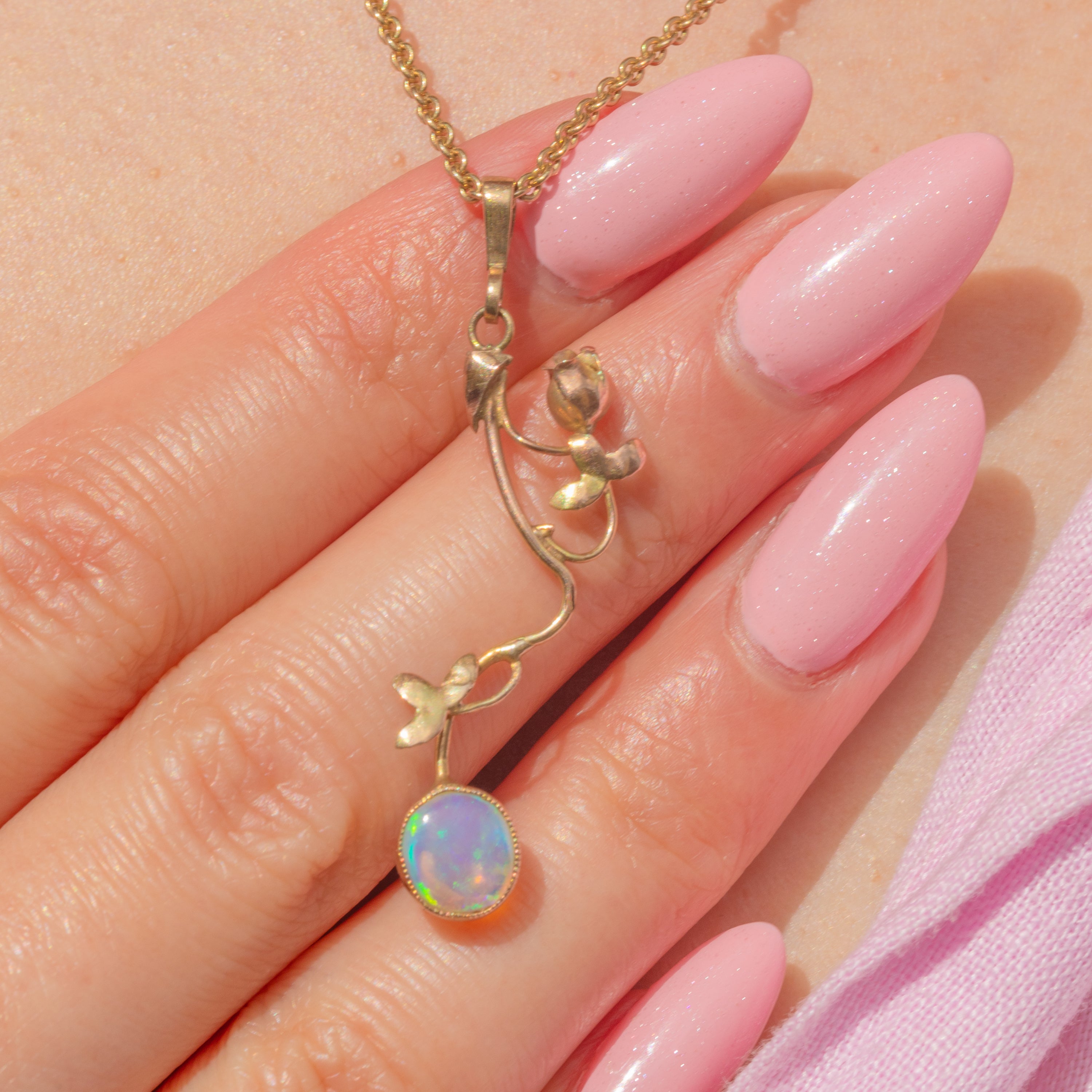 EXCELLENT: This antique 9ct Gold Opal rose pendant is in excellent condition, with beautiful rose detailing; there are no signs of wear or damage on the pendant or the Opal. Additionally, the chain is in excellent condition with a fully functioning bolt ring, allowing you to wear it with absolute confidence!