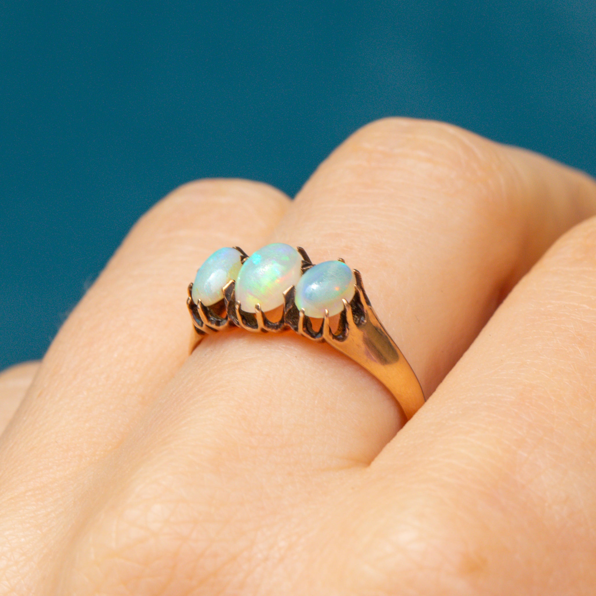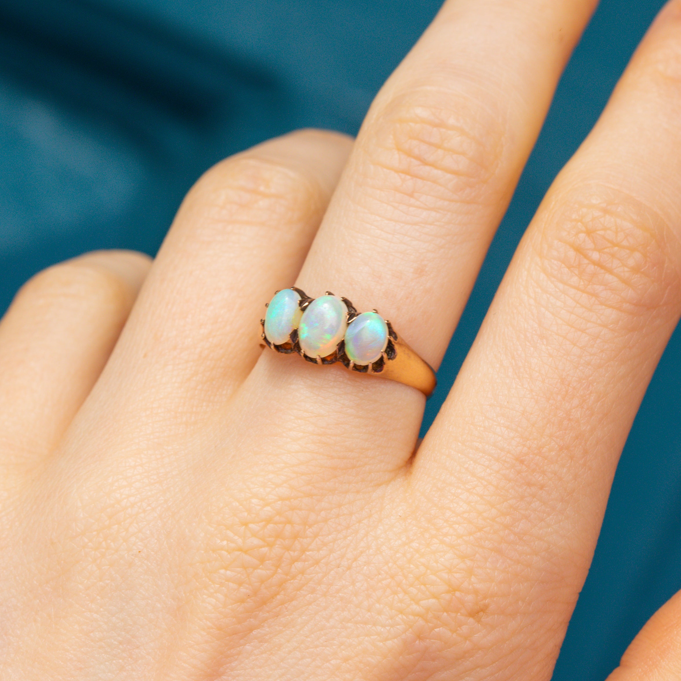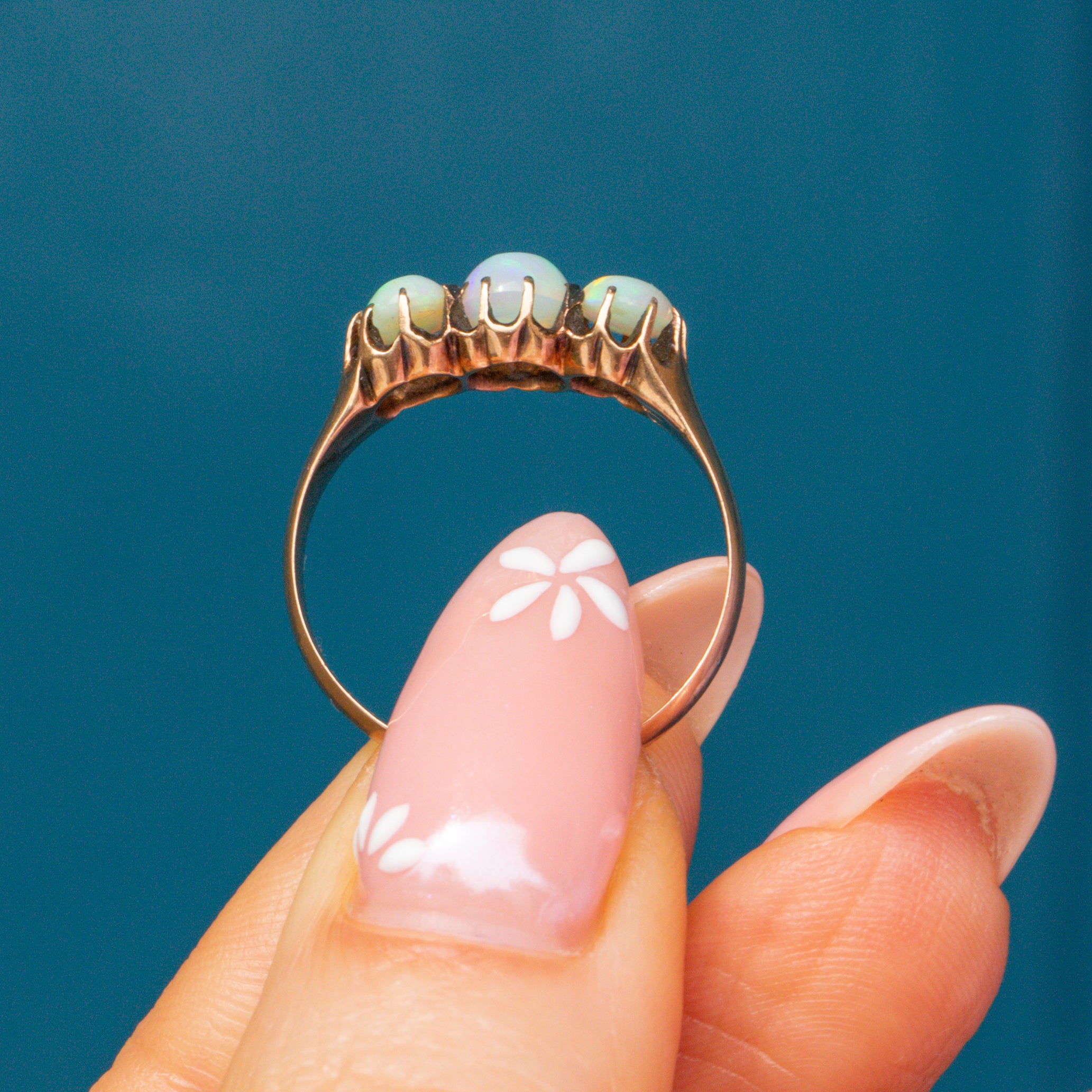 This antique 9ct Gold Opal trilogy ring is such a gorgeous find! Inlaid with three cabochon cut Opals that total to 0.80ct, this Gold ring provides gorgeous coverage on the finger.