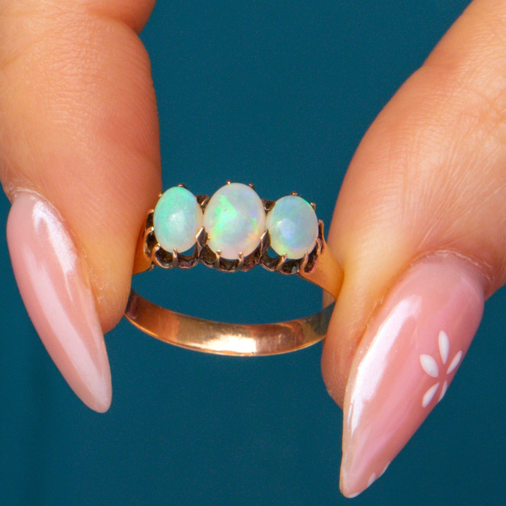 VERY GOOD. This antique 9ct Gold Opal trilogy ring is in very good condition. The Opals are so lovely, and securely set. The ring band is smooth, and wears super comfortably on the finger. There is some very light wear visible to the inside of the band commensurate with a ring of this age- there are two grooves on the inside of the band, but this is not visible when worn. There is a little scuff mark to the back of the band, but it's nothing that affects its overall appeal! The Opals are extremely vivid, solid and completely natural.