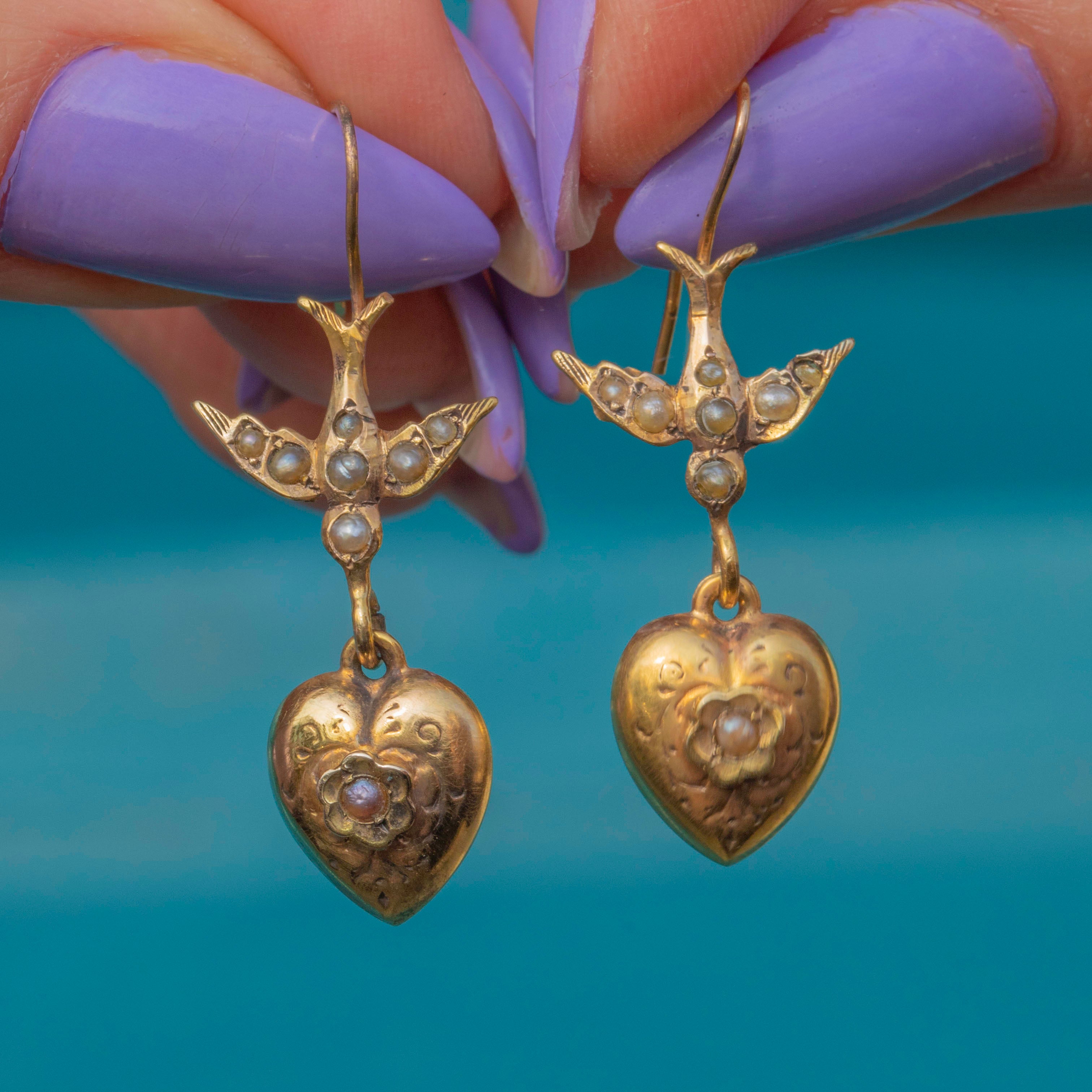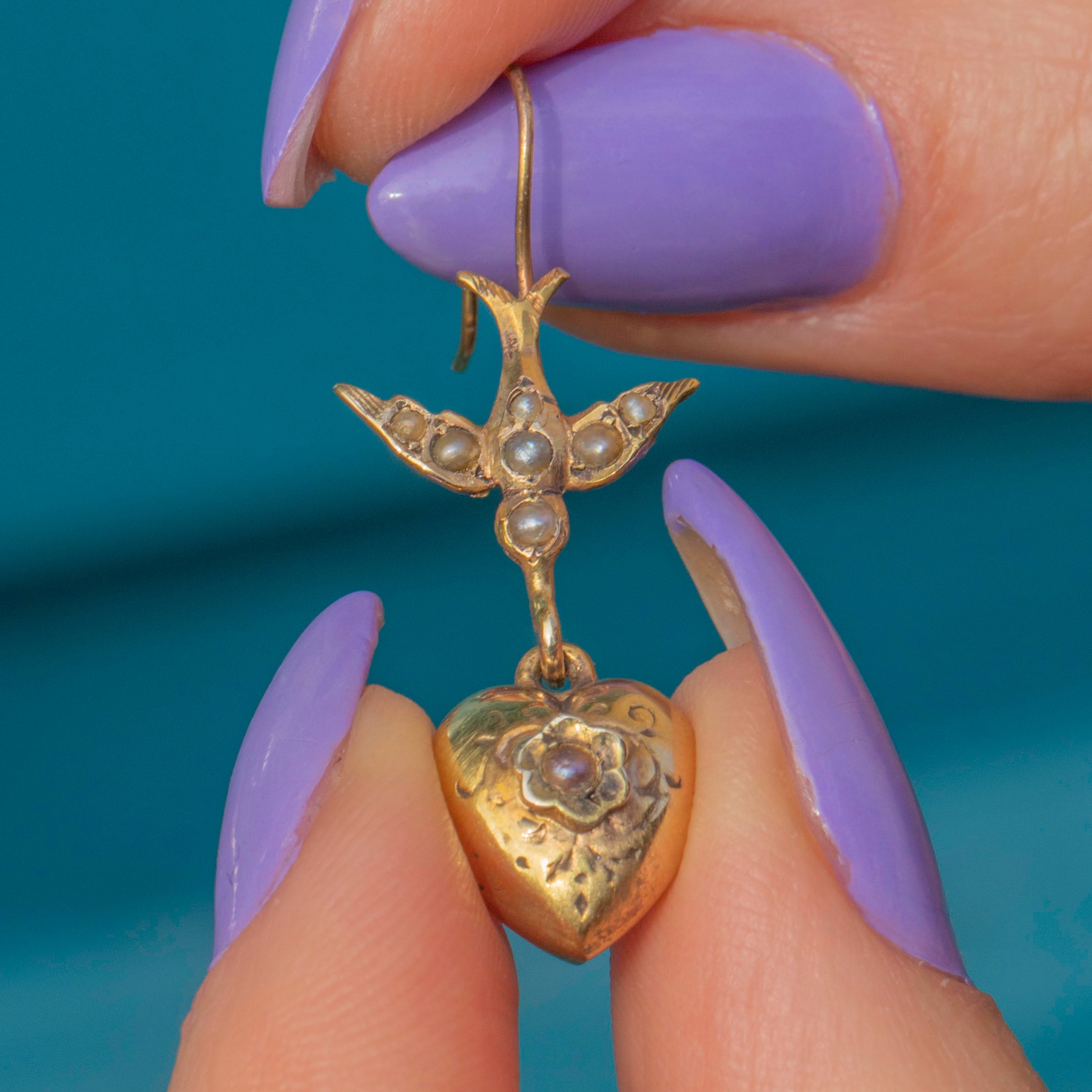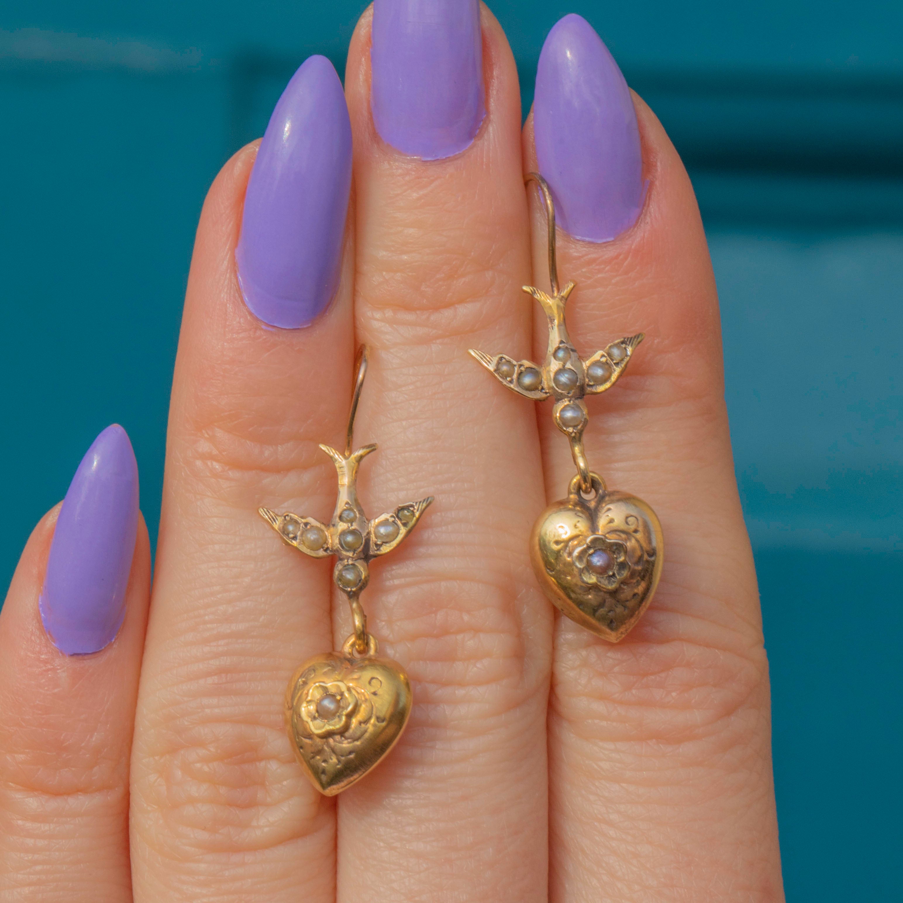 Crafted from buttery 9ct Gold, each drop earring features a dainty swallow suspended above an intricately engraved heart. Each quintessential Edwardian motif is detailed with dainty seed Pearls, adding a lovely antique charm to these earrings.