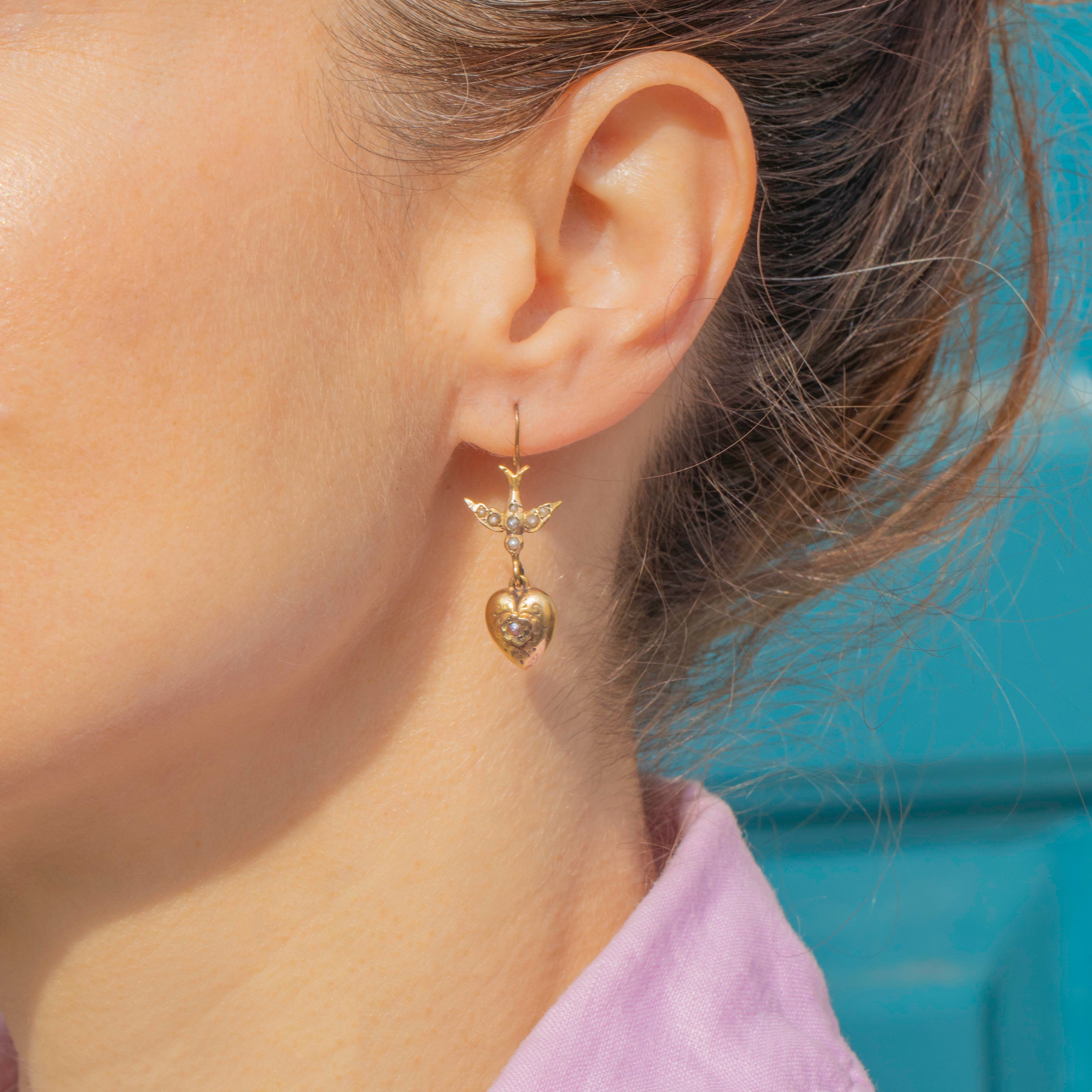 VERY GOOD: These antique 9ct Gold swallow heart drop earrings are in very good condition. The earrings are meticulously crafted with secure hooks, providing comfortable and secure wear. The seed Pearls have lost some of their lustre, commensurate with age, but each one is original to the piece and securely set. In very good condition, these earrings are a must-have!