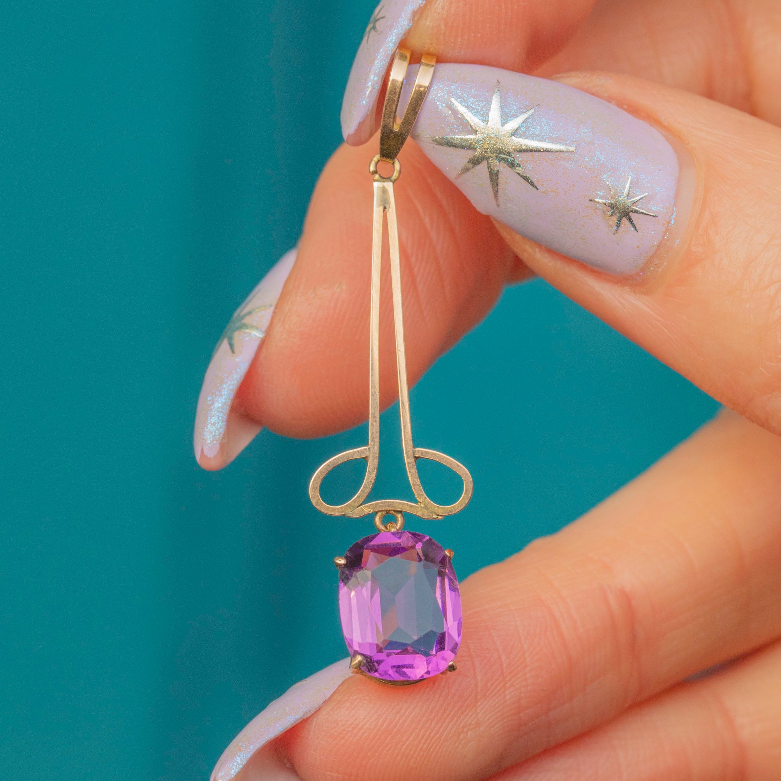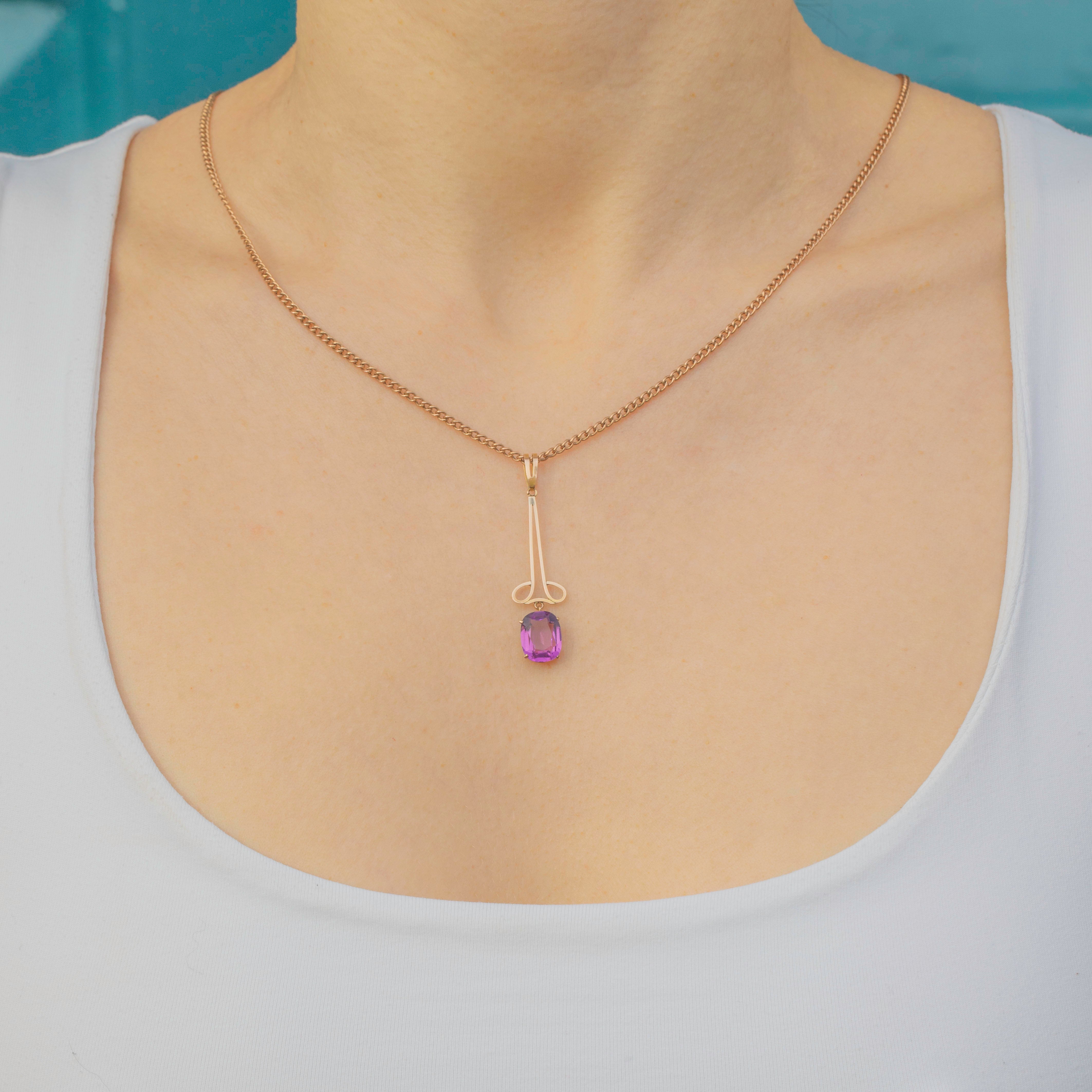 EXCELLENT. This antique 9ct Gold pink Amethyst drop pendant is in excellent condition. The Gold is bright and buttery and the pendant has kept its form well, with no dings or scuffs visible. The Amethyst has crisp facets, is free from chips or abrasions, and remains secure within its claw setting. The bale is robust, allowing you to suspend this Victorian pendant from a chain and wear it with the utmost confidence!