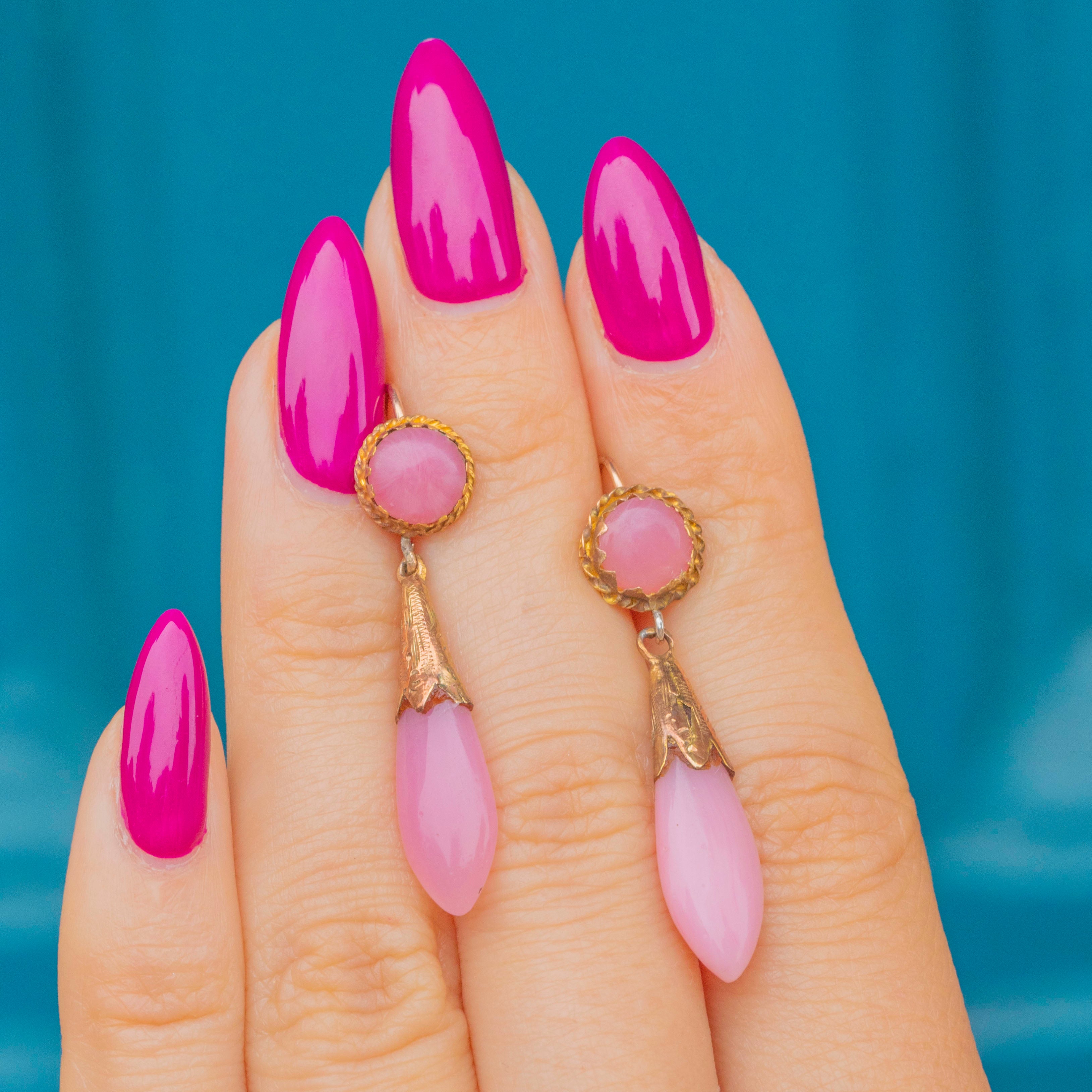These Victorian earrings are undeniably feminine, boasting baby pink Venetian glass displayed within buttery 9ct Gold, with their articulated torpedo drops providing a lovely movement as they suspend from your lobes.