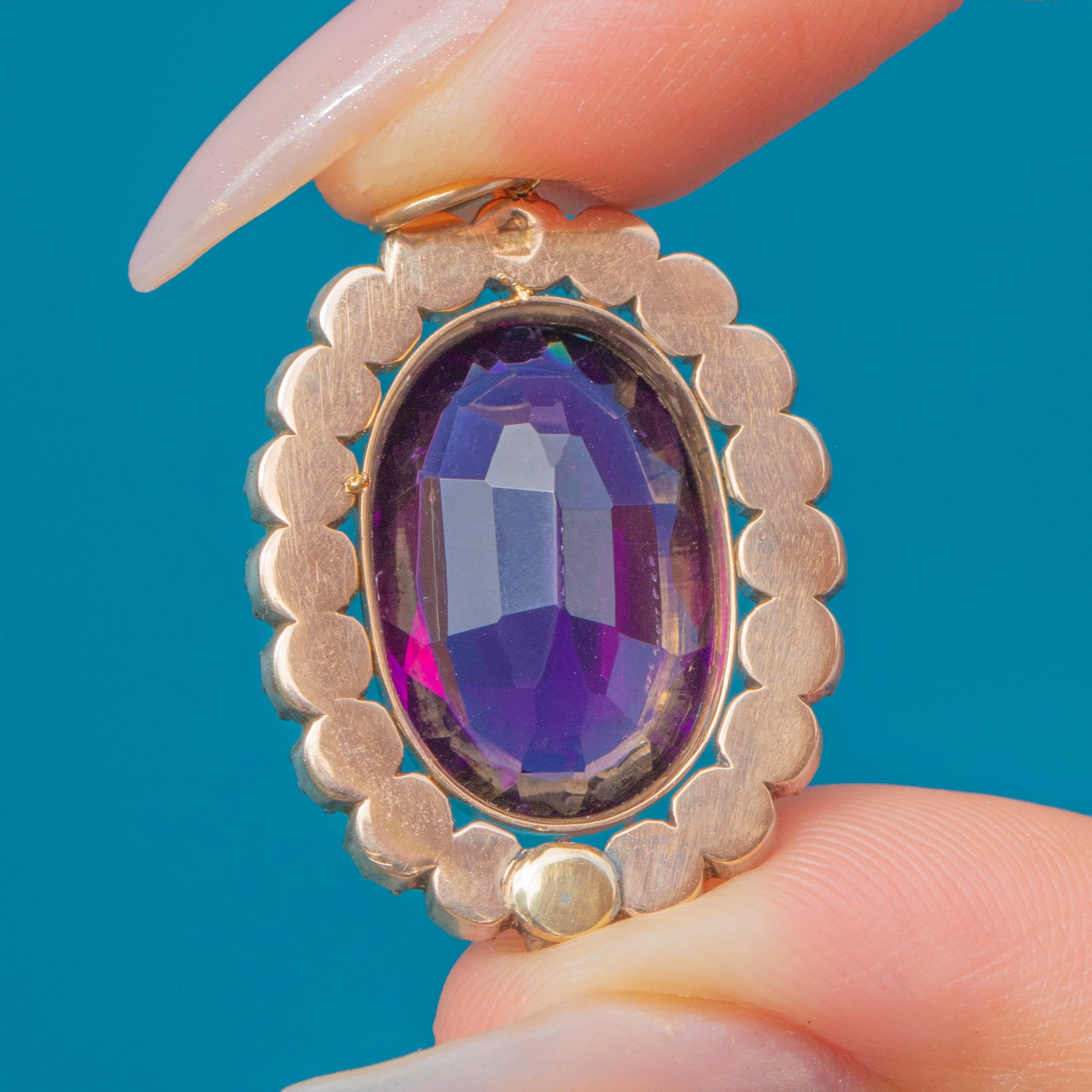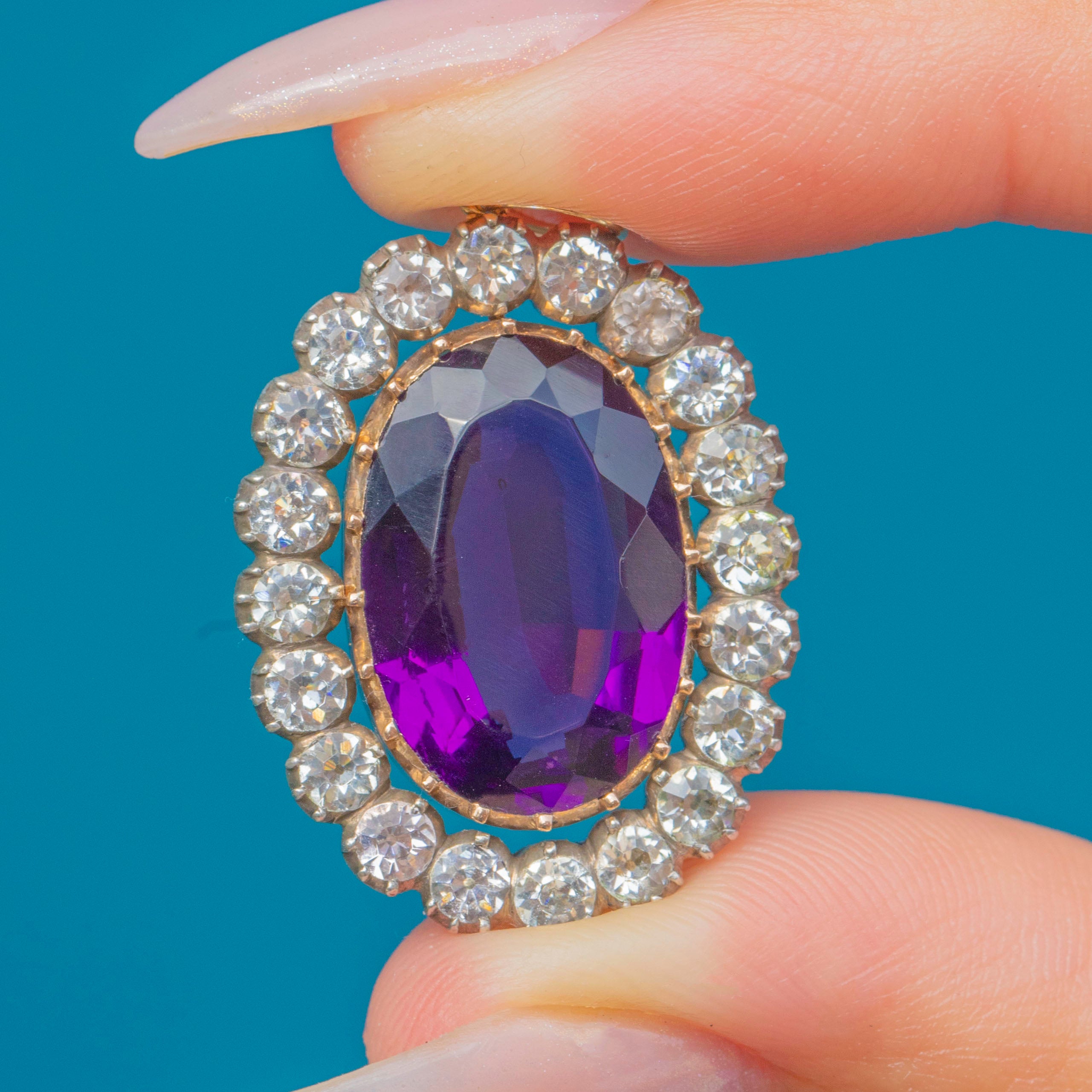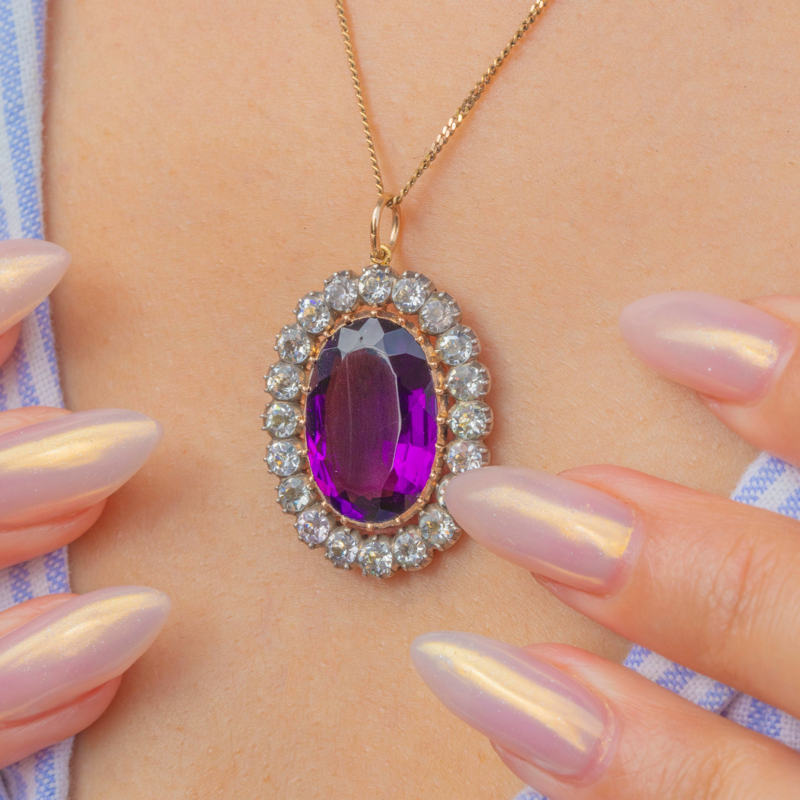 An exquisite antique pendant crafted in 9ct Gold and Silver Circa 1820, she features a striking Purple Amethyst Paste centre stone surrounded by smaller white Paste accents in an elongated oval drop.