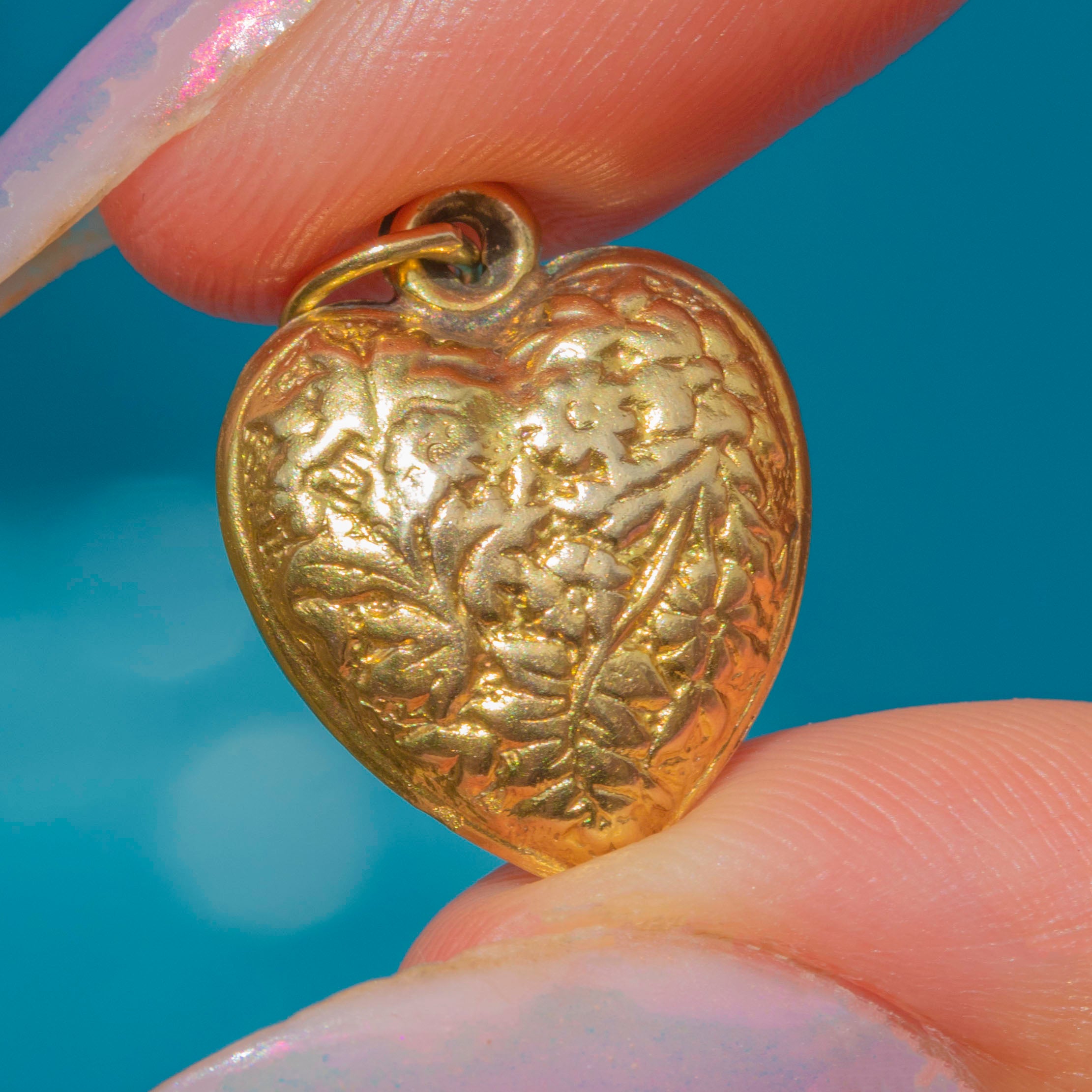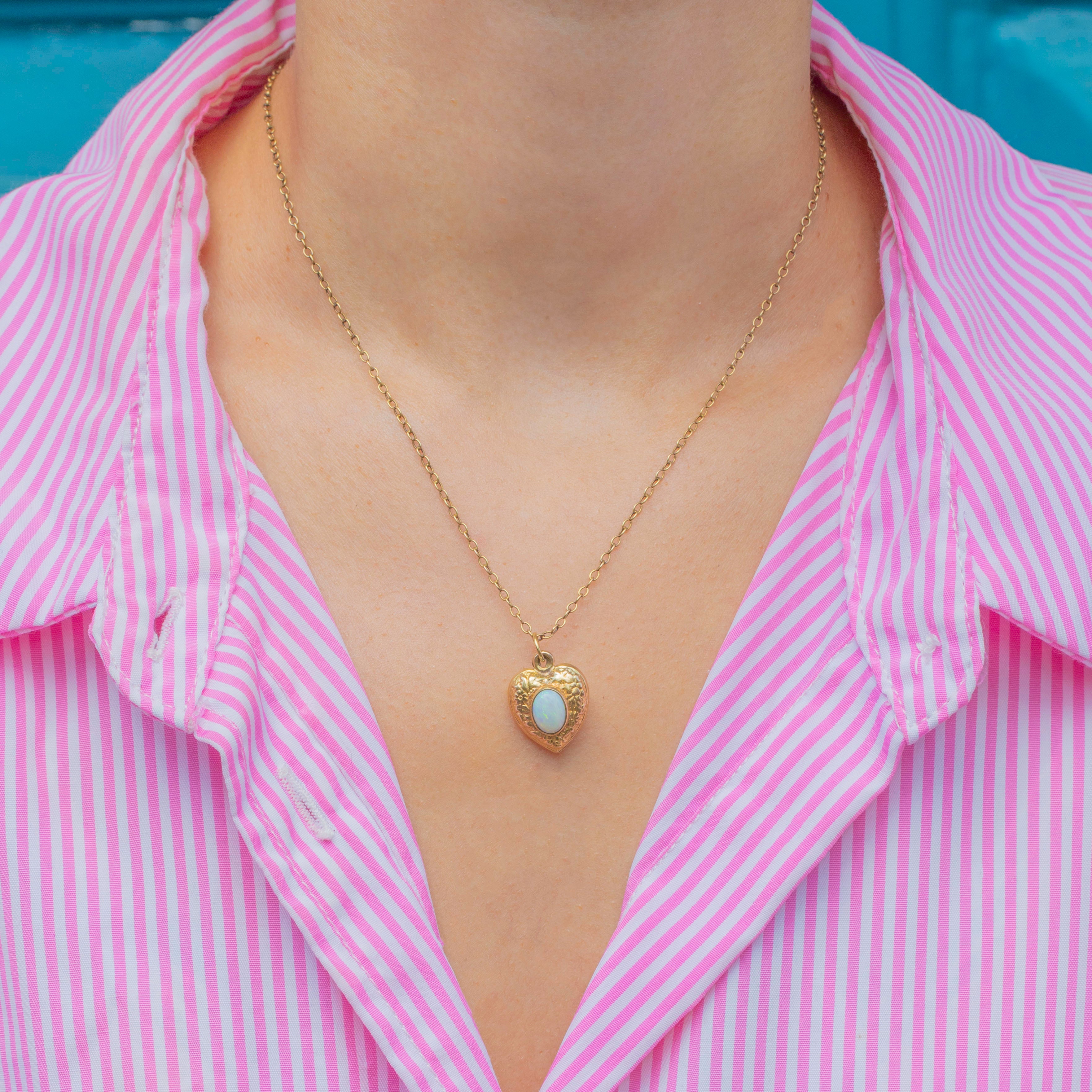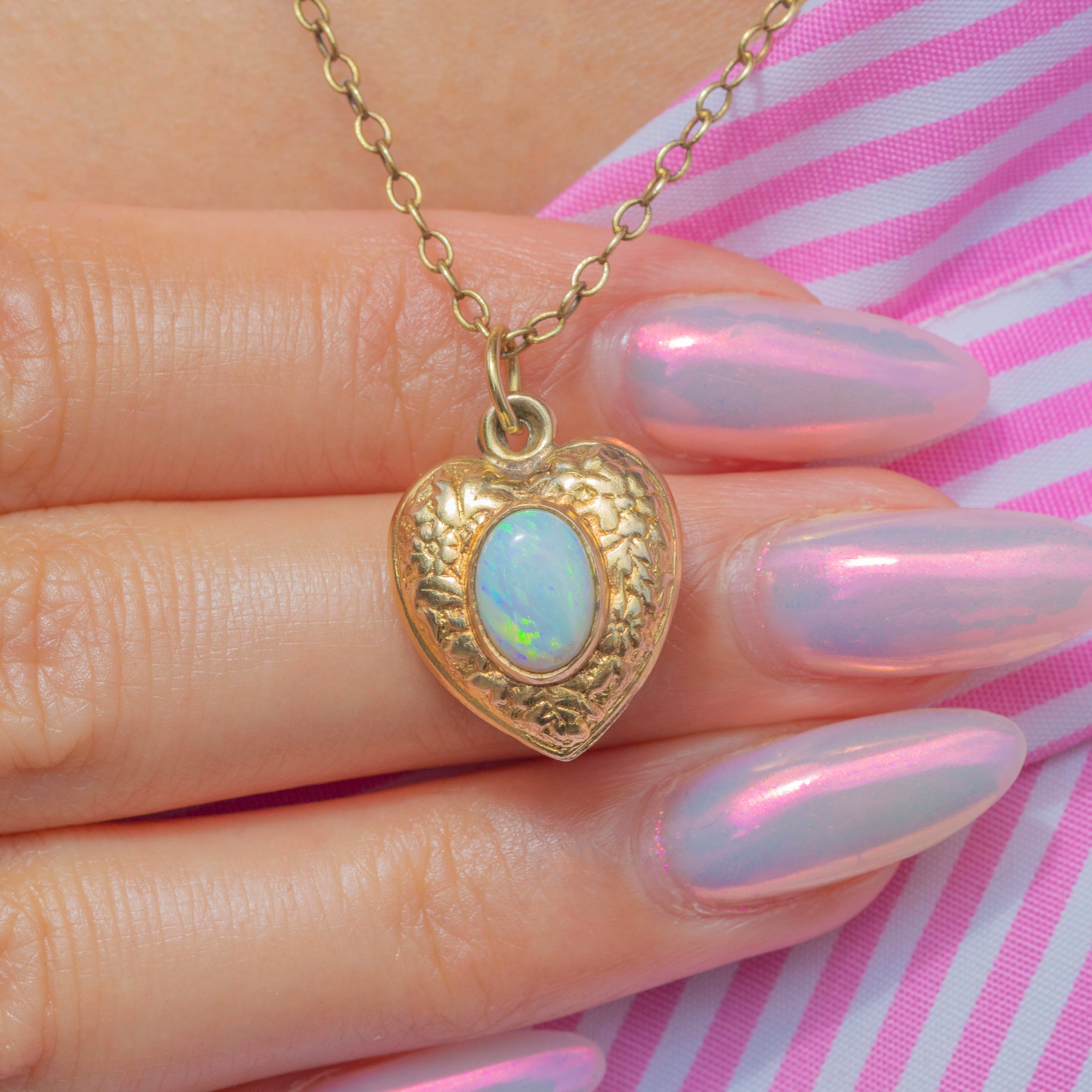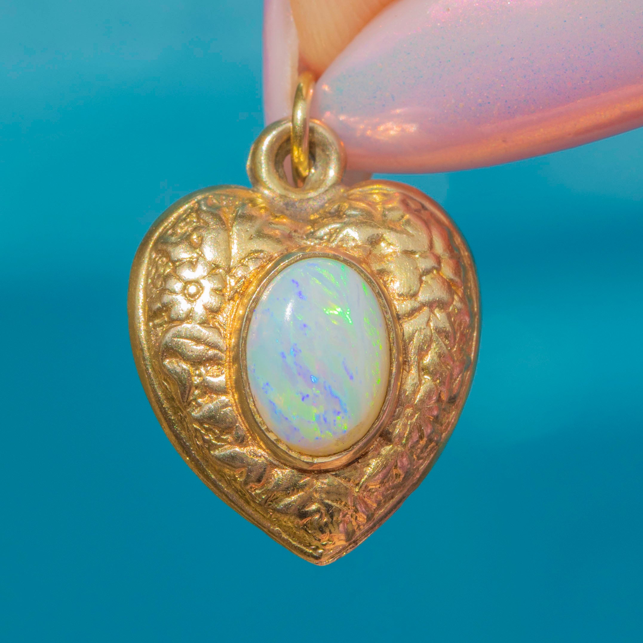 This Victorian repoussé heart charm is embellished with whimsical foliate details and is adorned with a solid 0.35ct natural Opal at her centre.