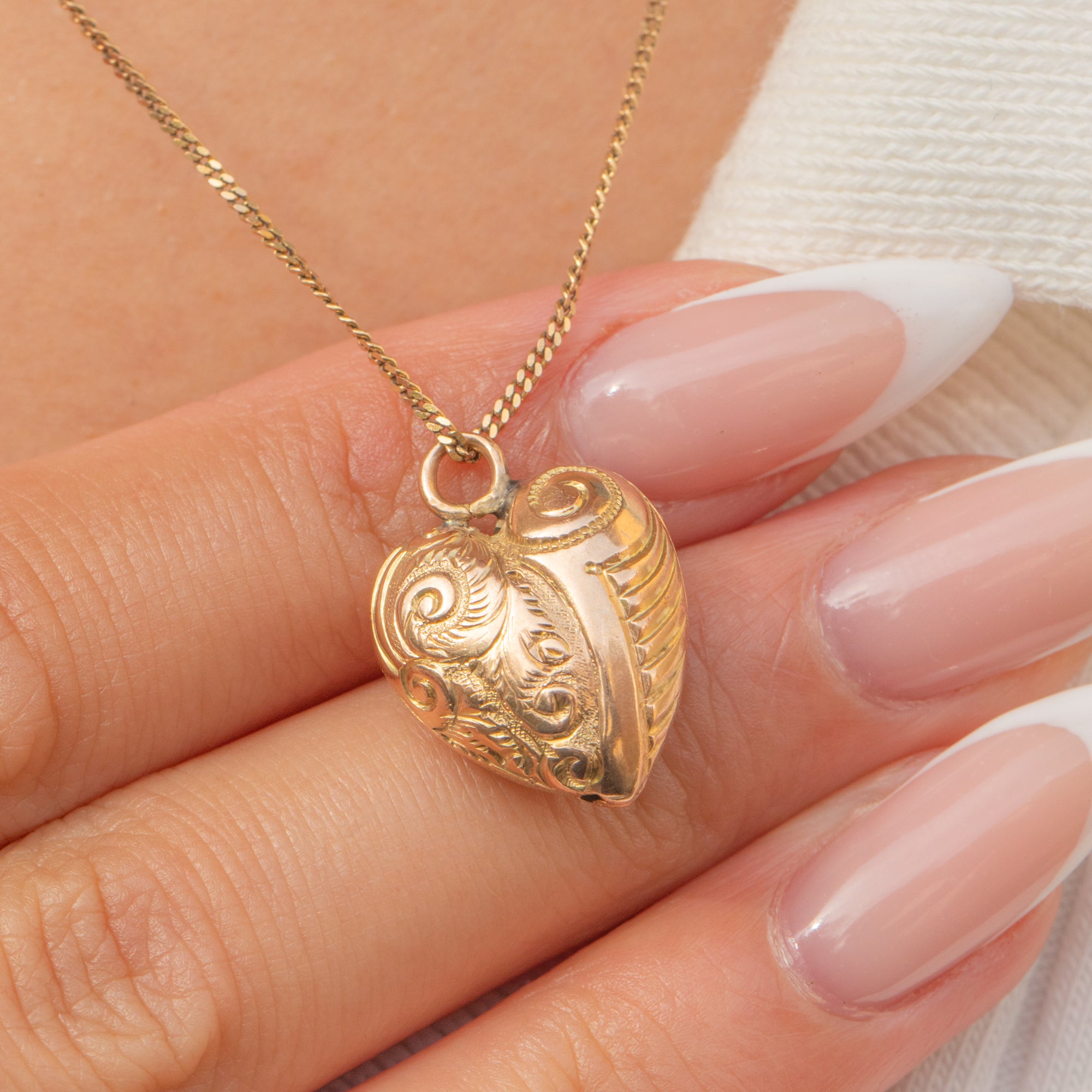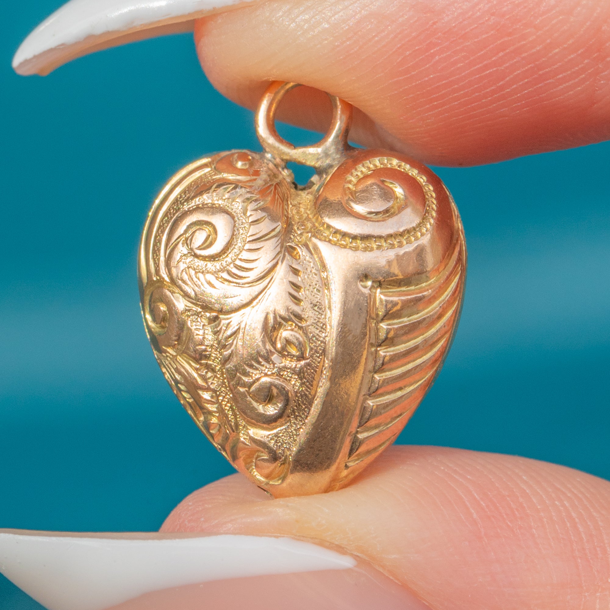 A charming Victorian puffy heart pendant crafted in 9ct Gold, decorated with delicate repousse detail. Lightly domed on both sides, the pendant has a soft, romantic look with a lovely antique glow. A classic symbol of love, this is a timeless piece perfect for wearing alone or layered with other antique charms and pendants.