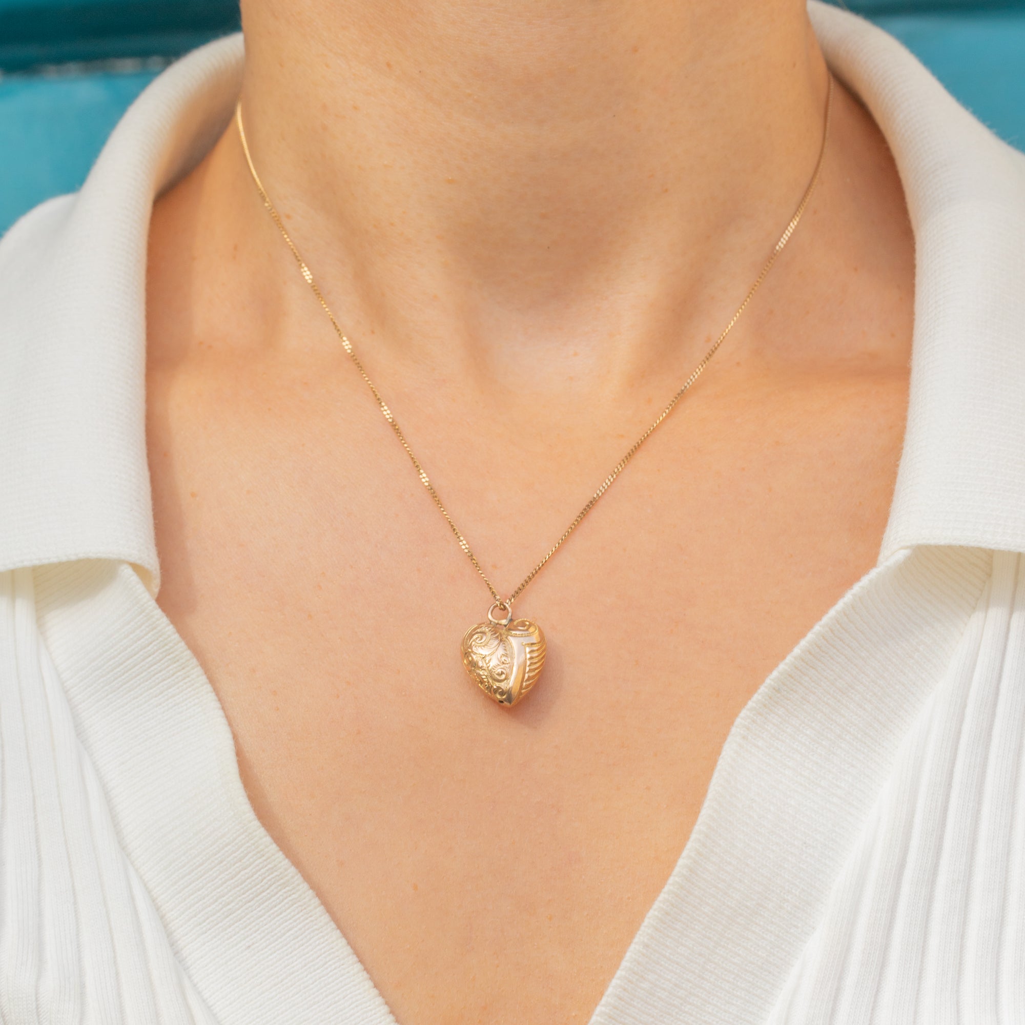 EXCELLENT: The Gold is bright and smooth, with crisp repousse detail and no dents or damage. A lovely example of a Victorian puffy heart pendant in superb condition.