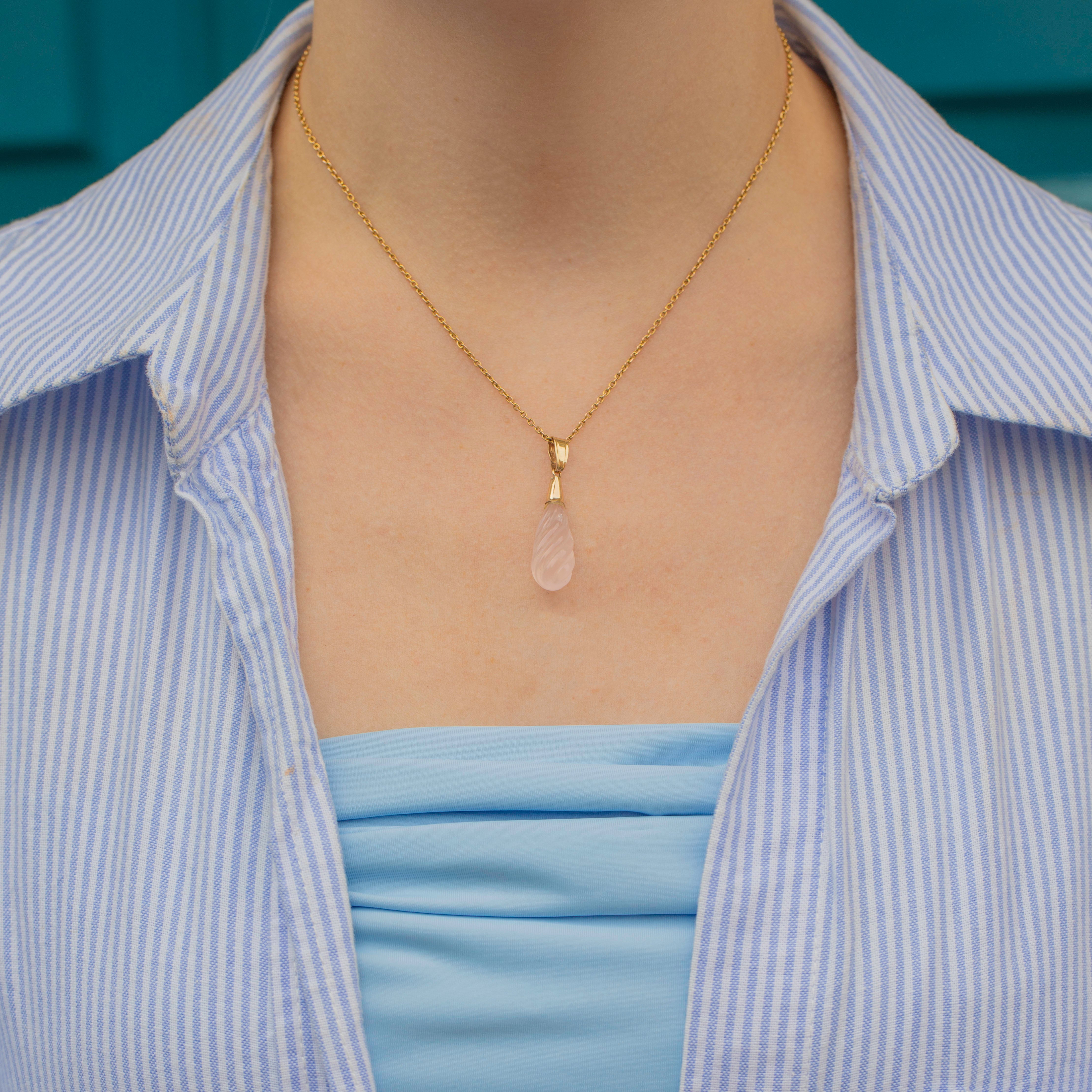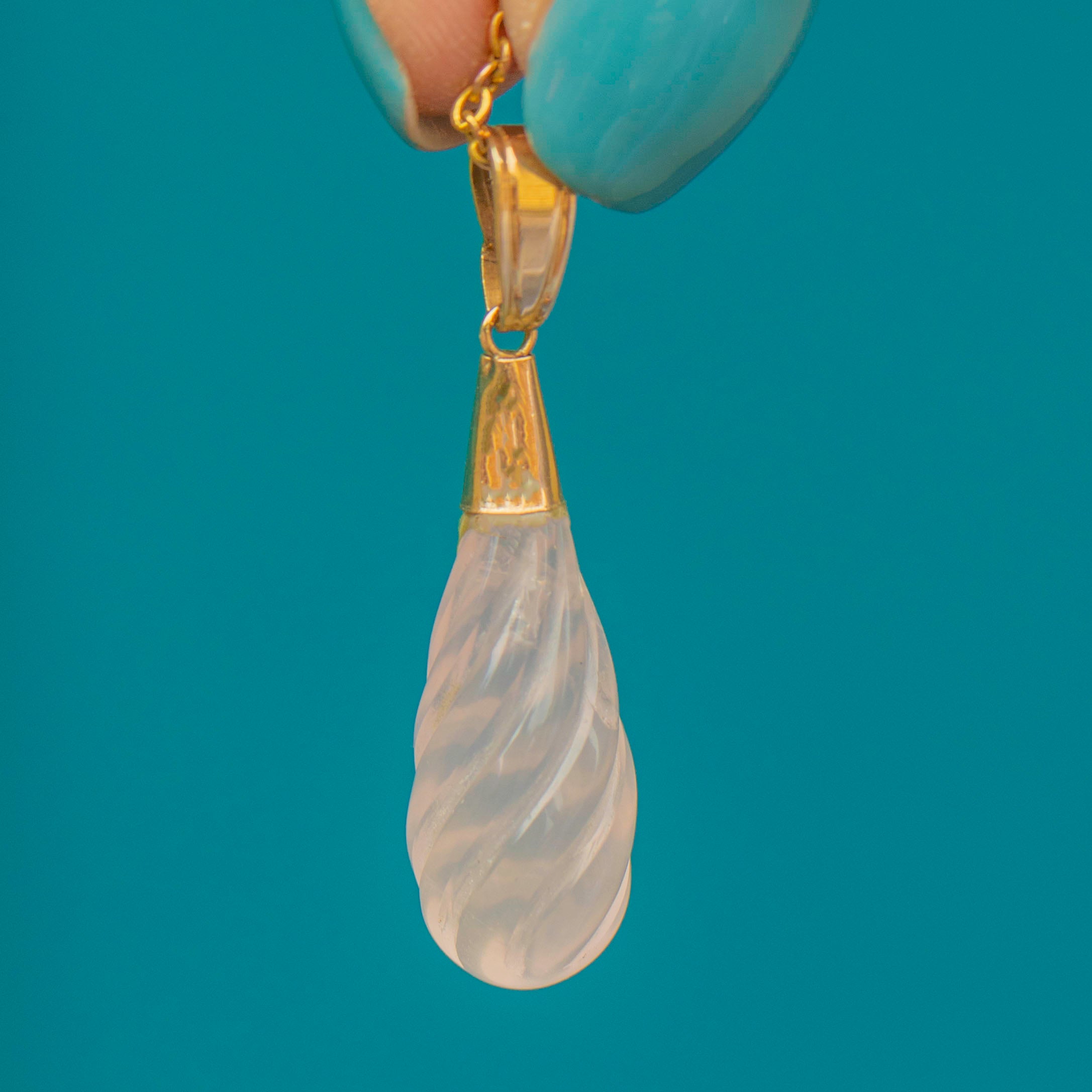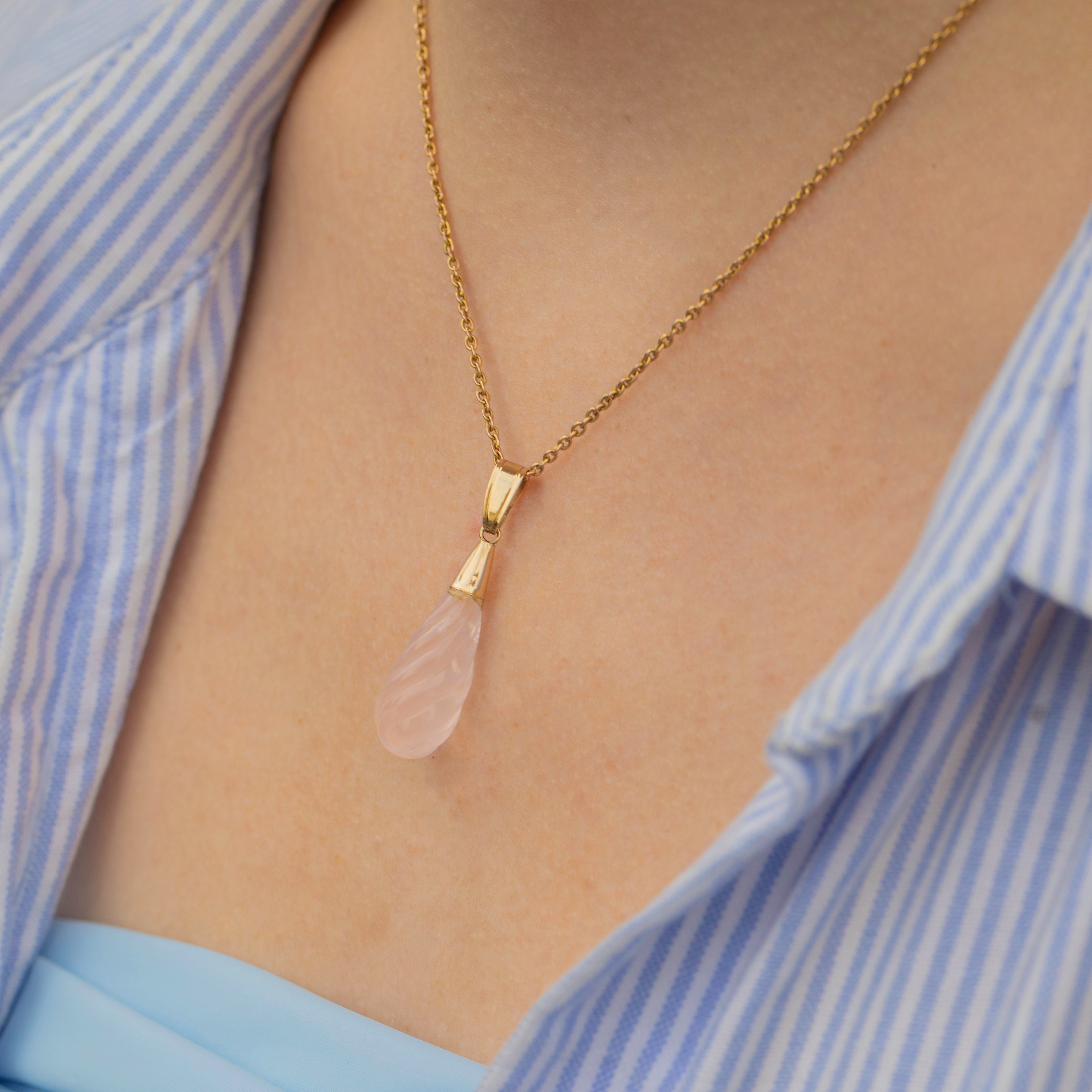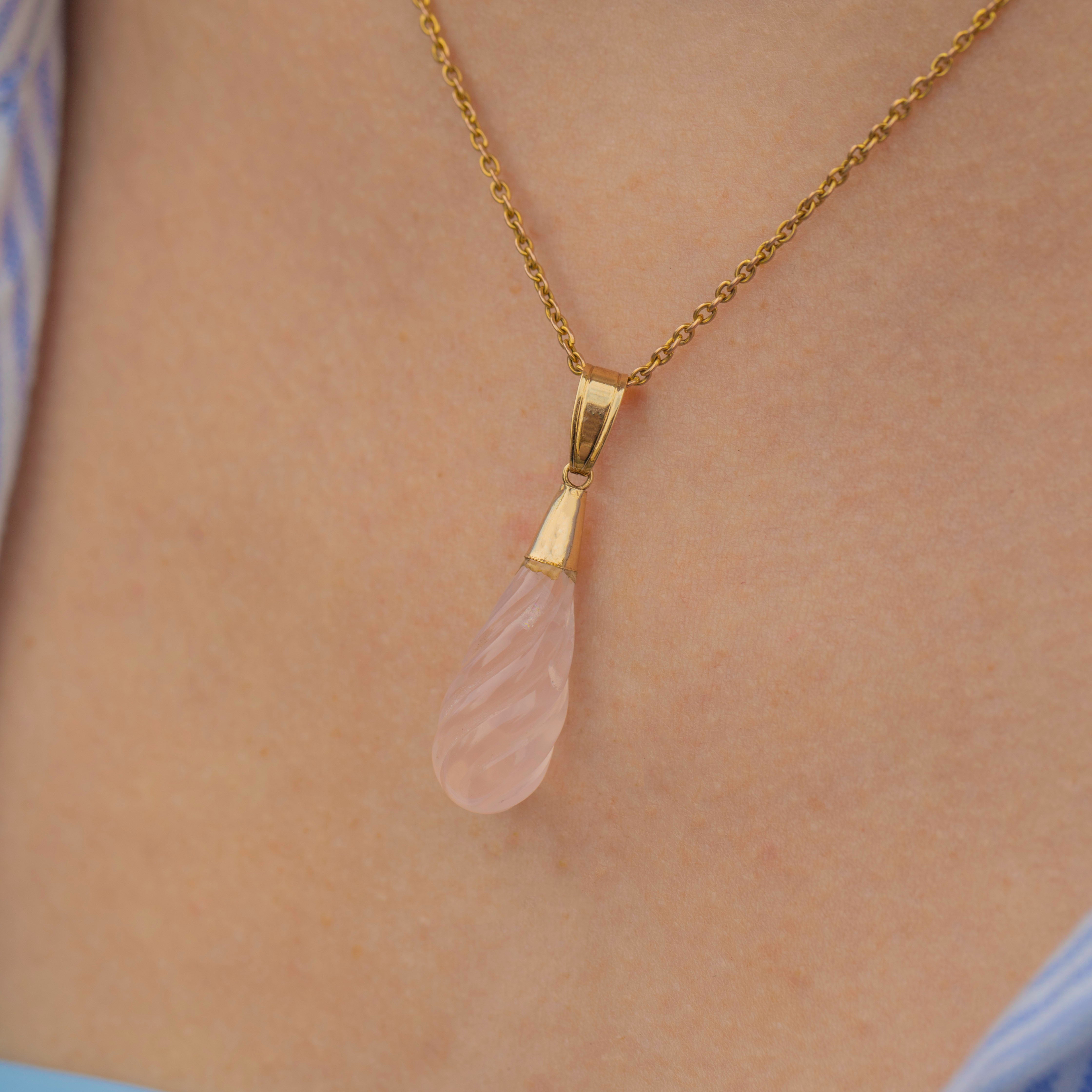 EXCELLENT. This antique 9ct Gold rose Quartz twist drop pendant is in excellent condition! The Rose Quartz is securely attached to the Gold topper and with a generous size bale, she can be suspended confidently. The Quartz is carved to perfection making this antique Gold pendant a dream to look at from all angles!