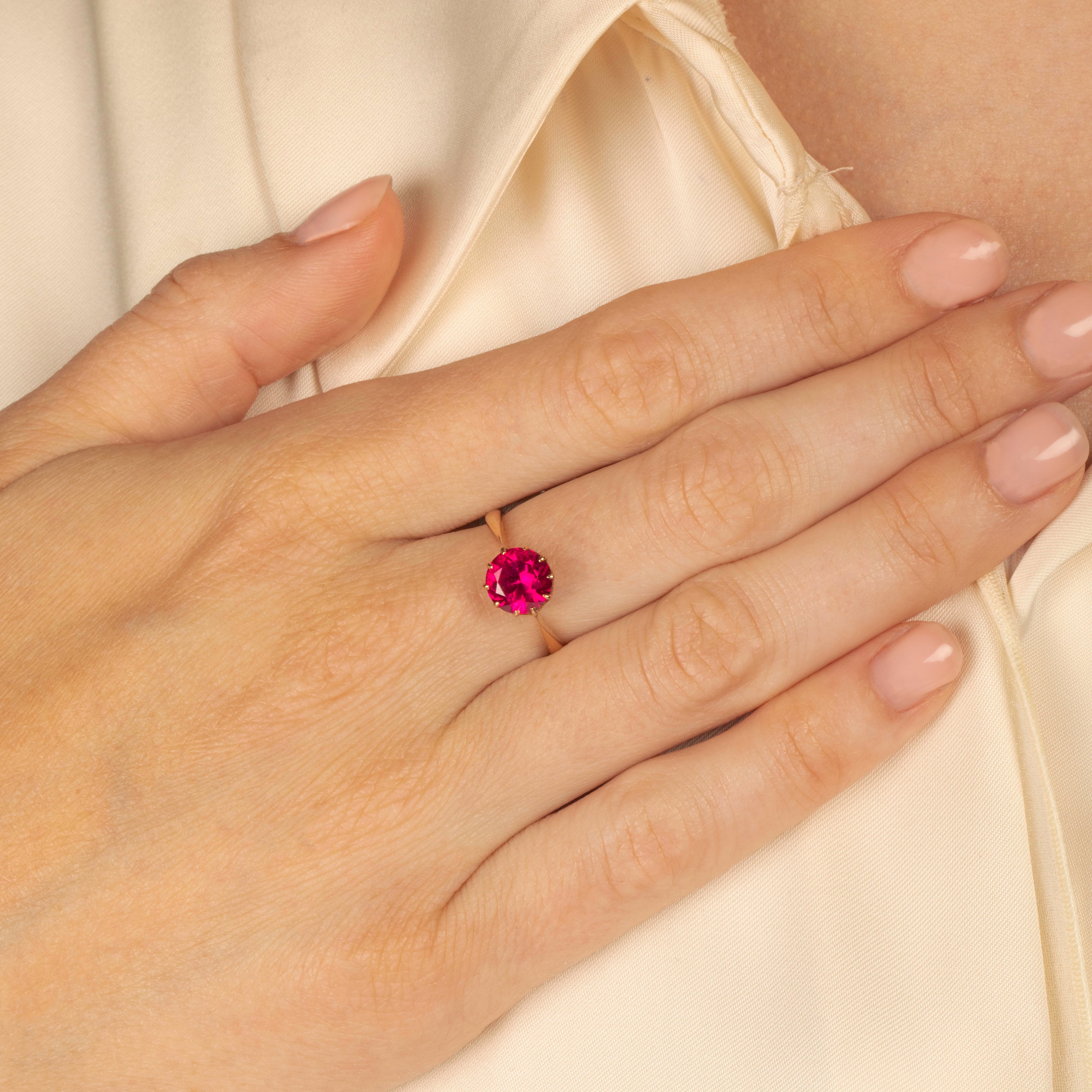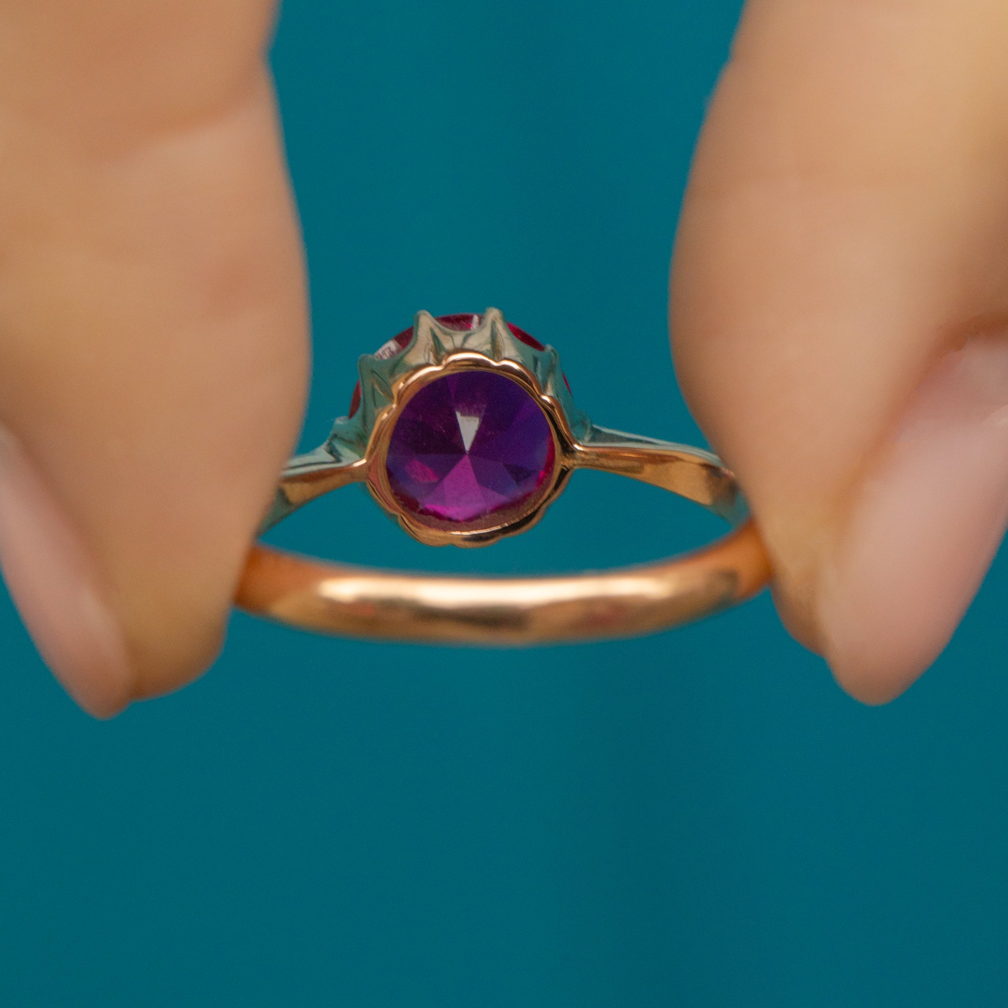 With vivid fuchsia hues dancing across her fabulously faceted form, perfectly complimented by the buttery tone of her 9ct Gold. The elegant design of this Victorian ring is what makes her timeless, you won't want to take her off once she's yours!