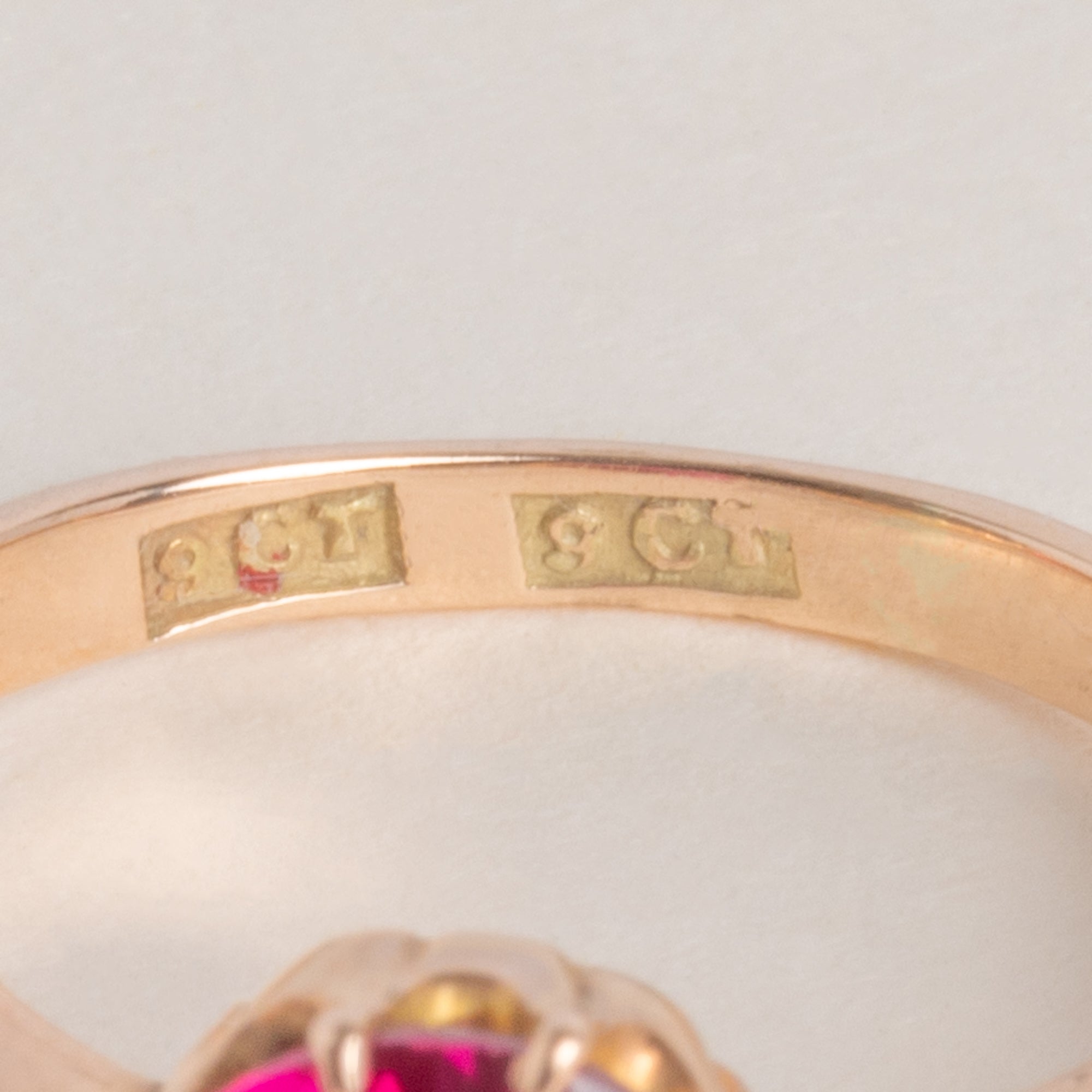 MATERIALS: Tests as 9ct Gold throughout, Ruby (early Verneille Synthetic).