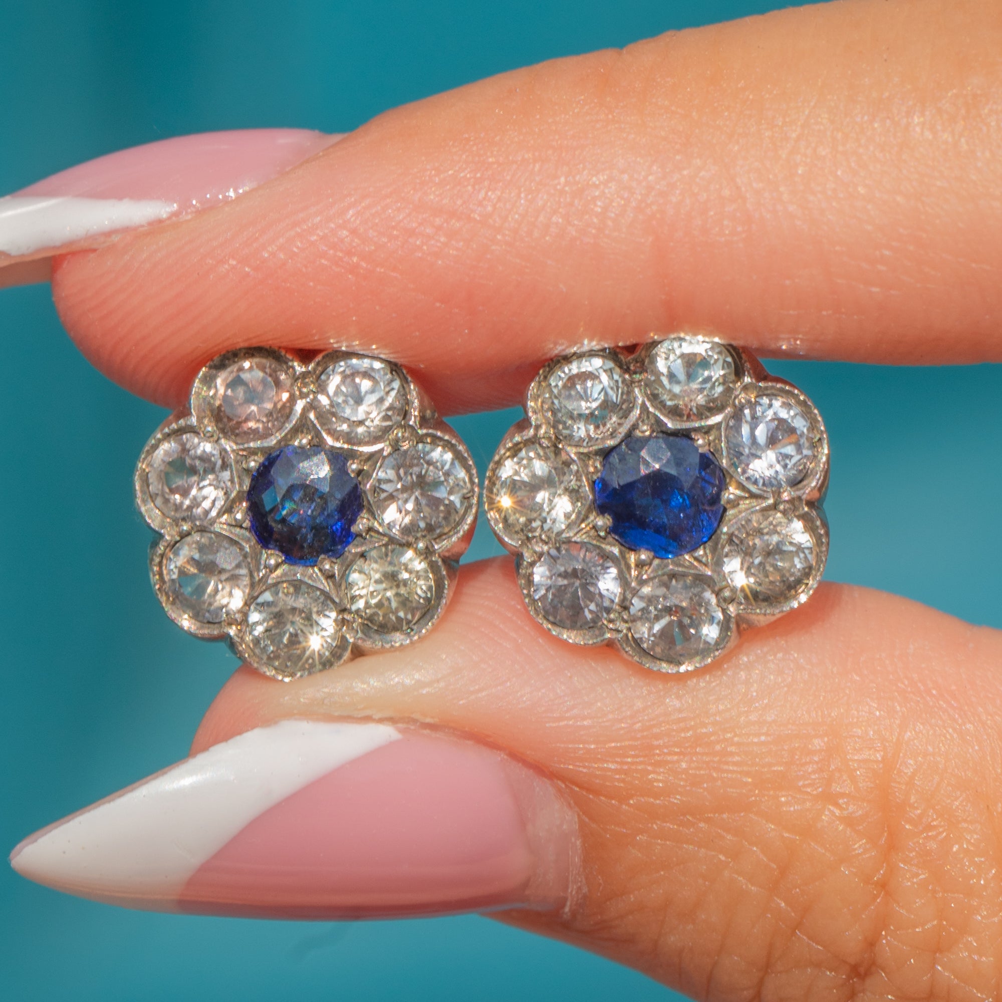 These Victorian earrings each flaunt eight dazzling Sapphires, centred by a royal blue Sapphire which is further encircled by bright white Sapphires.