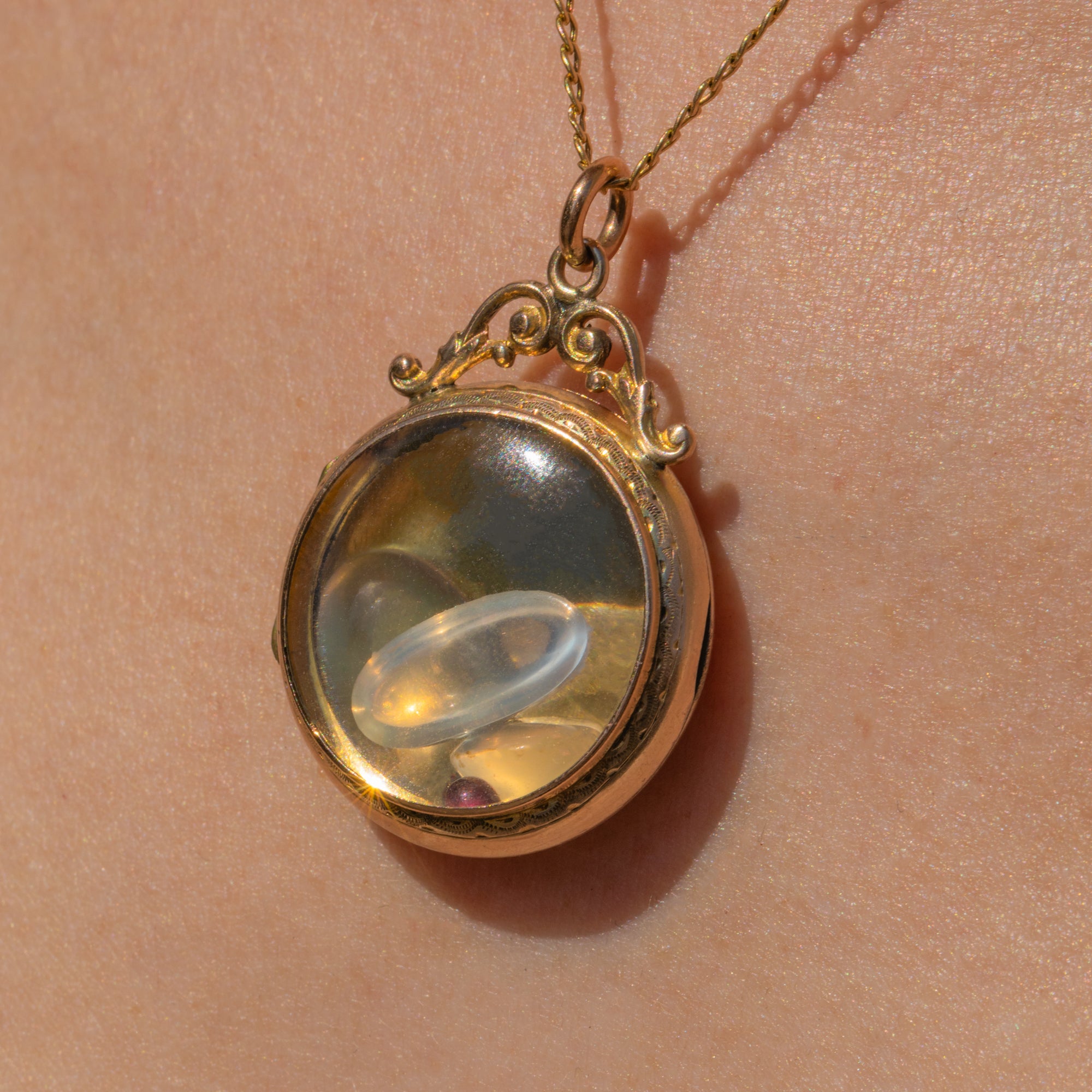 This antique 9ct Gold shaker locket will make a fun addition to your repertoire! Suspended from an ornate bale, watch as her Moonstones and Garnets dance behind the glass, with space to add more gemstones of your own for a personal touch.