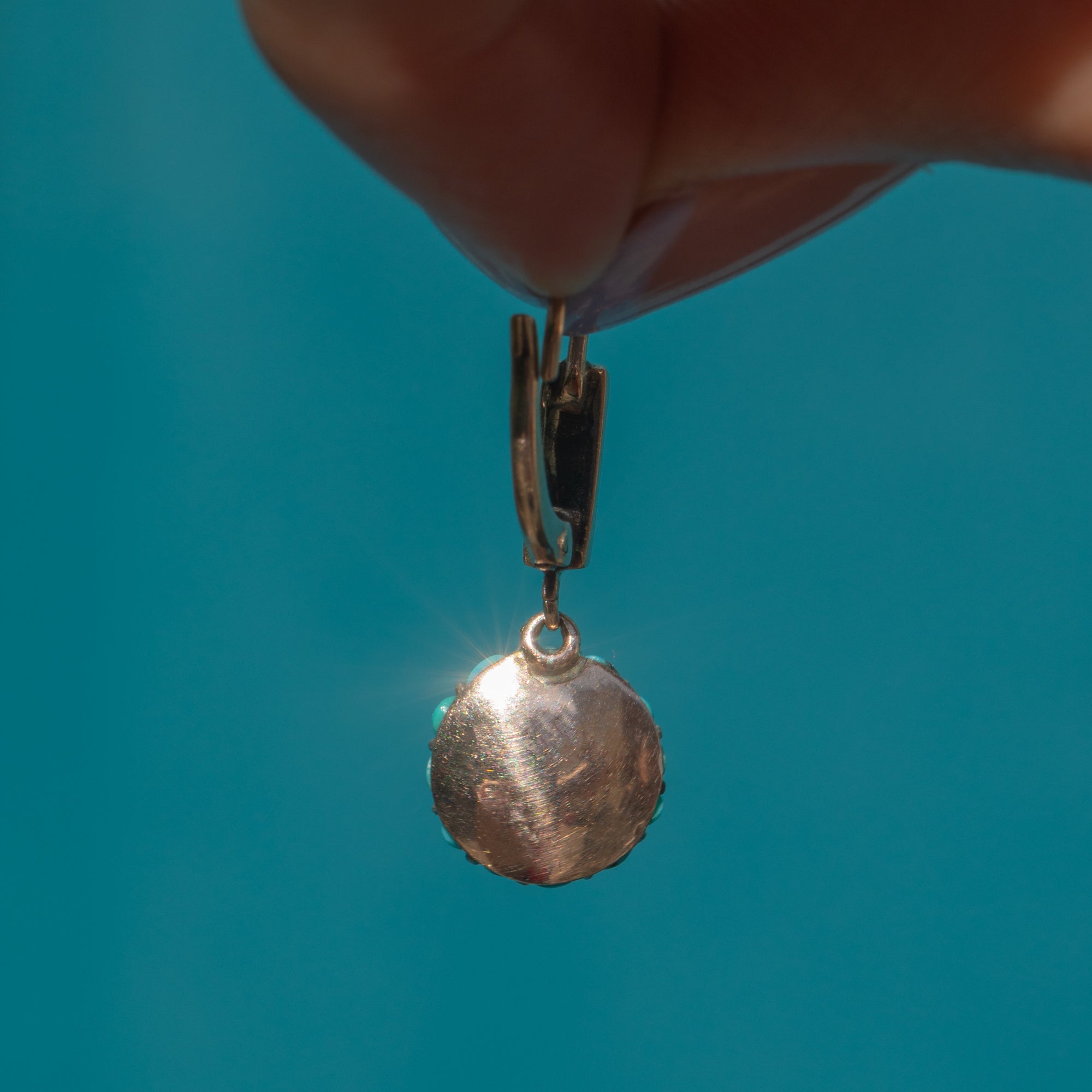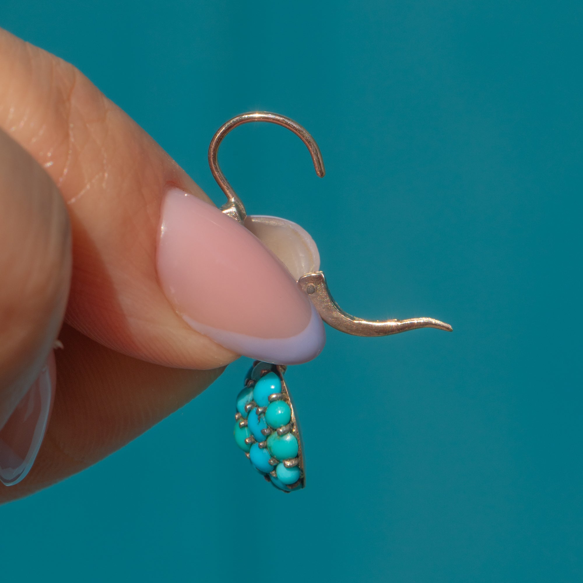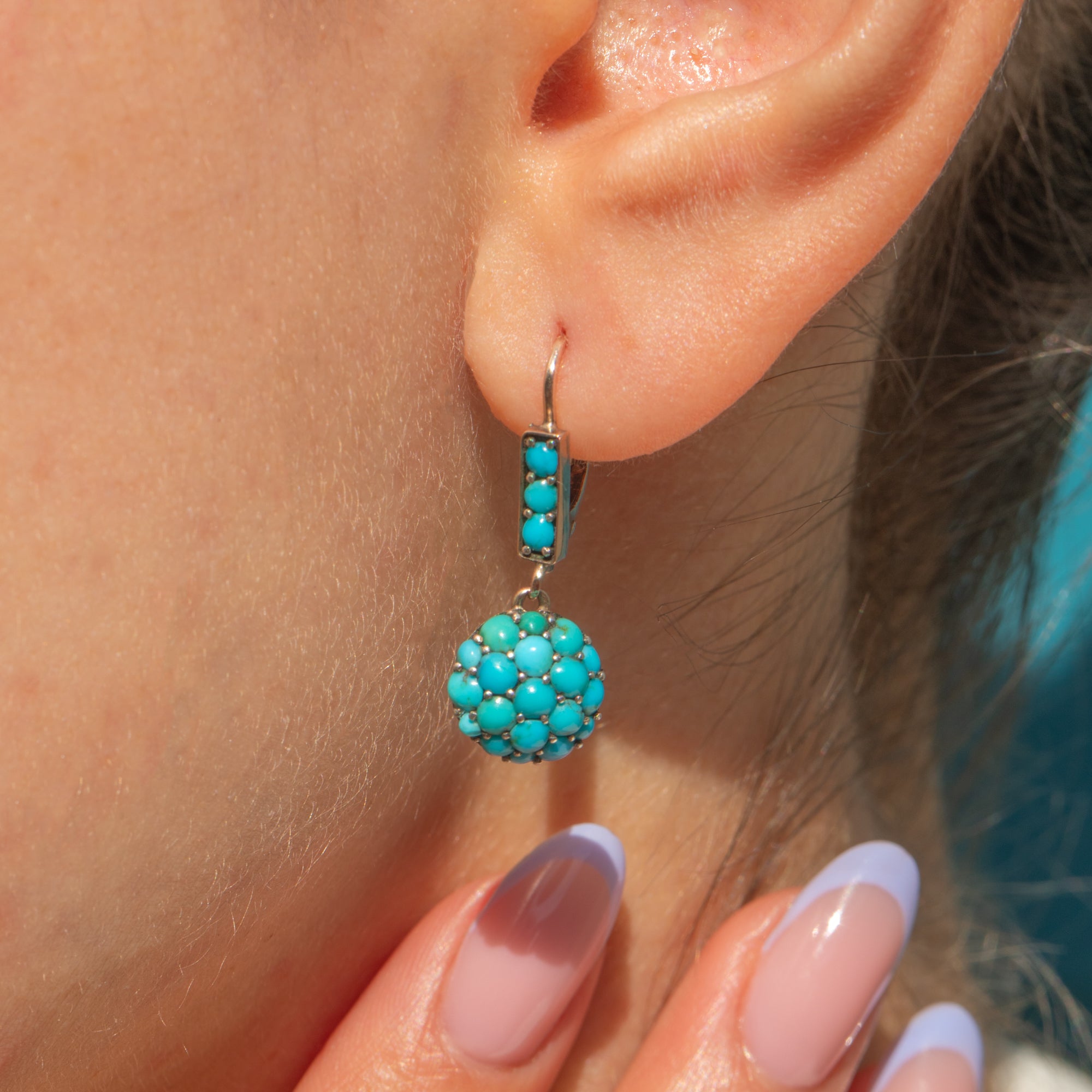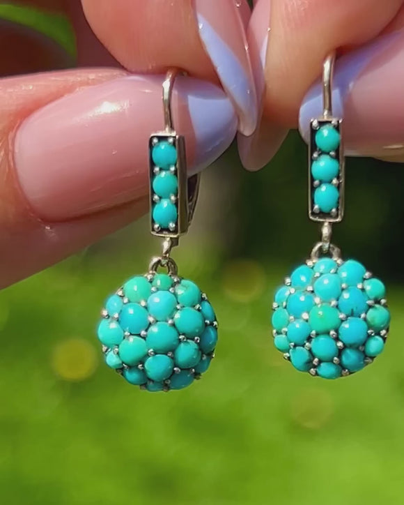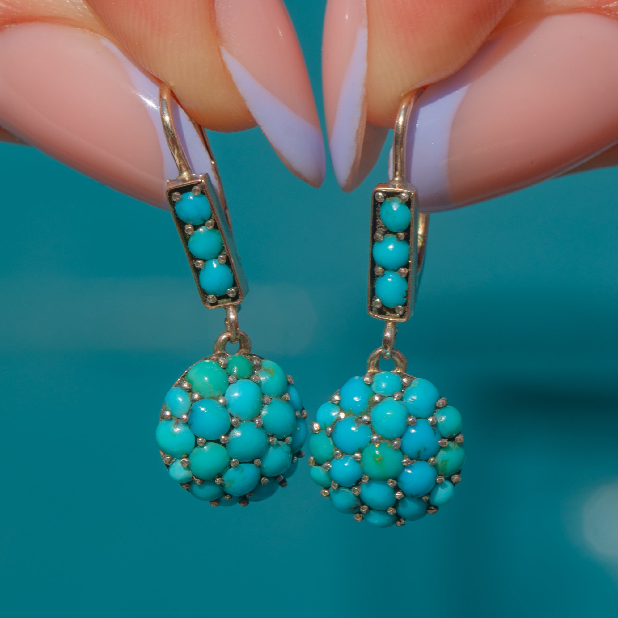 The Turquoise are pavé set in buttery 9ct Gold and complete with lever-backs in quintessential Victorian style, they radiate antique charm and character!