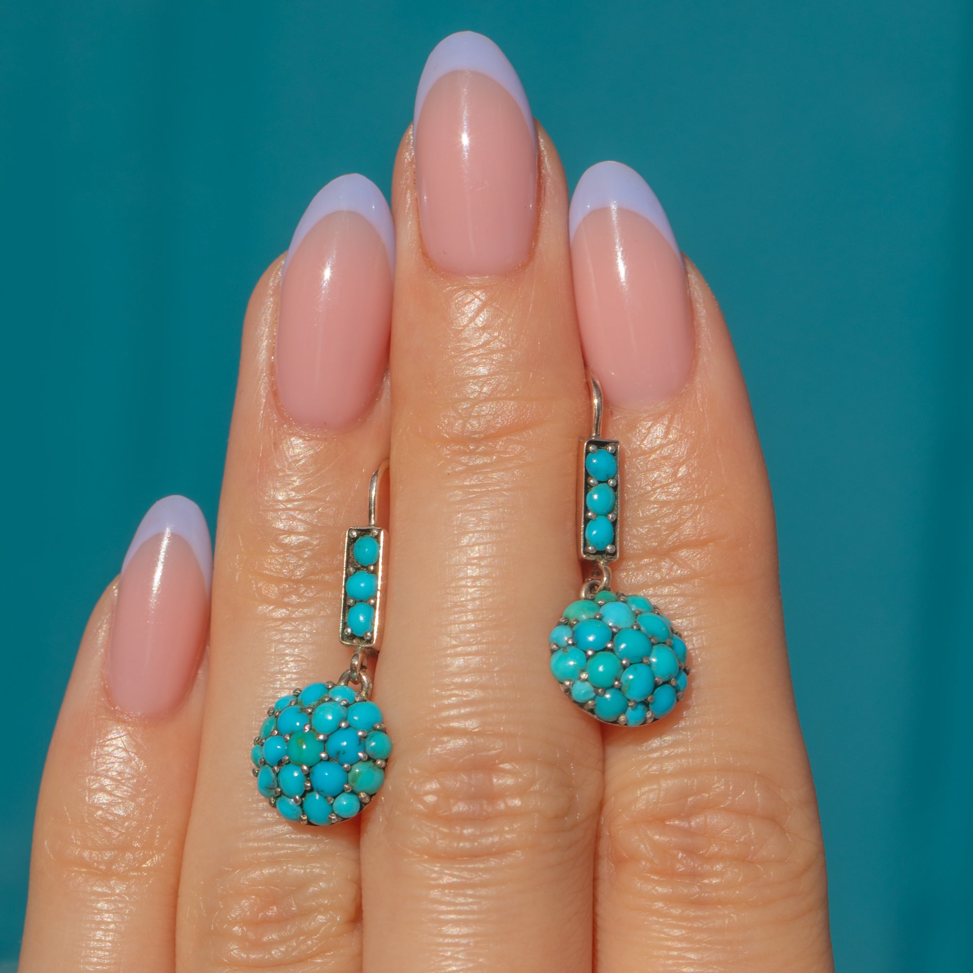 Exuding Victorian splendour, each drop earring is adorned with a myriad of Turquoise stones, each carrying a delightful duck egg blue hue, with subtle variations in tone.