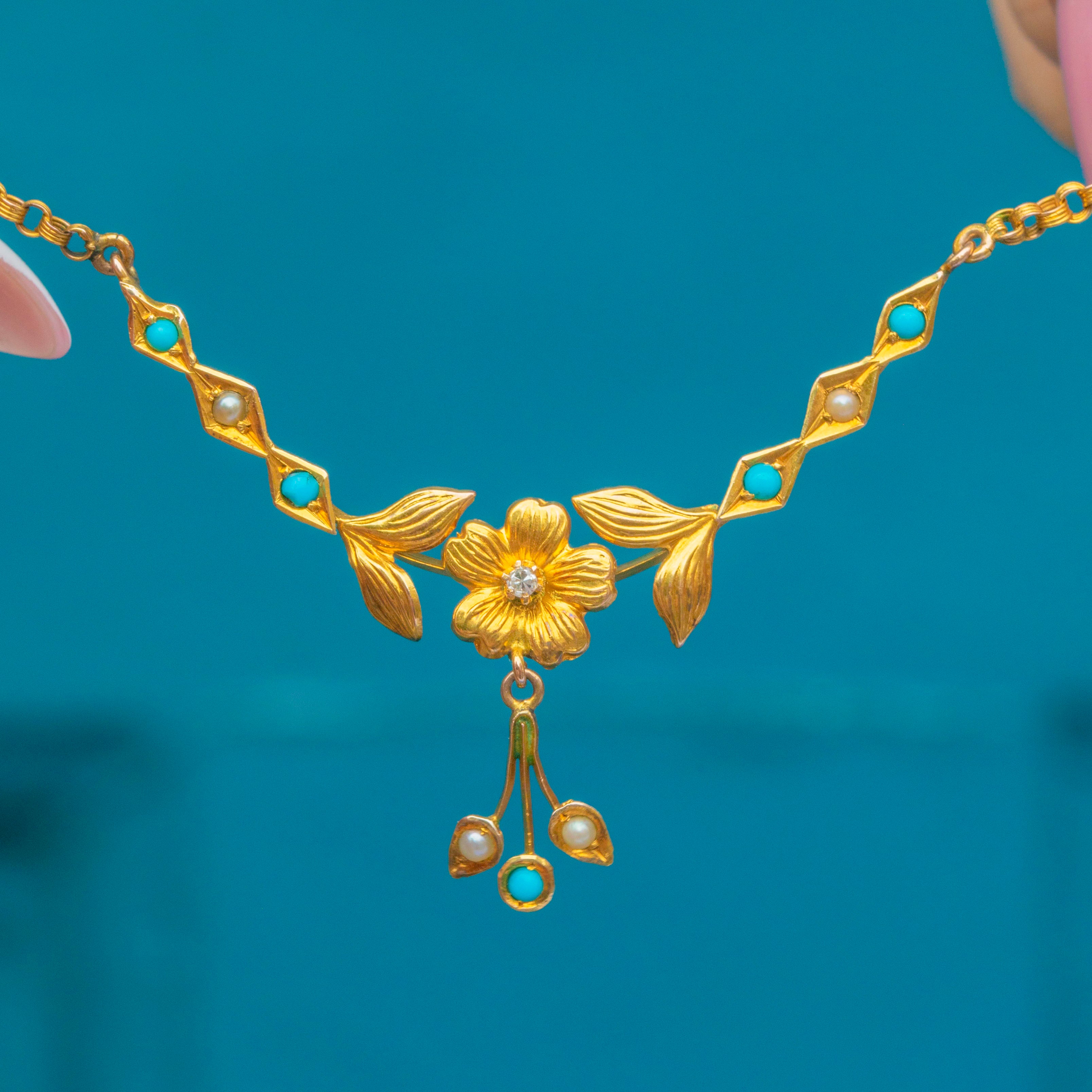 This Antique Victorian necklace in 9ct Gold is adorned with bright Turquoise cabochons and creamy natural Pearls in a delicate floral and foliate design. At the centre, a finely detailed Gold flower is set with a glistening Diamond accent, with a graceful drop featuring two Pearls and a Turquoise for added movement and charm. The articulated sections create a beautiful drape along the neckline, with the rich yellow Gold adding warmth and elegance.