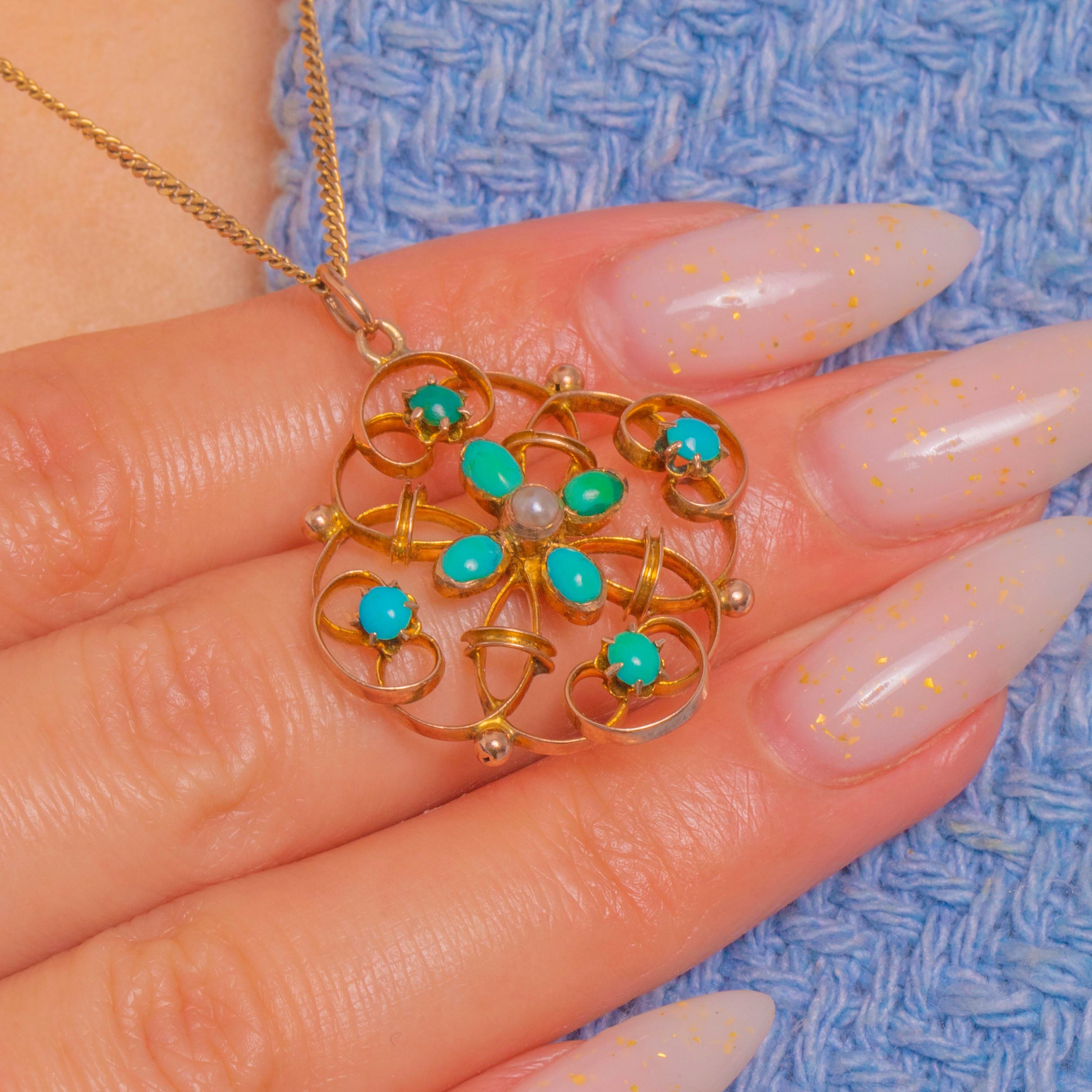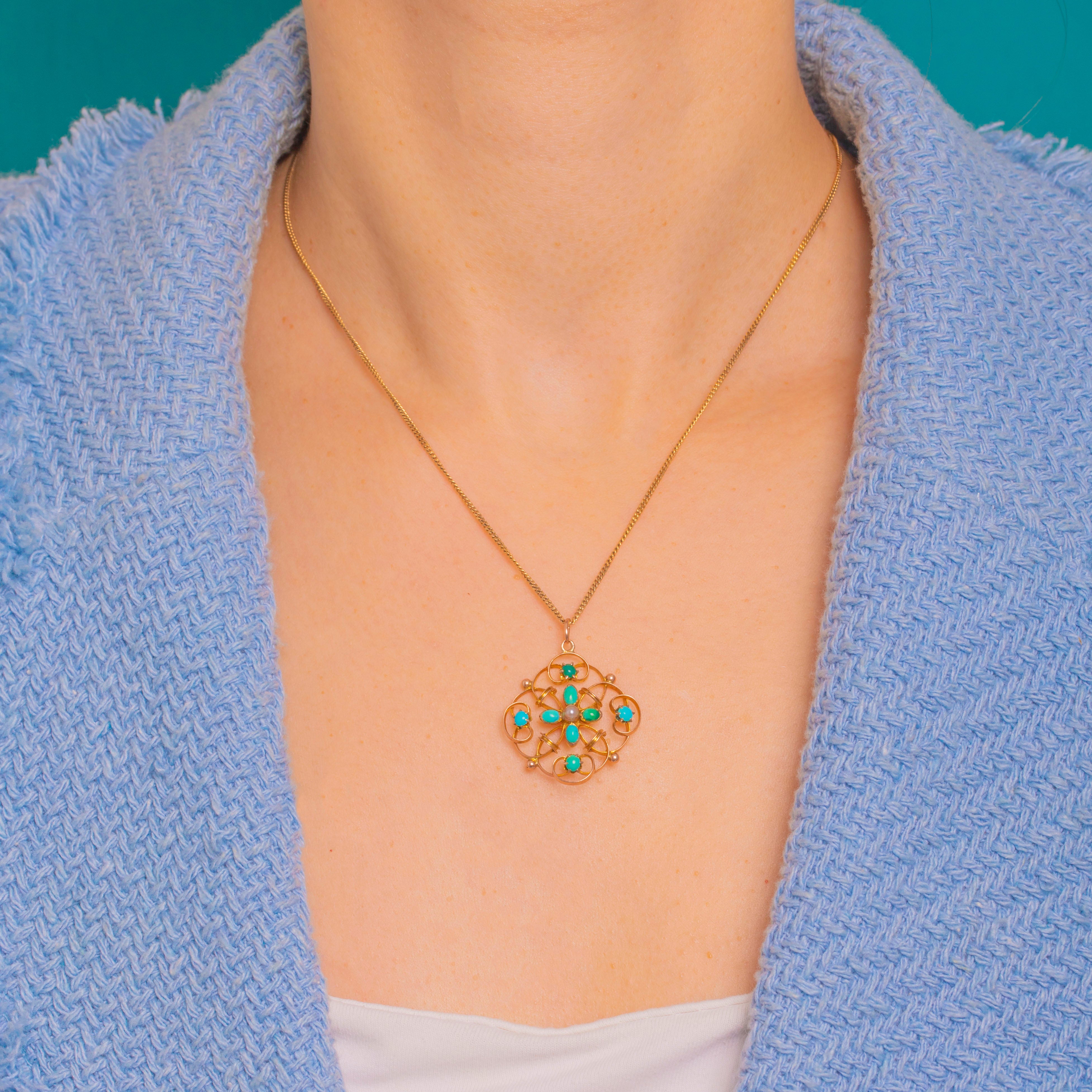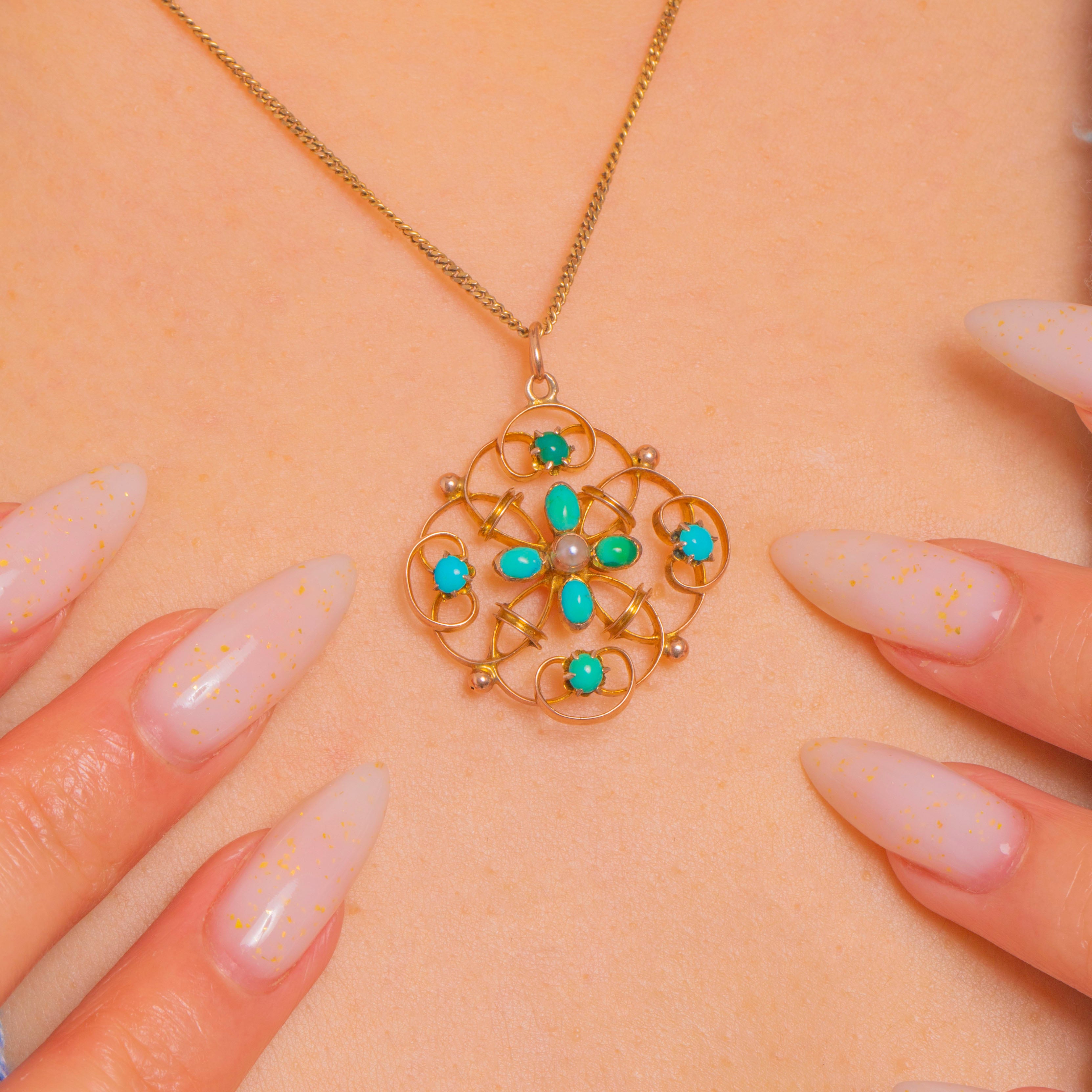 Delicate, lacy and unmistakably Edwardian, this openwork pendant marries glossy Turquoise with a creamy Pearl in a charming Celtic-inspired motif. Crafted in glowing 9ct Gold, the design forms a floral rosette within a soft quatrefoil cartouche, its scrolling wirework and tiny granule accents adding a refined, hand-wrought finesse.