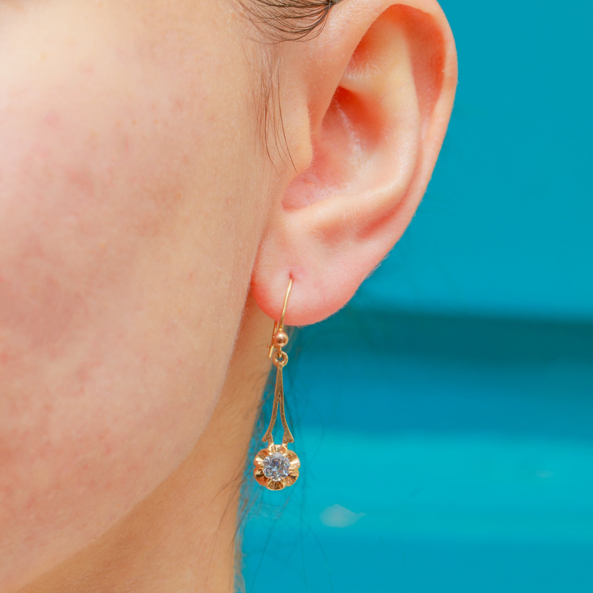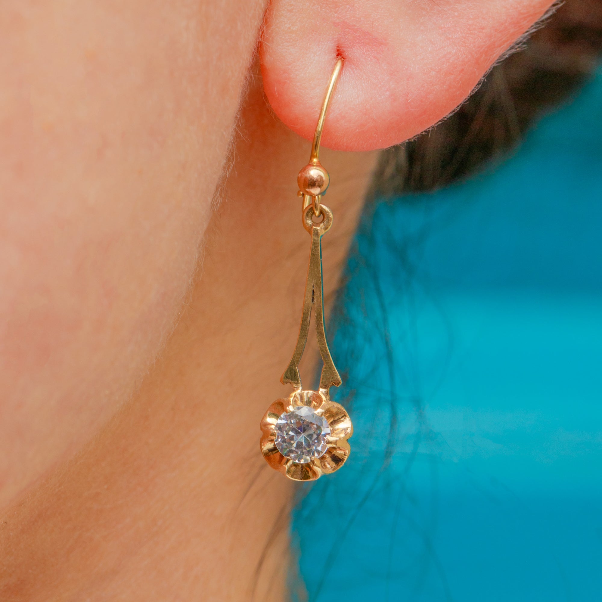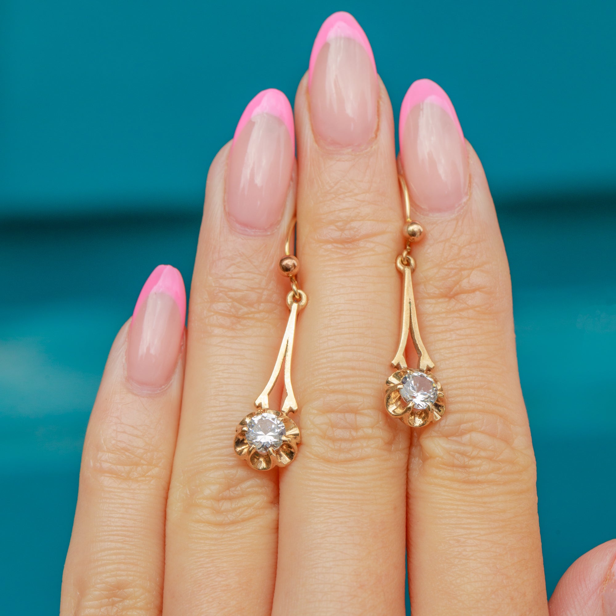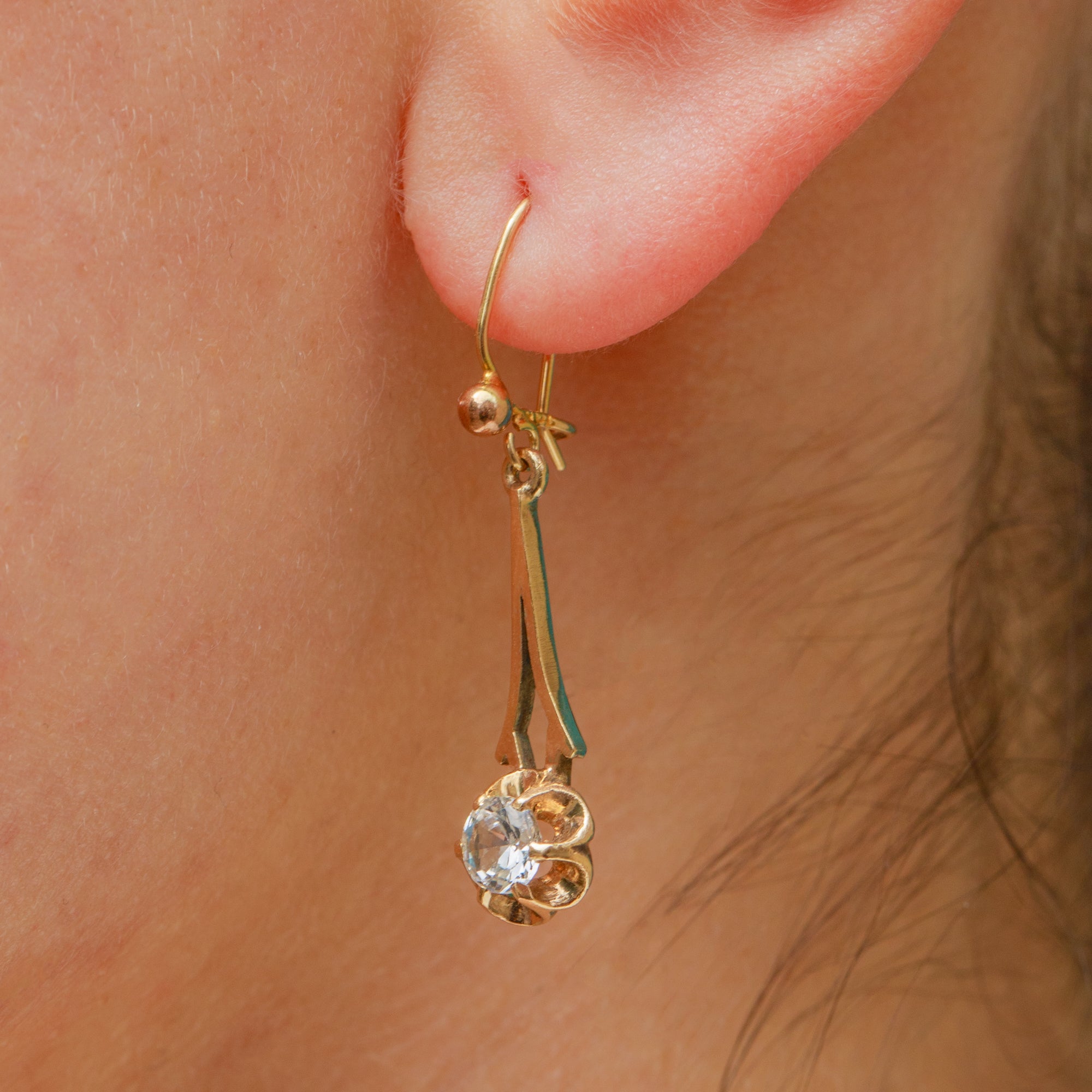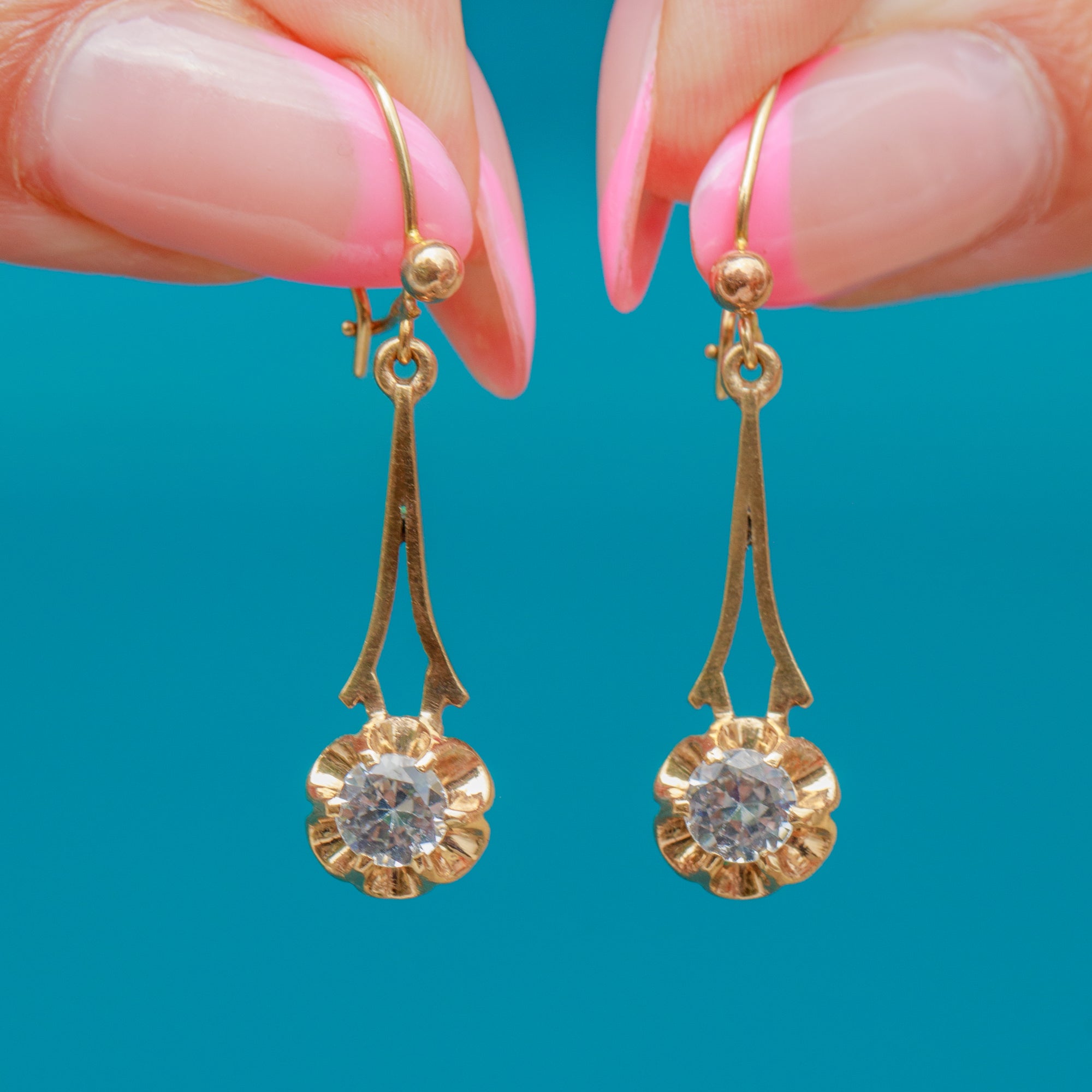 These antique 9ct Gold White Spinel flower drop earrings will make your heart flutter! With lovely three-dimensional buttercup flowers featuring an icy Spinel centre, these earrings are attention-grabbing and look gorgeous in the ear!