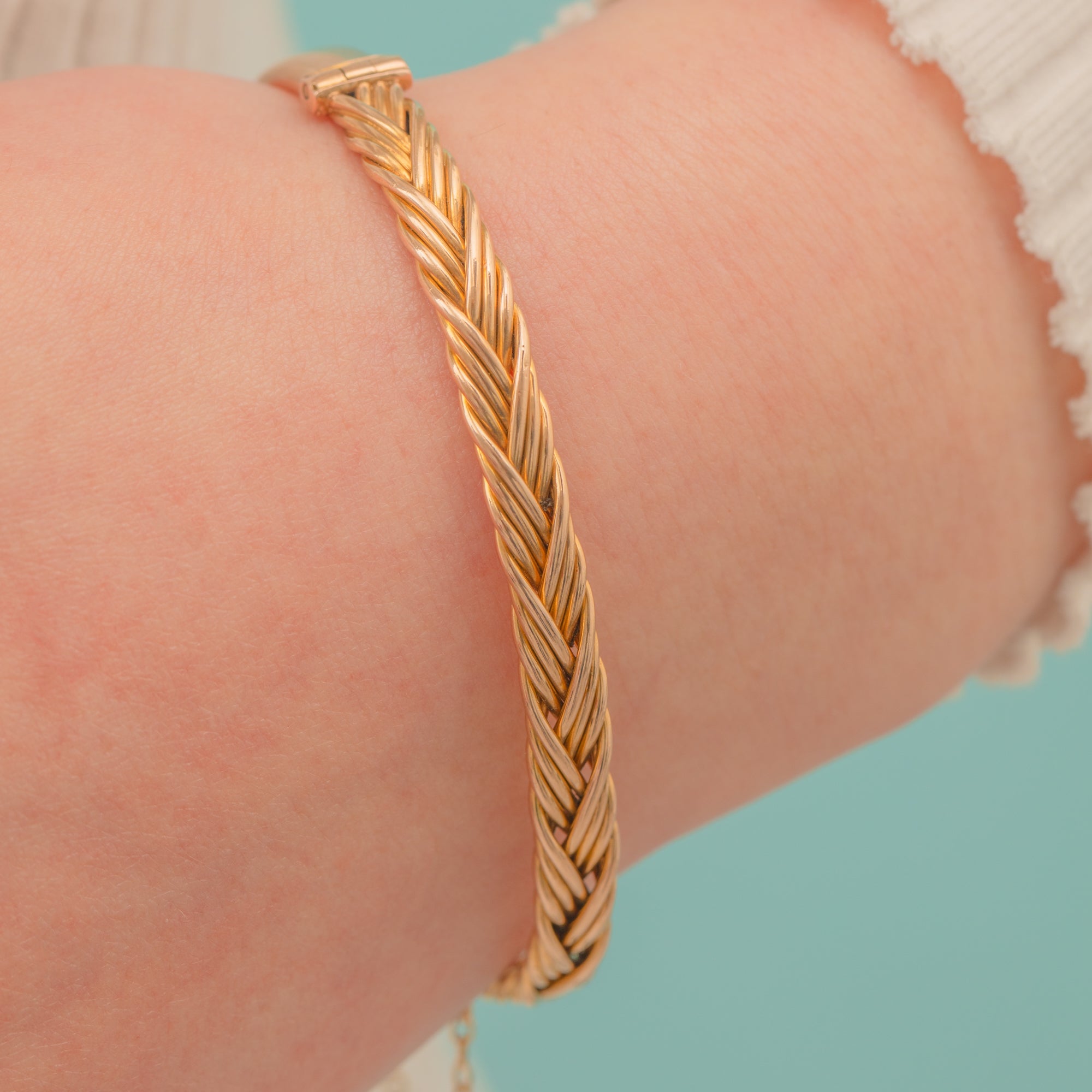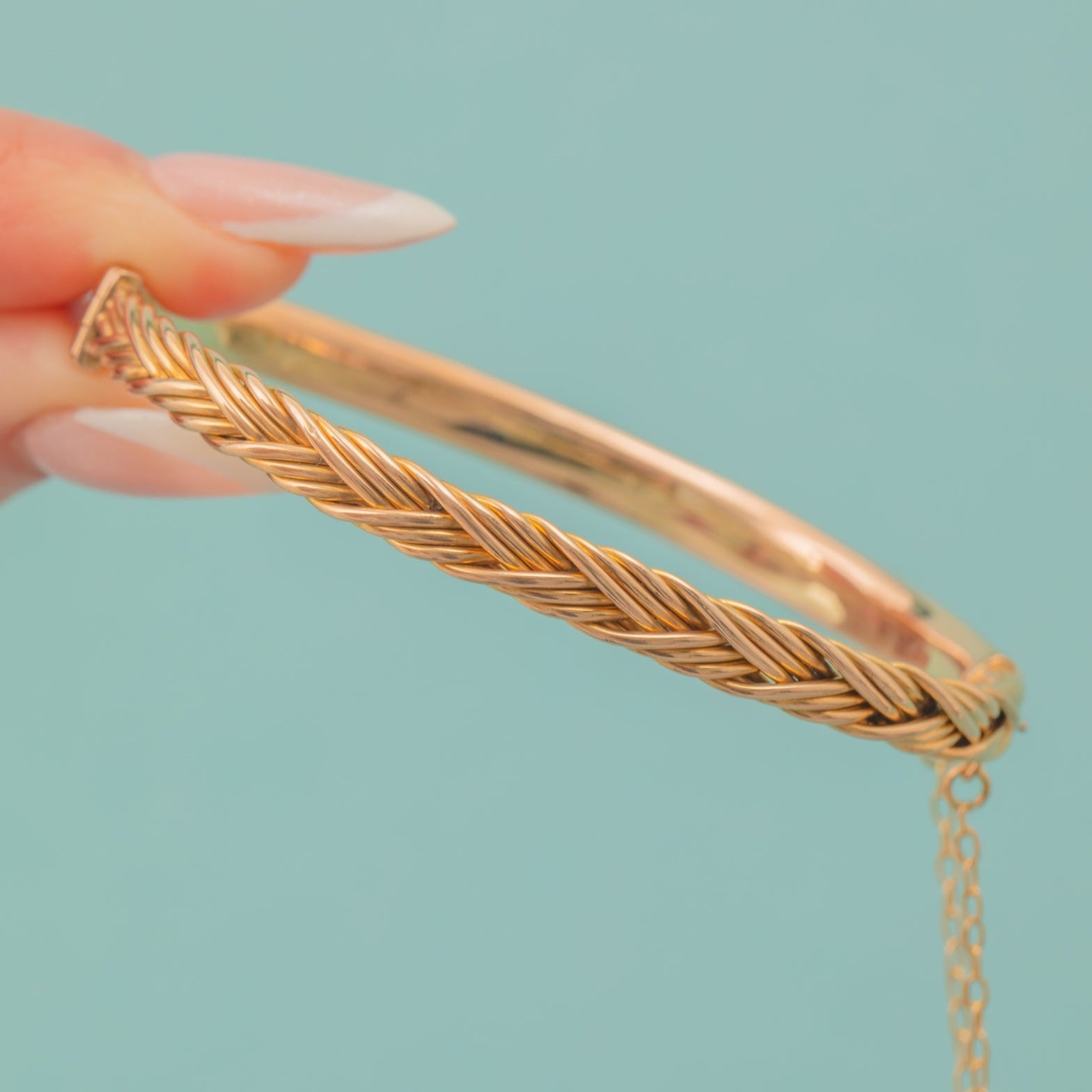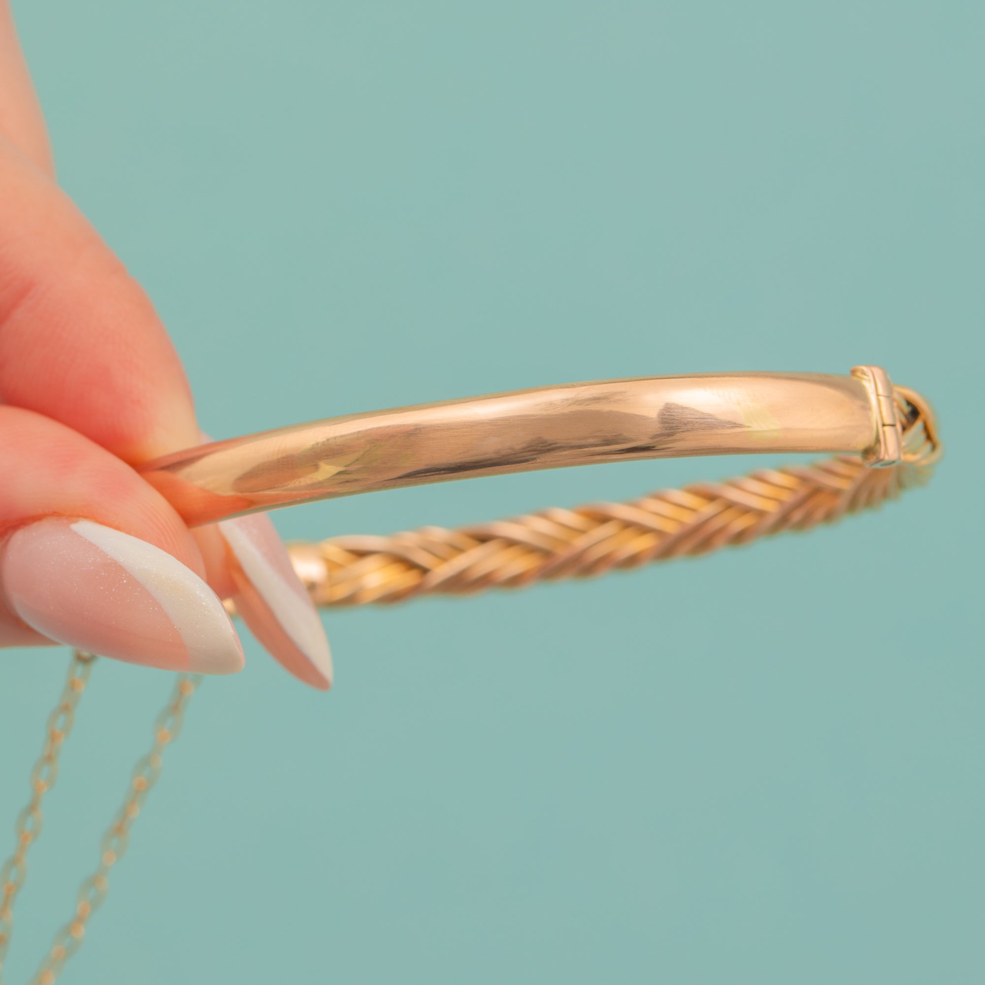 The perfect piece for adding a flash of Gold to your attire, this Victorian bangle sits snugly on your wrist and pairs well with other golden goodies. She features a woven plait design across the front, adding a wonderful texture and depth to the 9ct Gold bangle.