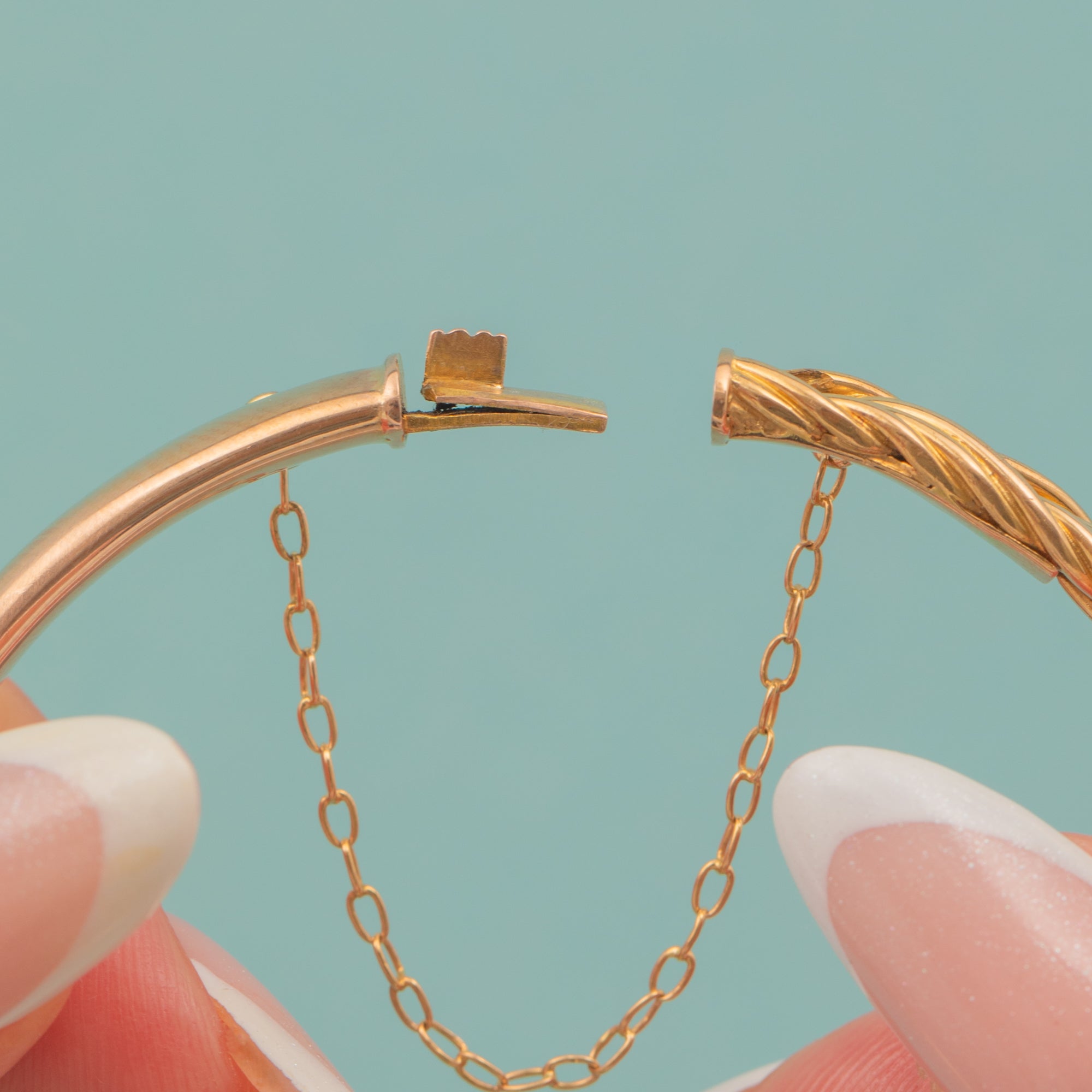 EXCELLENT: The Gold is glossy and warm, with very minor signs of wear commensurate with age. Closing with a nice 'click' and complete with a safety chain, you can wear this Victorian bangle with confidence.