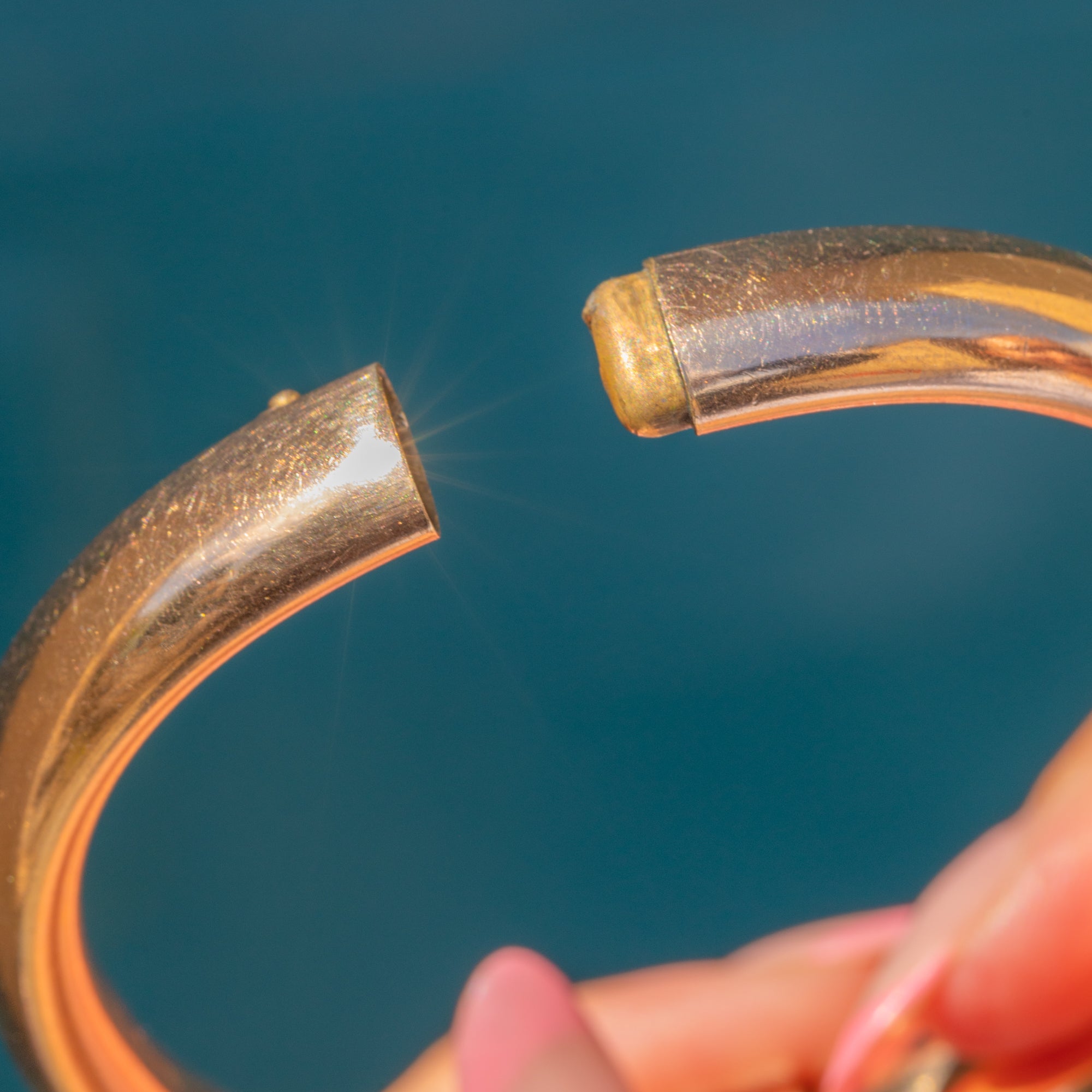 Inscribed 'Hattie Ray 9-9-1911' inside the bangle, she radiates antique charm and historic sentiment whilst retaining a classically timeless elegance. The 9ct rolled Gold is warm and buttery, with a beautiful glossy lustre that catches the light from every angle.