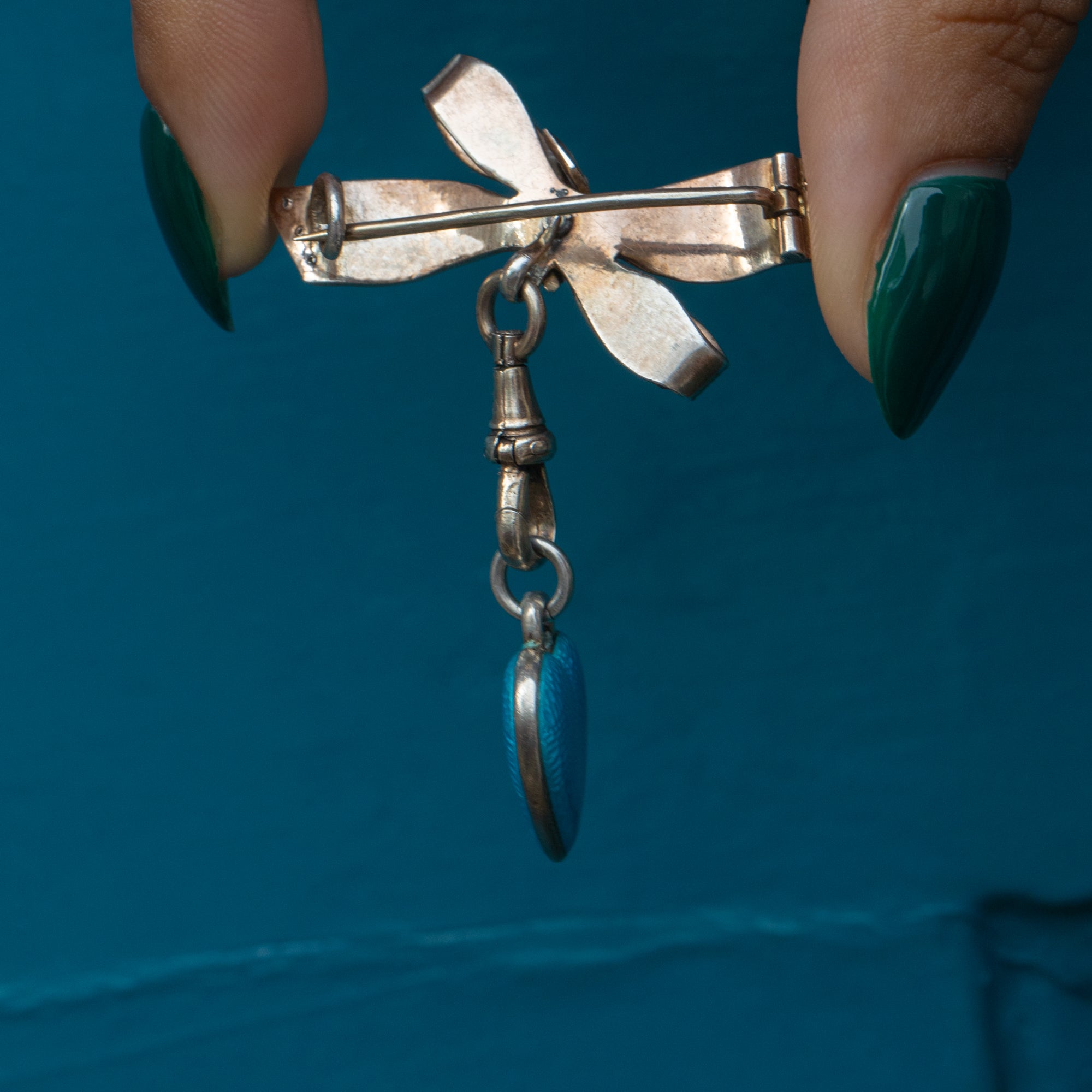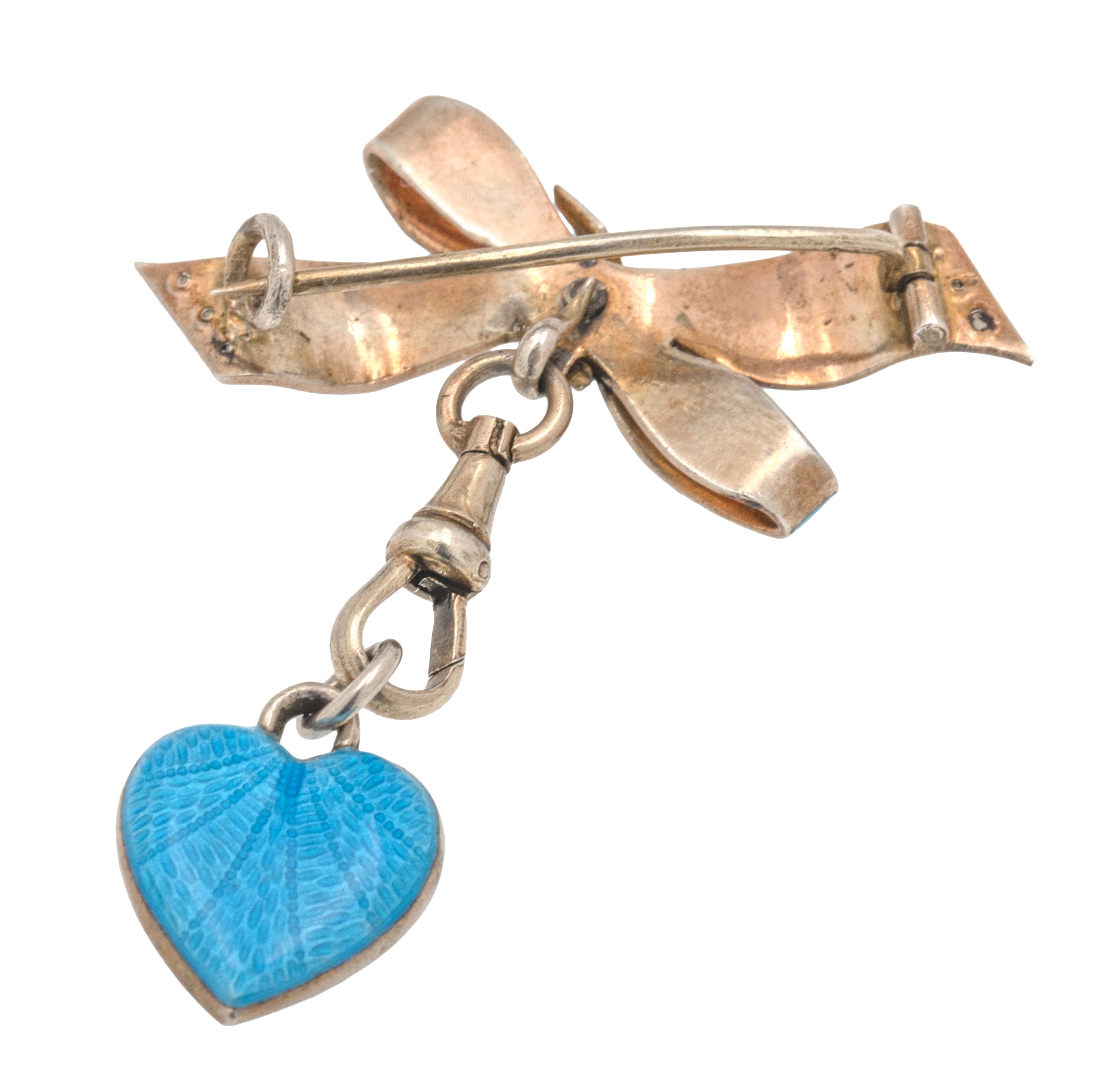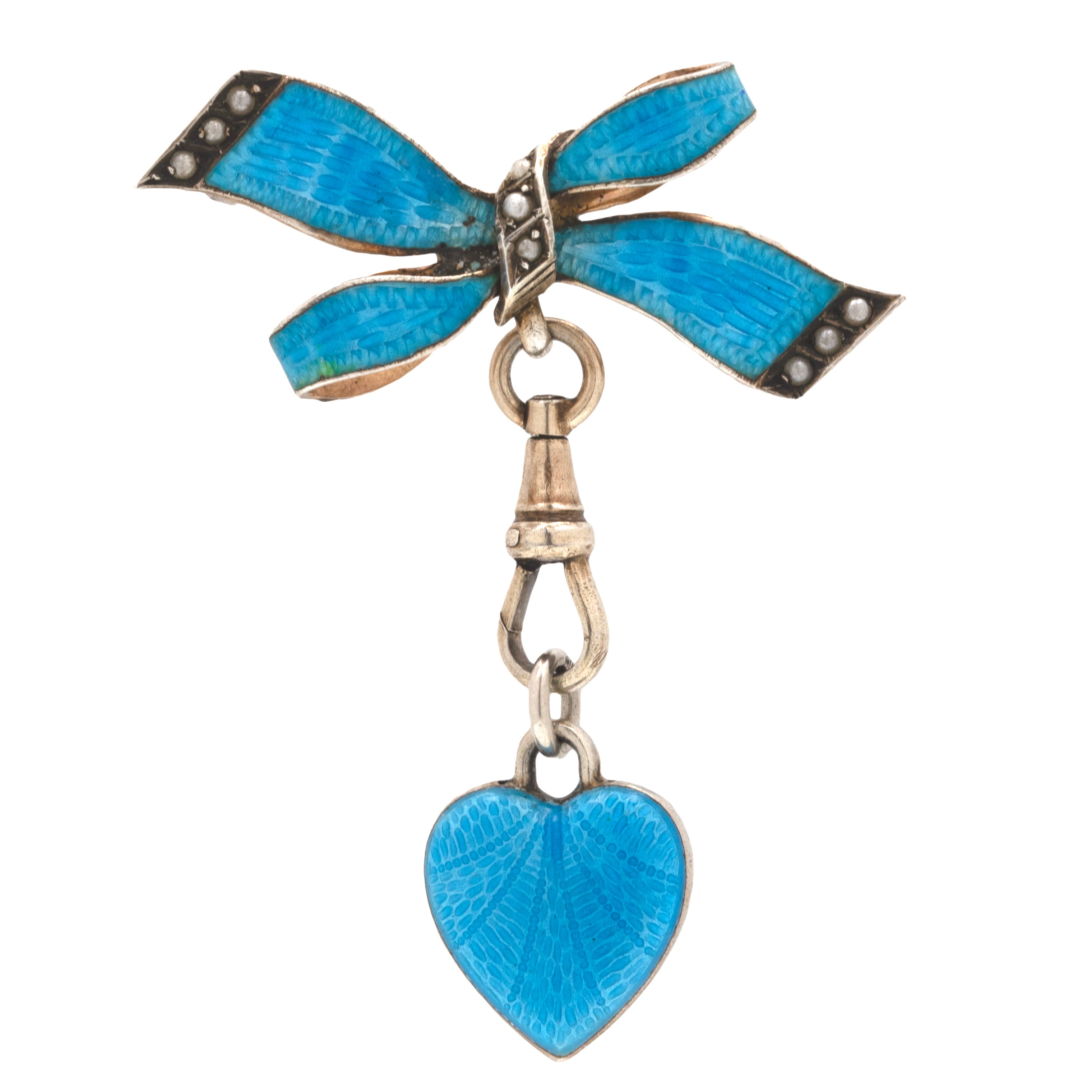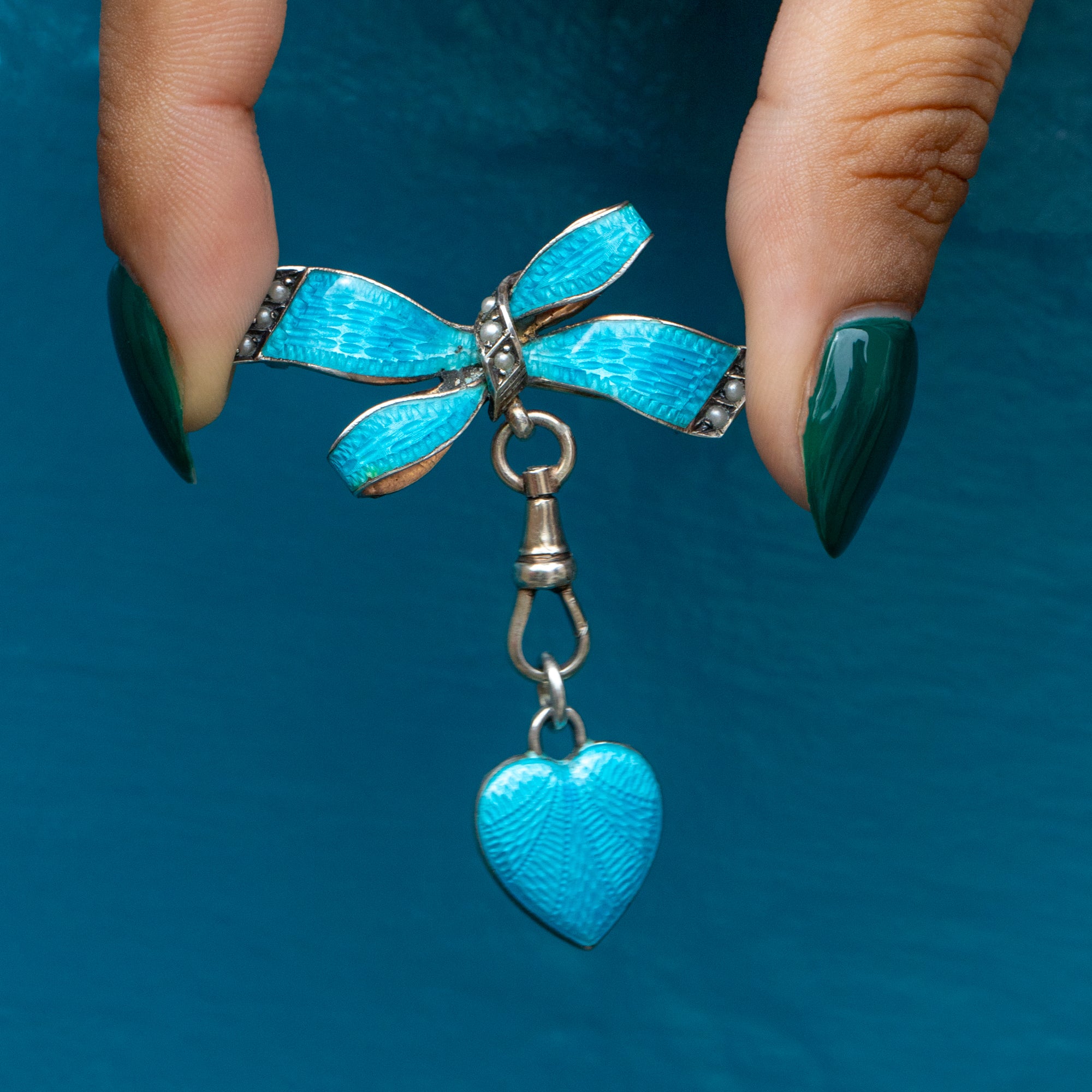 Broche antique en émail bleu et perle, avec pendentif cœur en émail bleu
