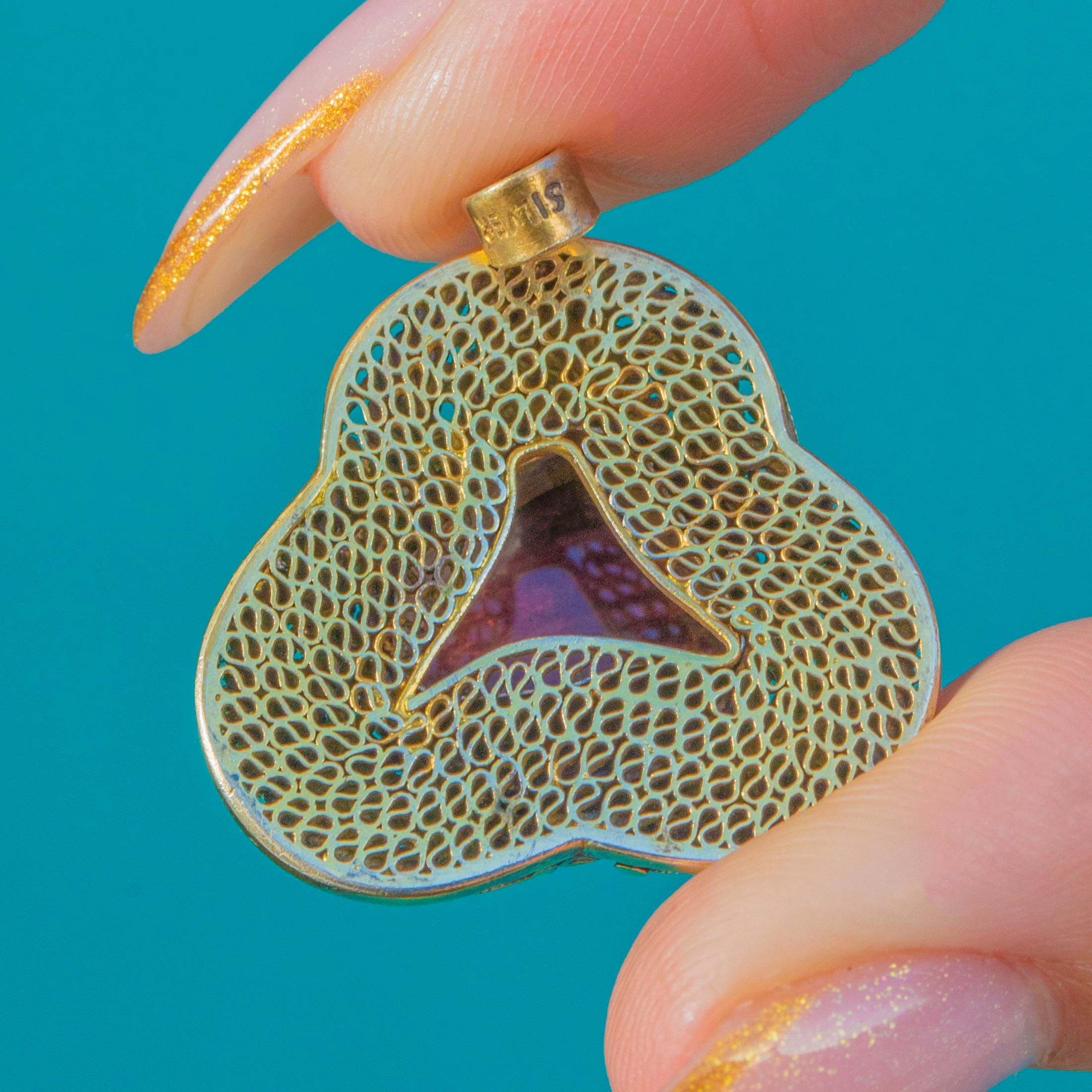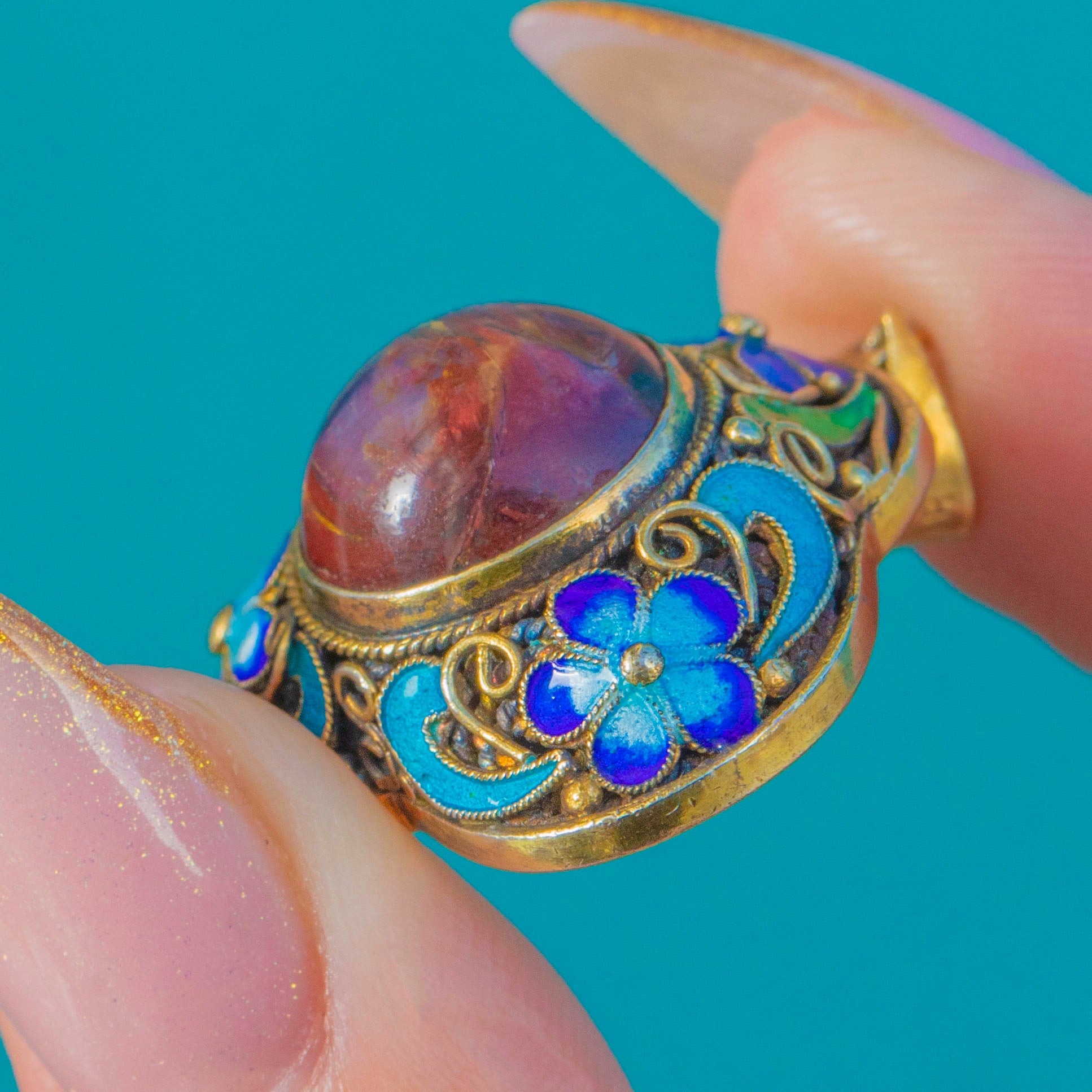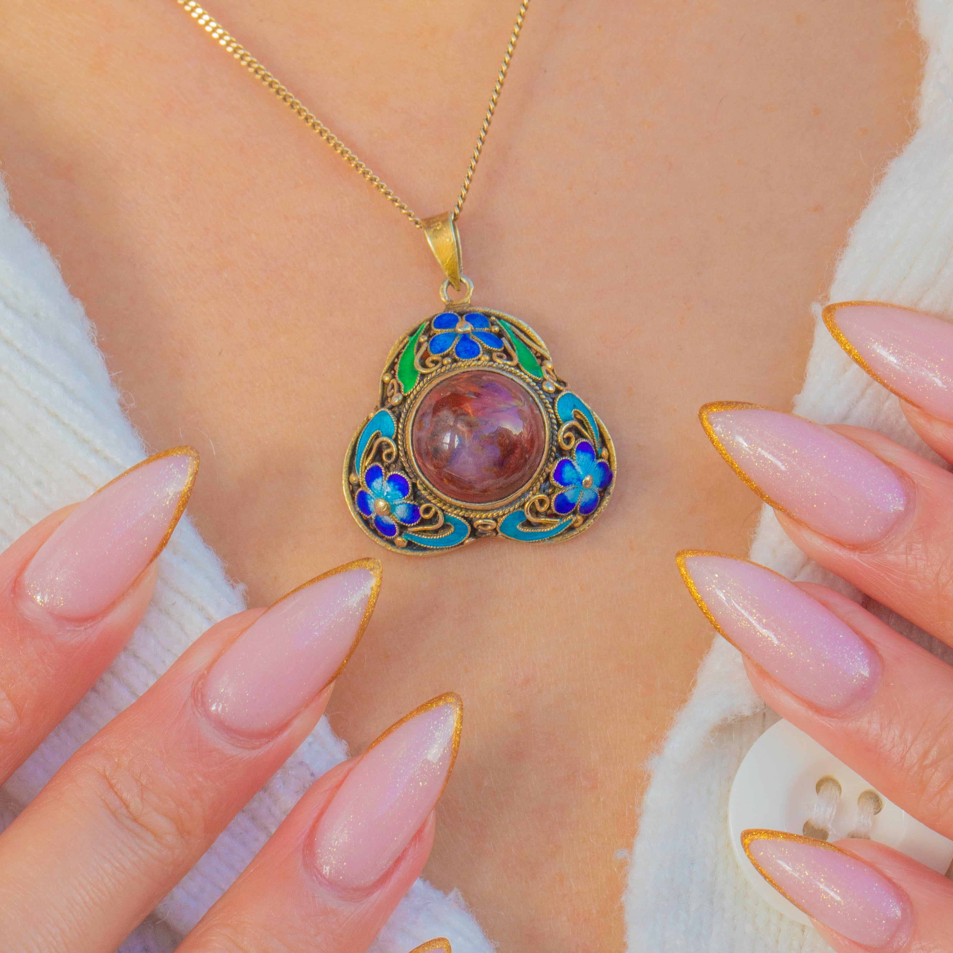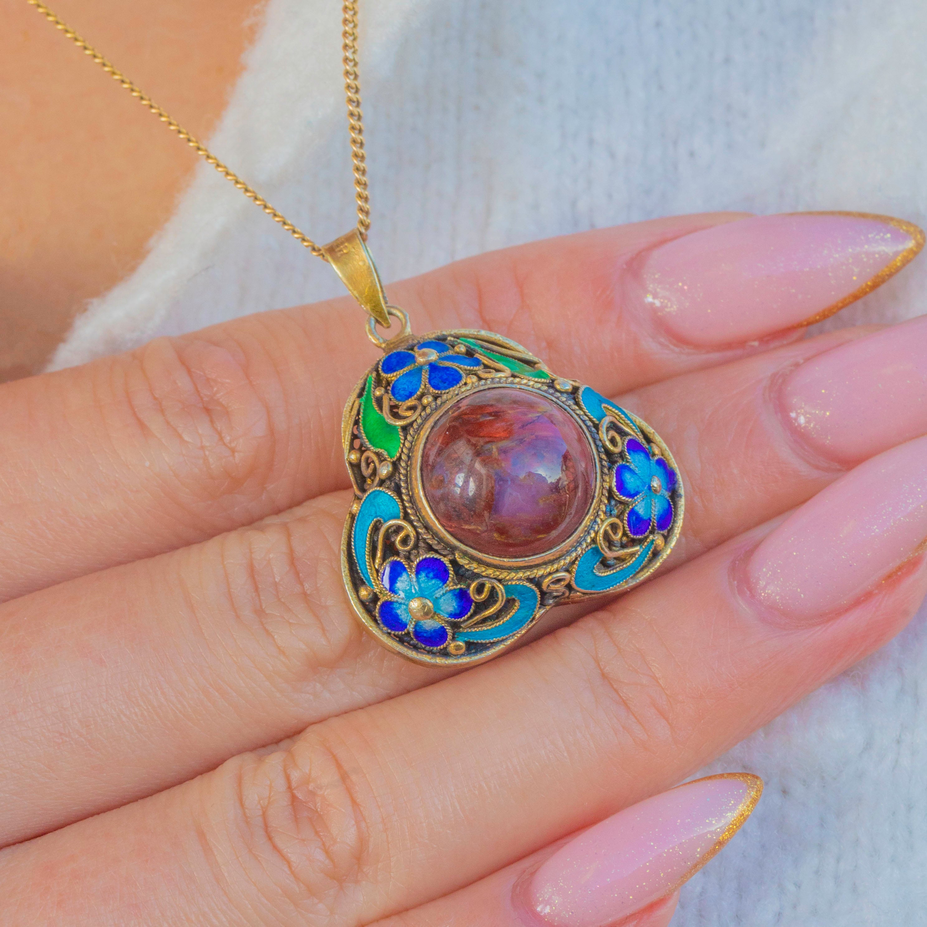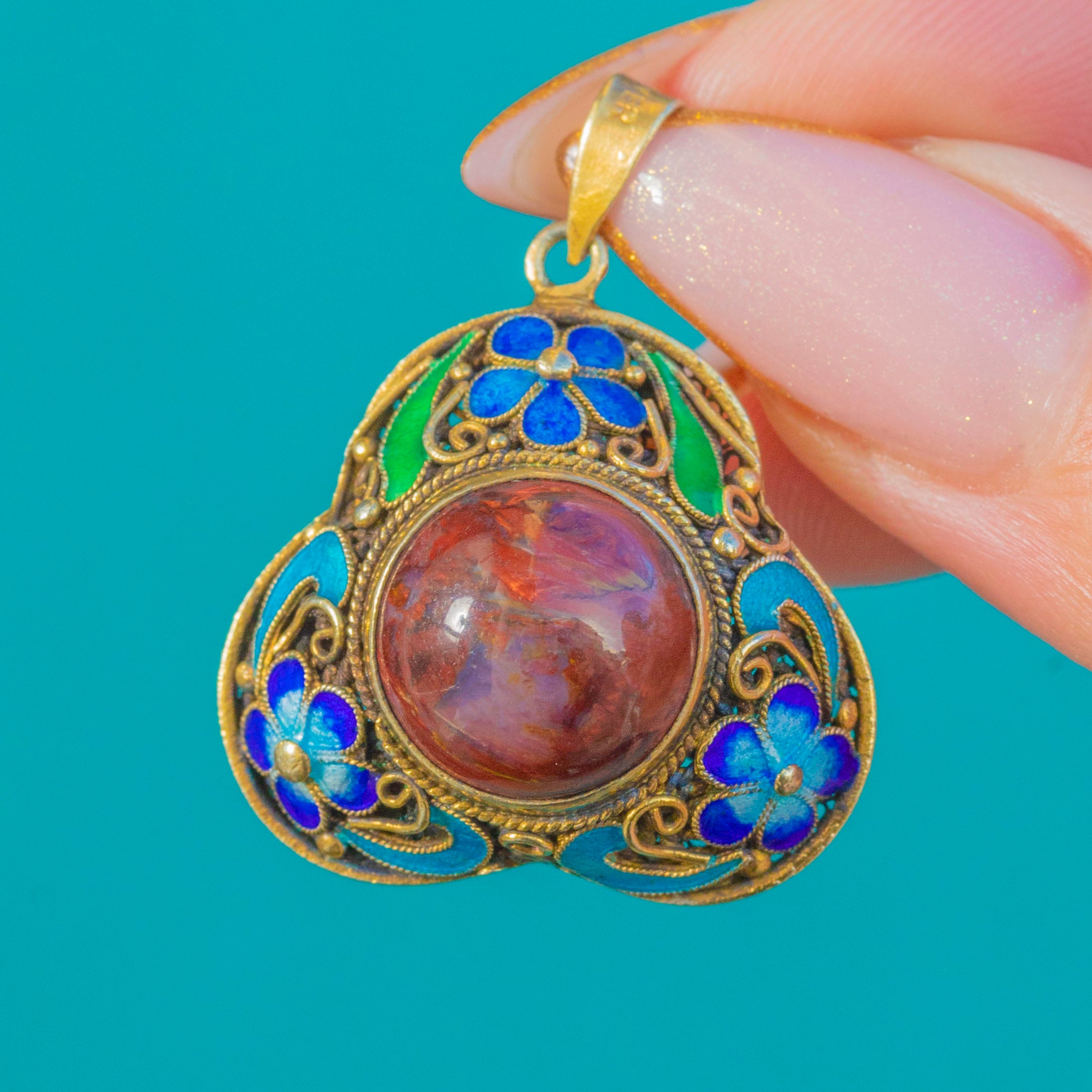 Pendentif ancien chinois en émail cloisonné, cabochon en verre rouge de Pékin Article ajouté