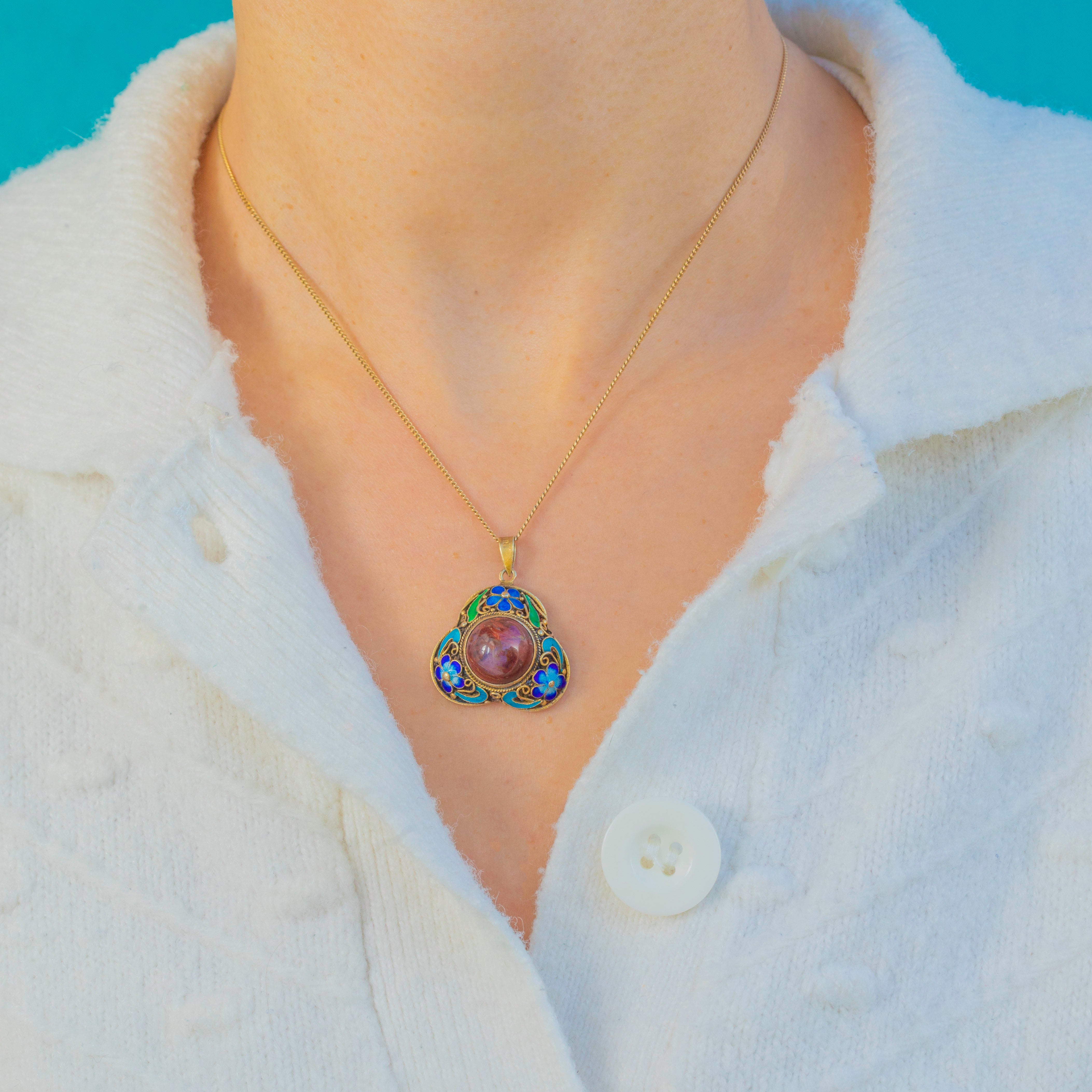 Pendentif ancien chinois en émail cloisonné, cabochon en verre rouge de Pékin