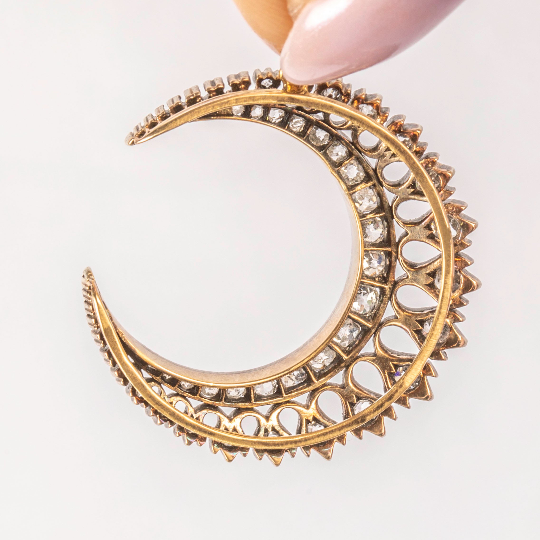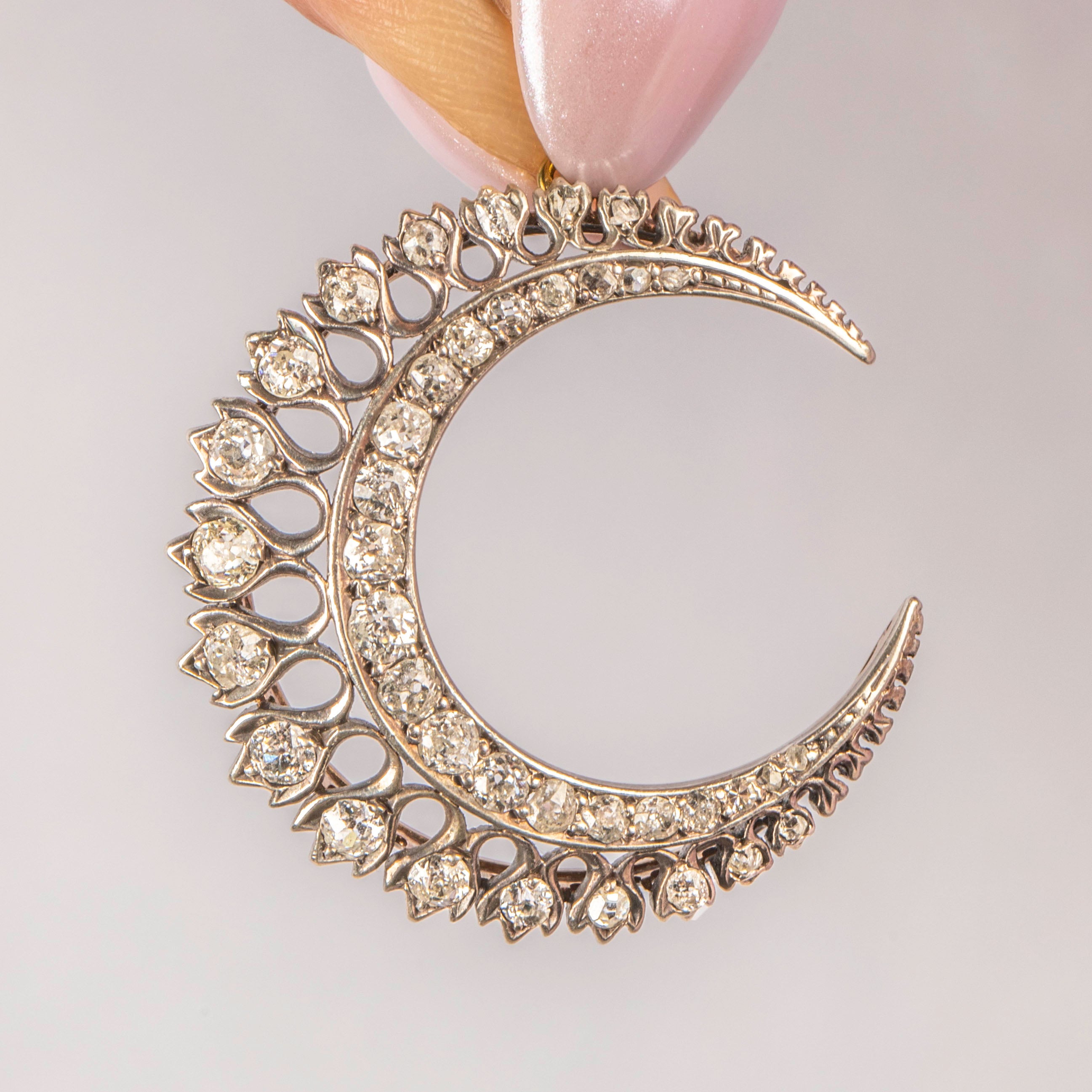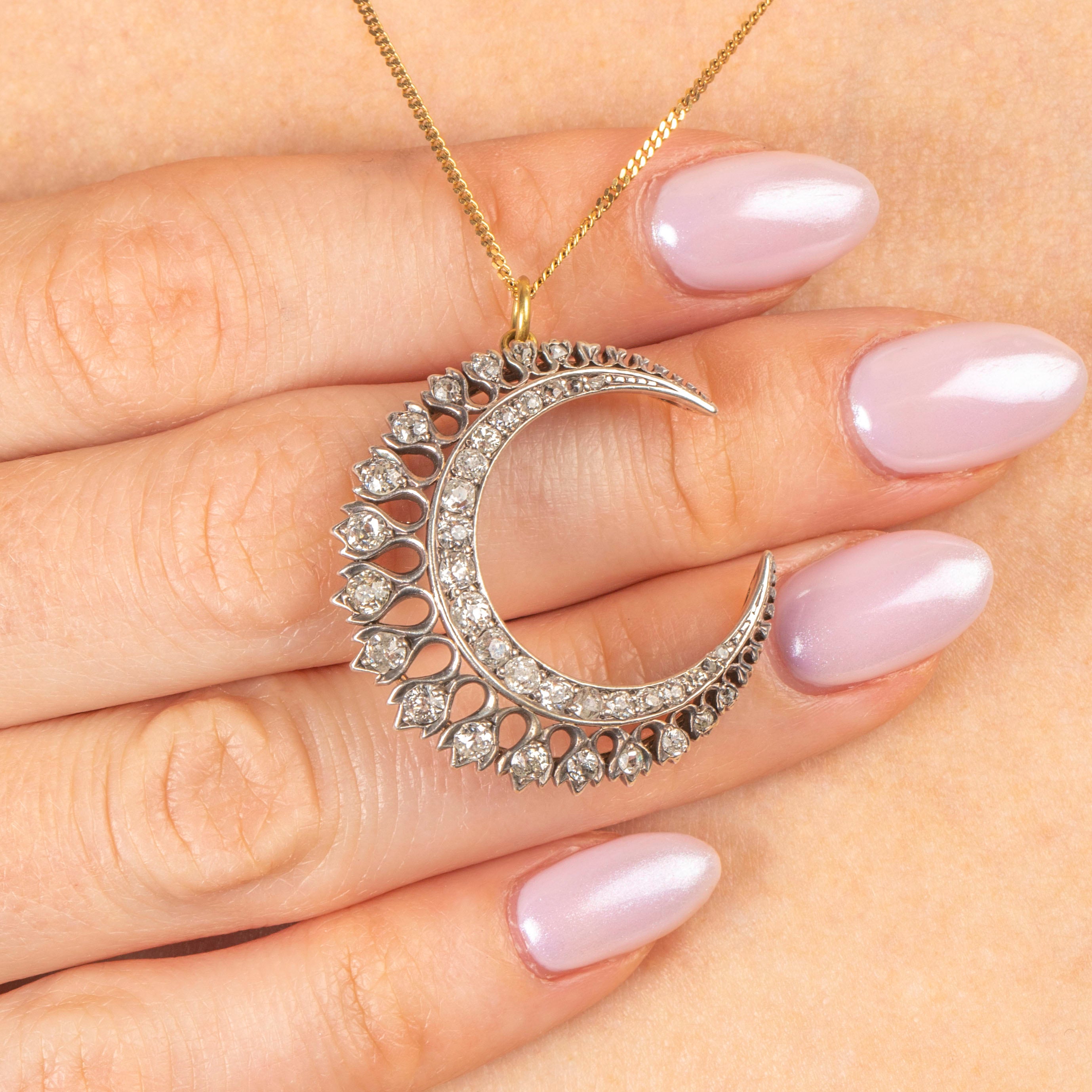 EXCELLENT. This antique Diamond crescent moon pendant is in immaculate condition. Each shimmering Diamond is bright and free from any chips or nibbles, securely set in their Silver settings. The Silver is bright and perfectly juxtaposed with the saturated rich 15ct Gold, adding to her antique charm.