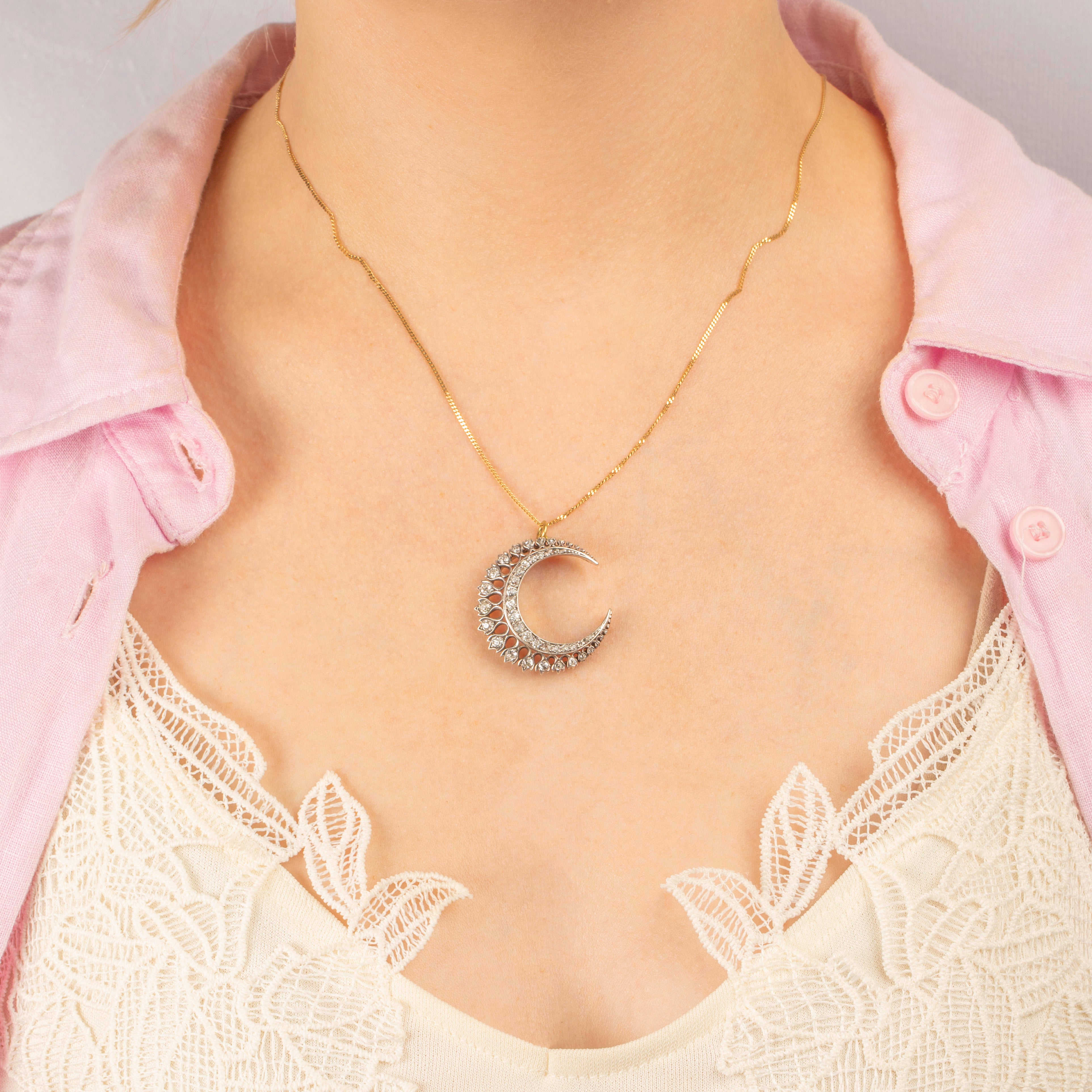 Antique Diamond Crescent Moon Pendant 1.65ct, 15ct Gold & Silver