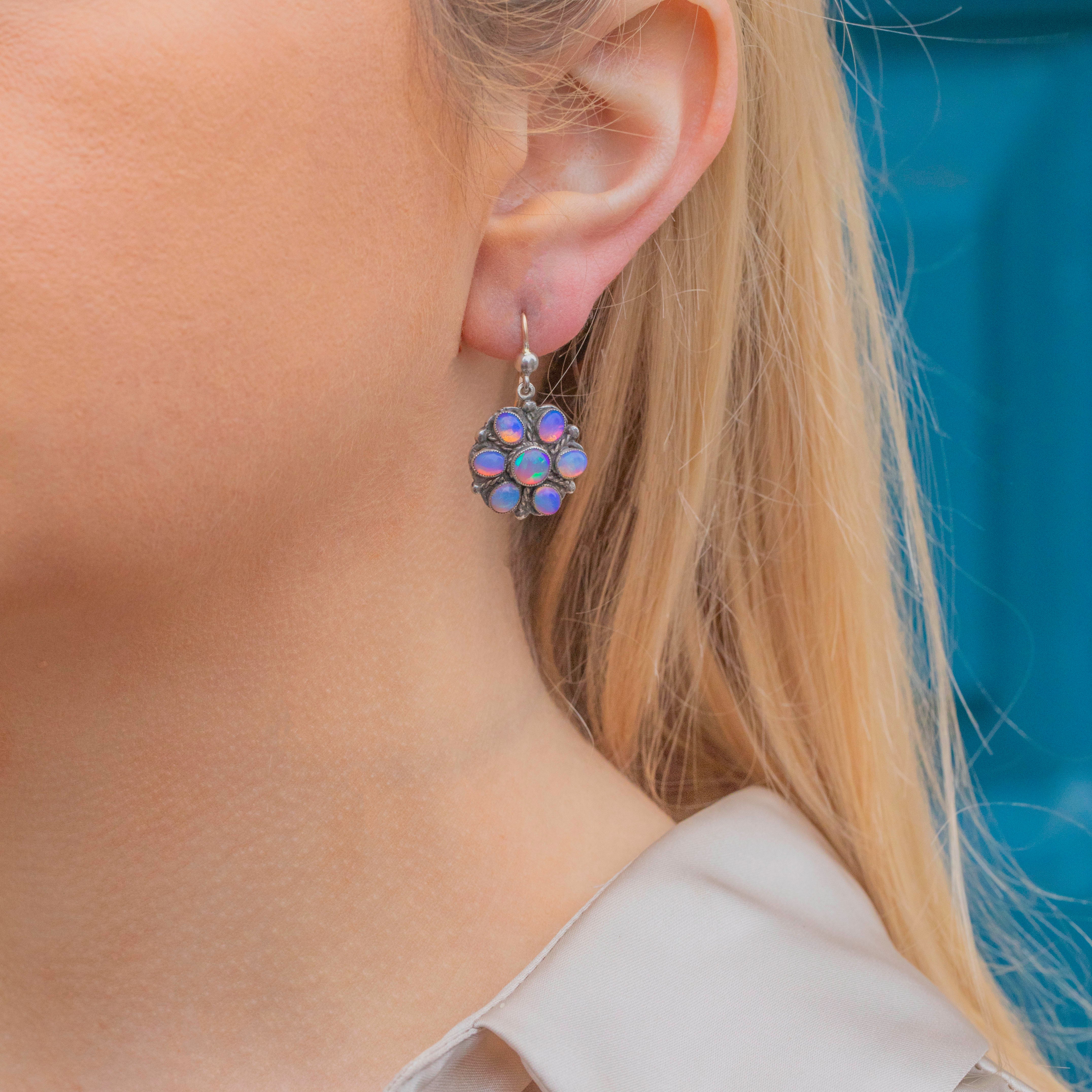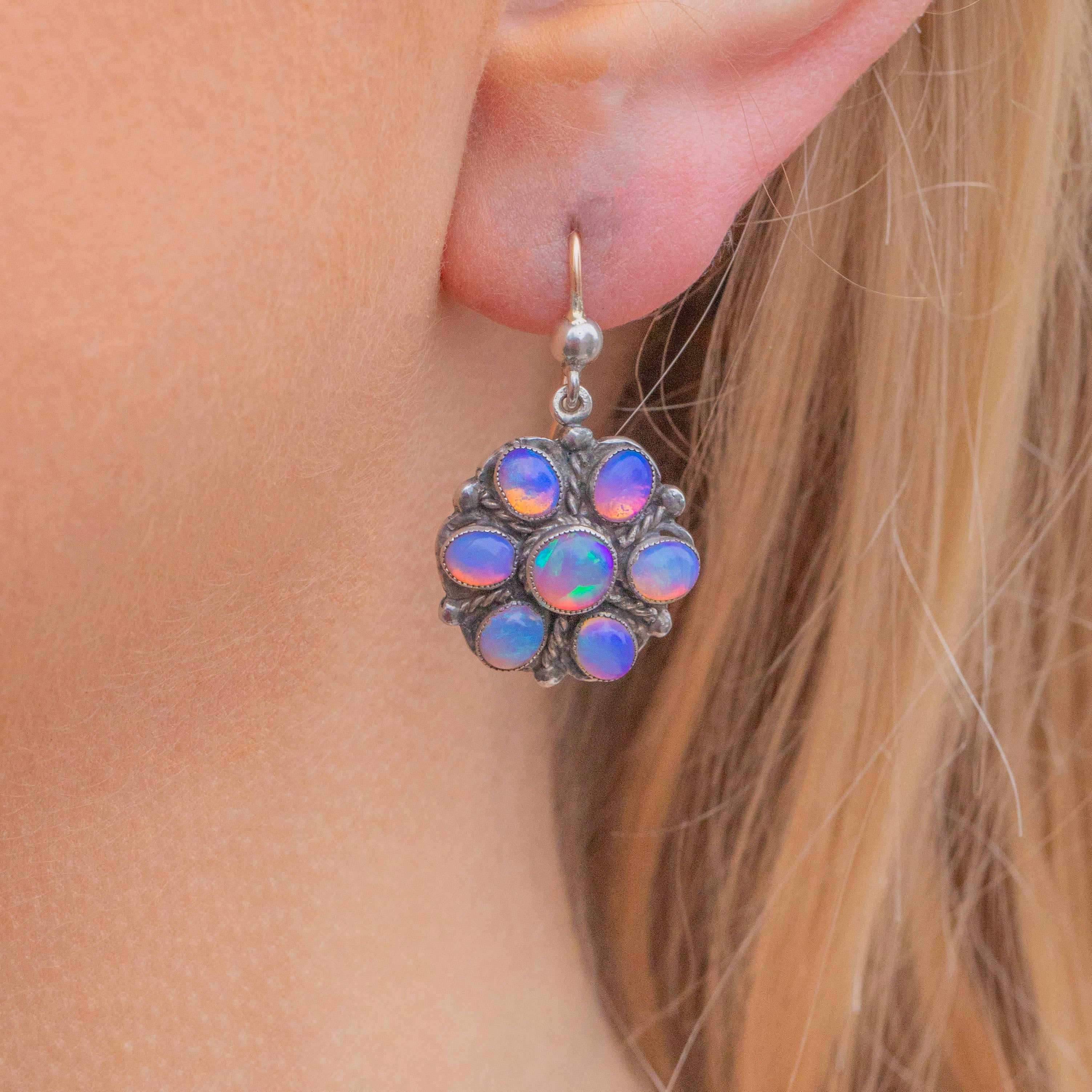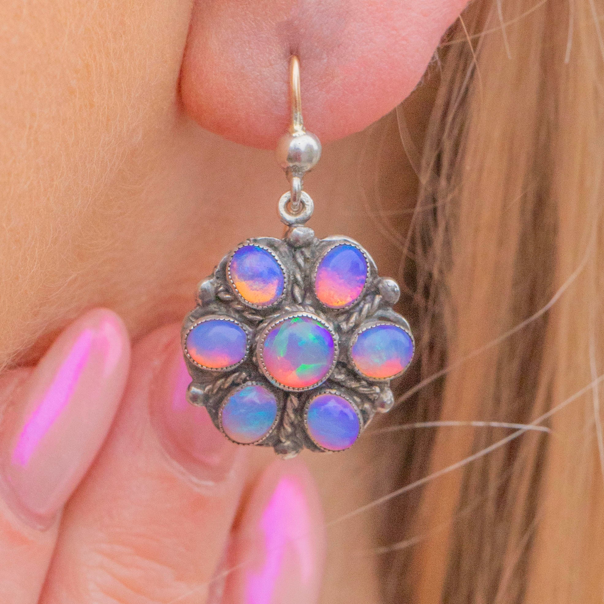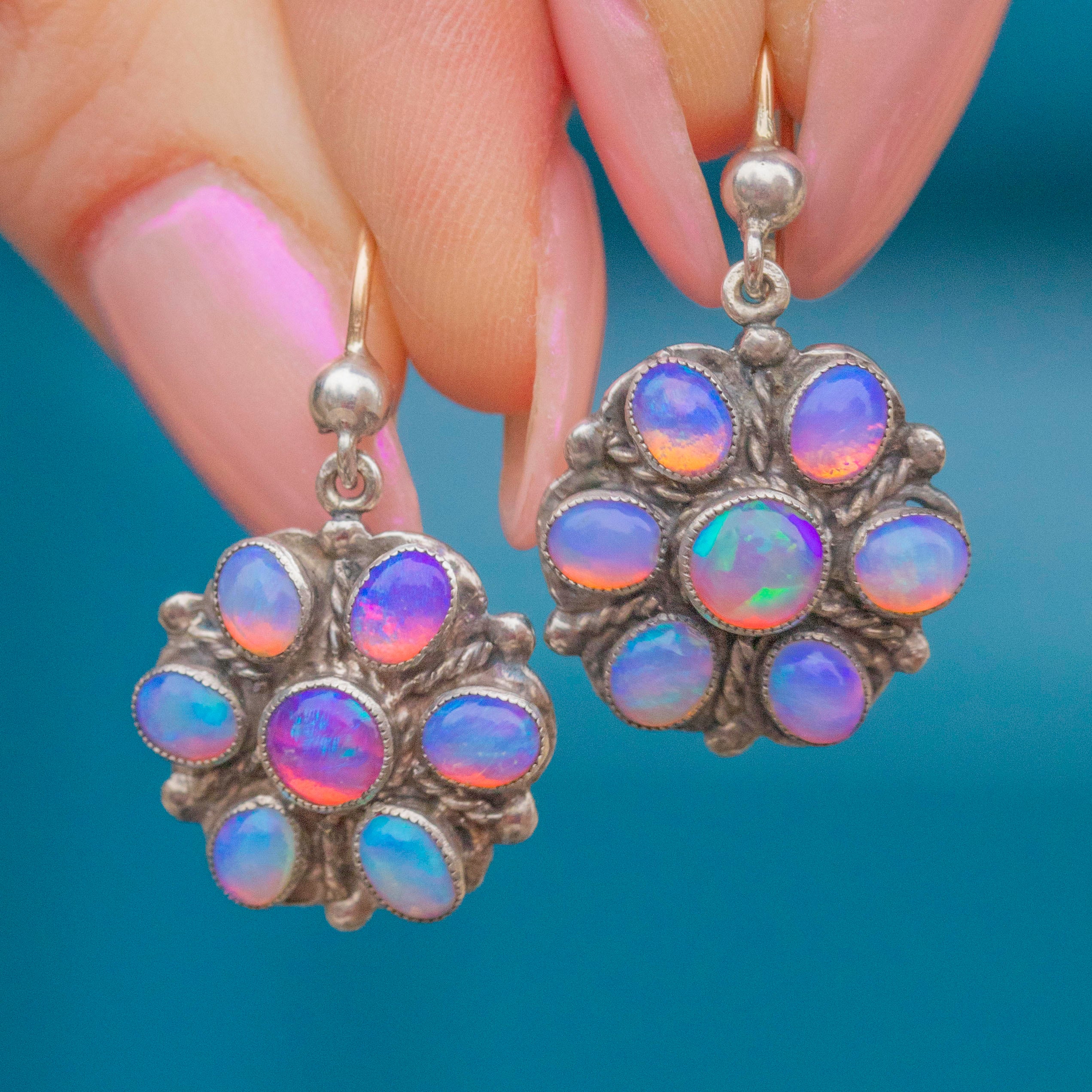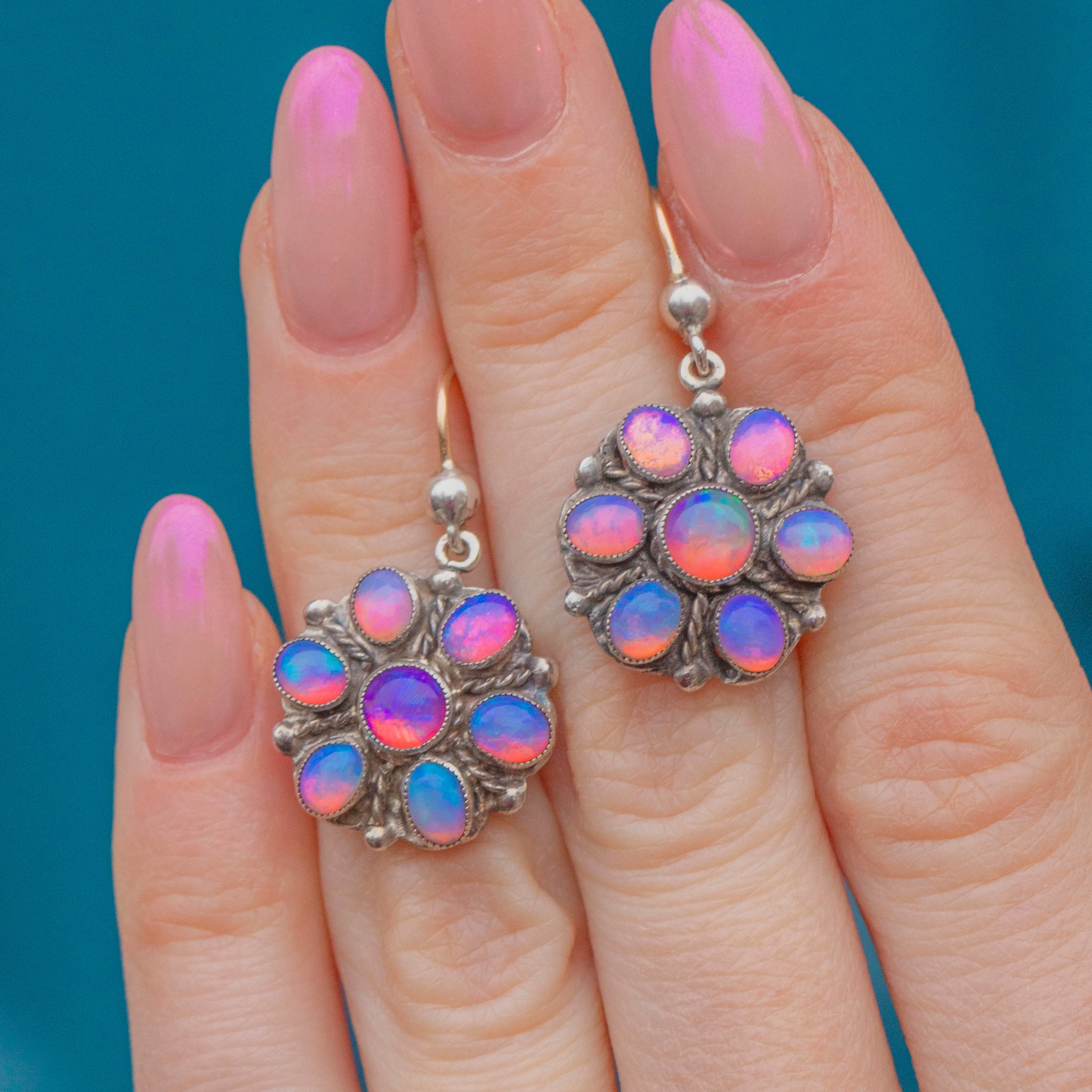 Crafted from lustrous Silver, these Austro Hungarian drop earrings boast seventeen stunning Dragon's Breath, radiating the most adorable pink and purple hues as they catch the light. Each stone is arranged in a floral design, giving these antique cluster earrings an alluring charm!