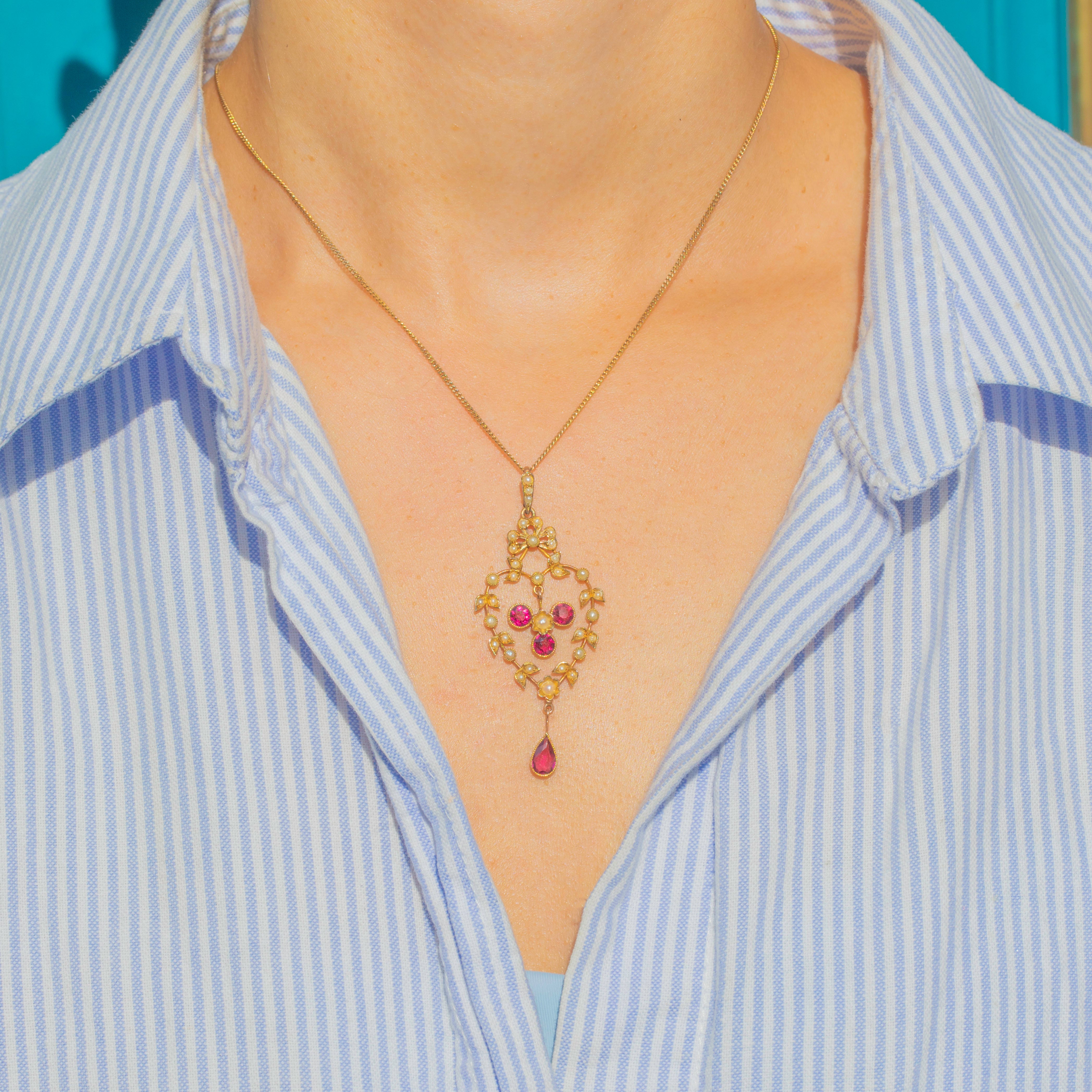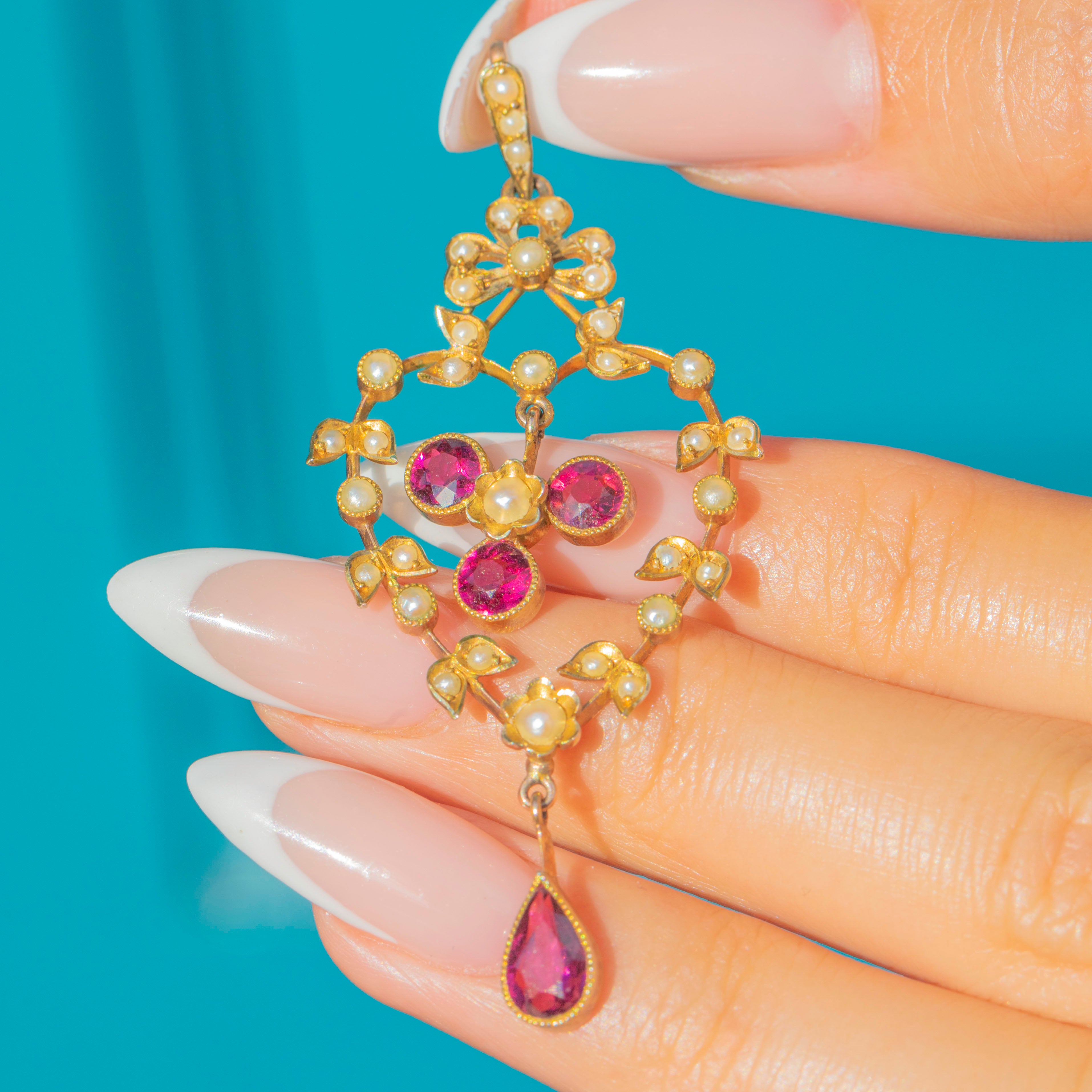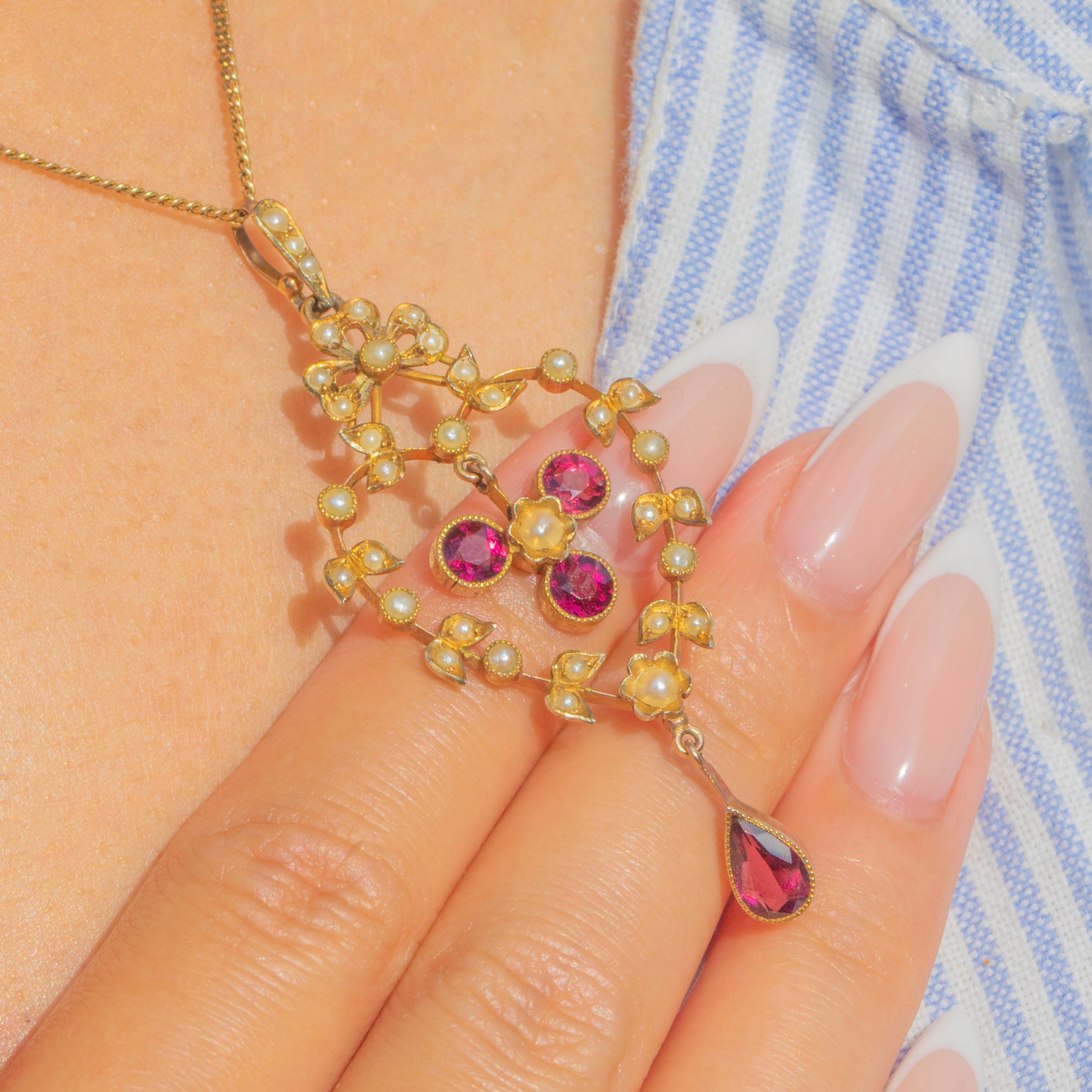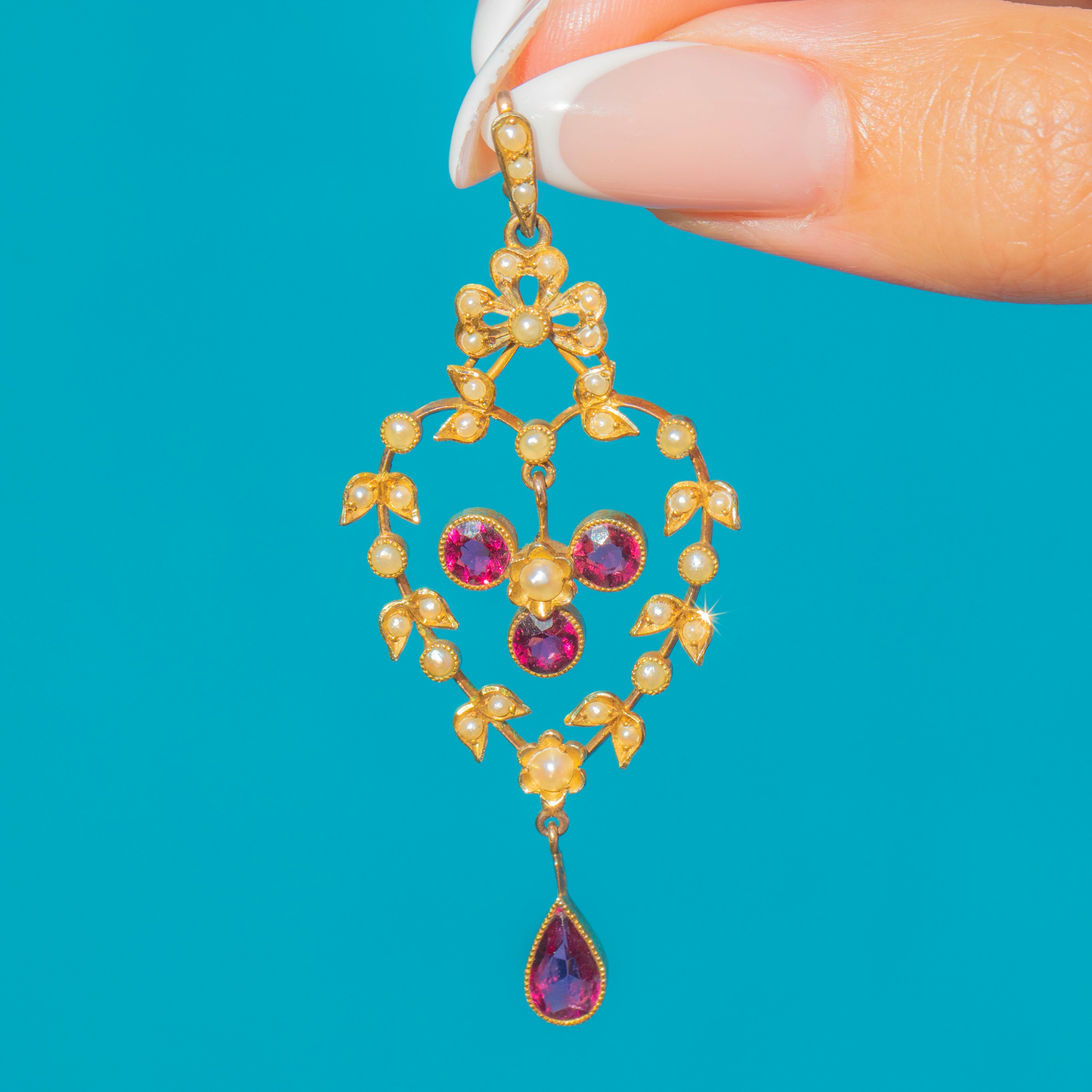 Antique Edwardian 9ct Gold Garnet & Pearl Garland Drop Pendant, c.1900