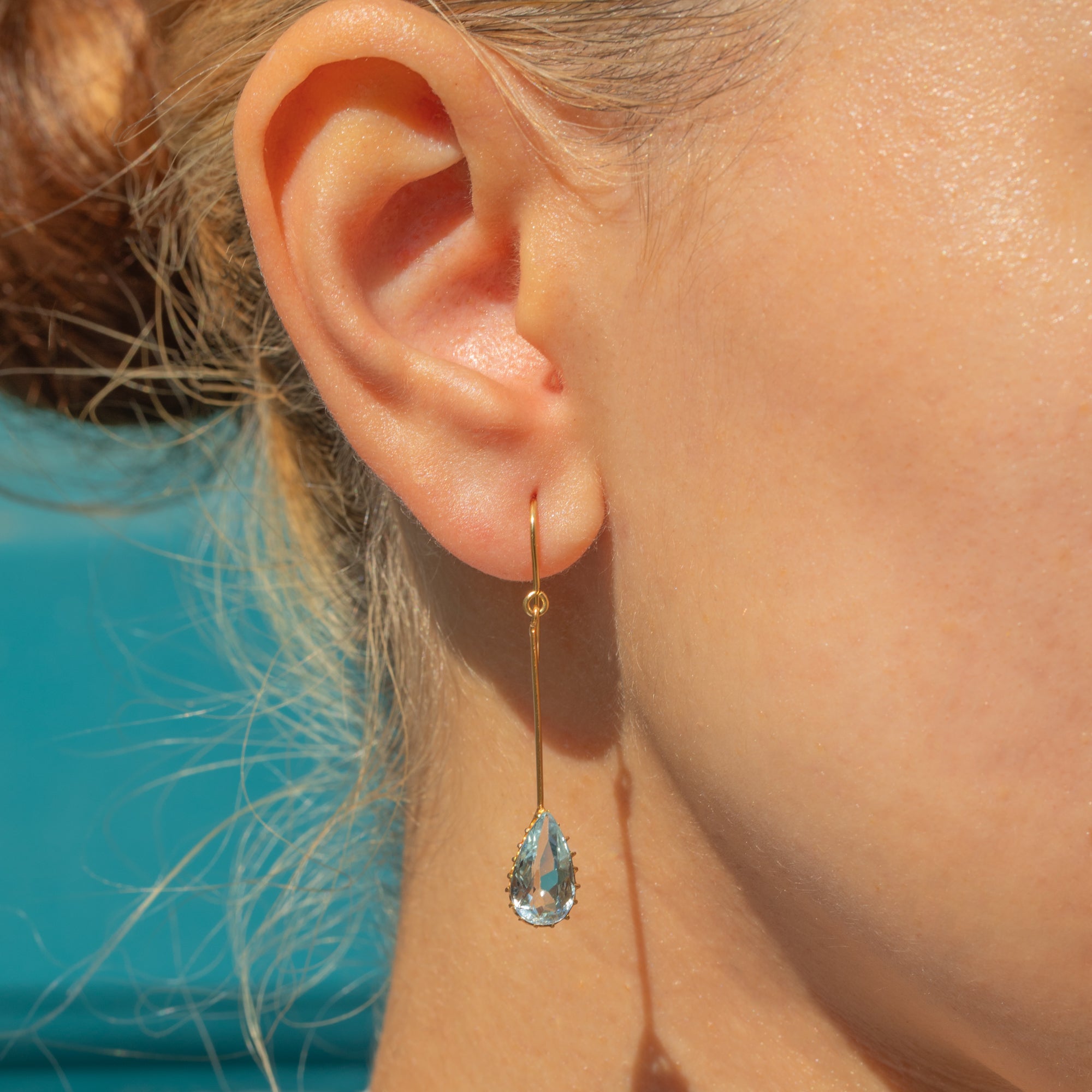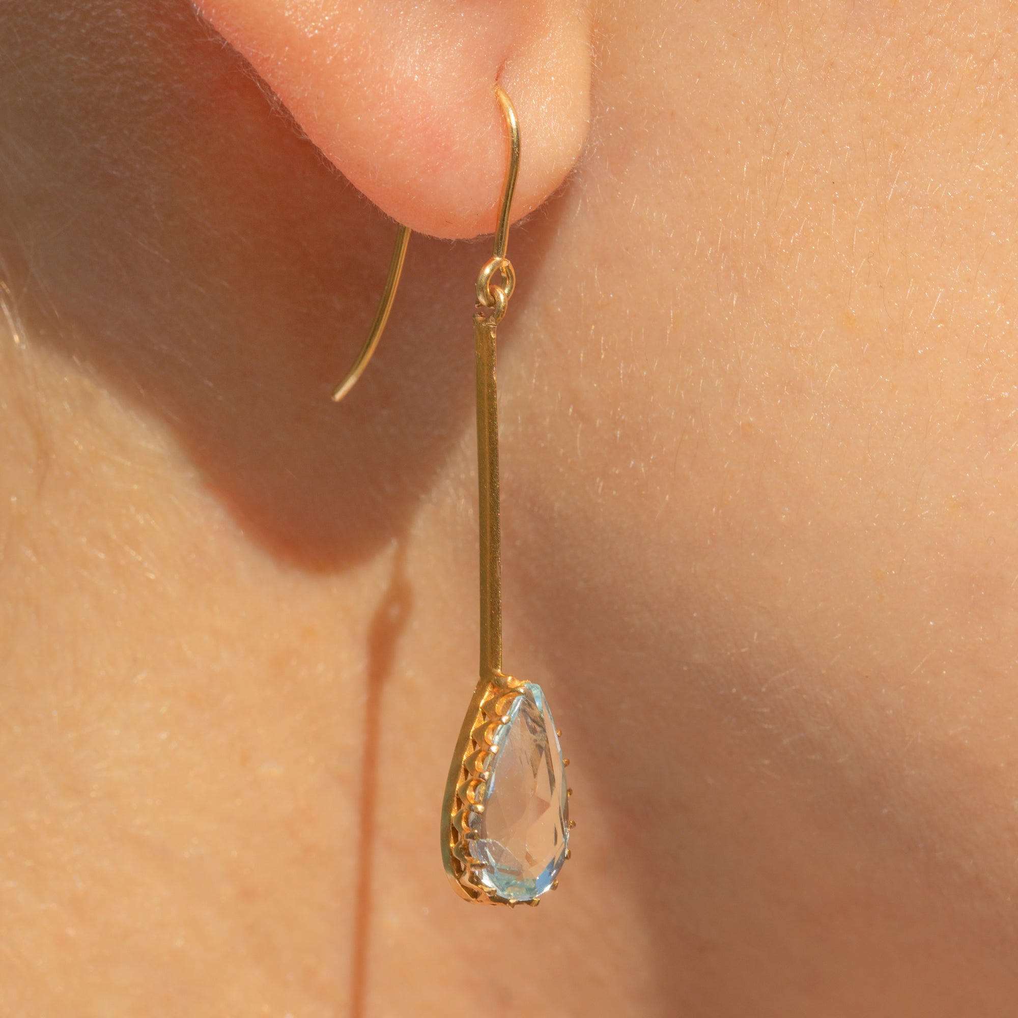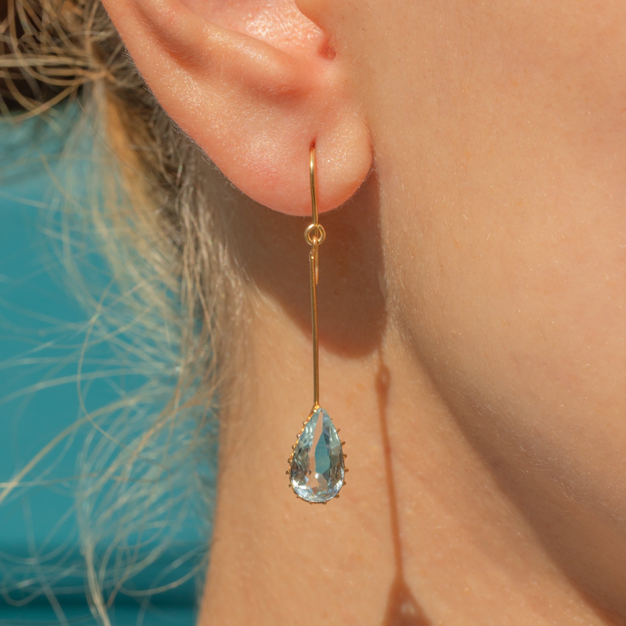 The Aquamarine drops have a lovely crisp hue, perfectly complemented by the glossy 9ct Gold settings and dance with movement as they suspend from your lobes.