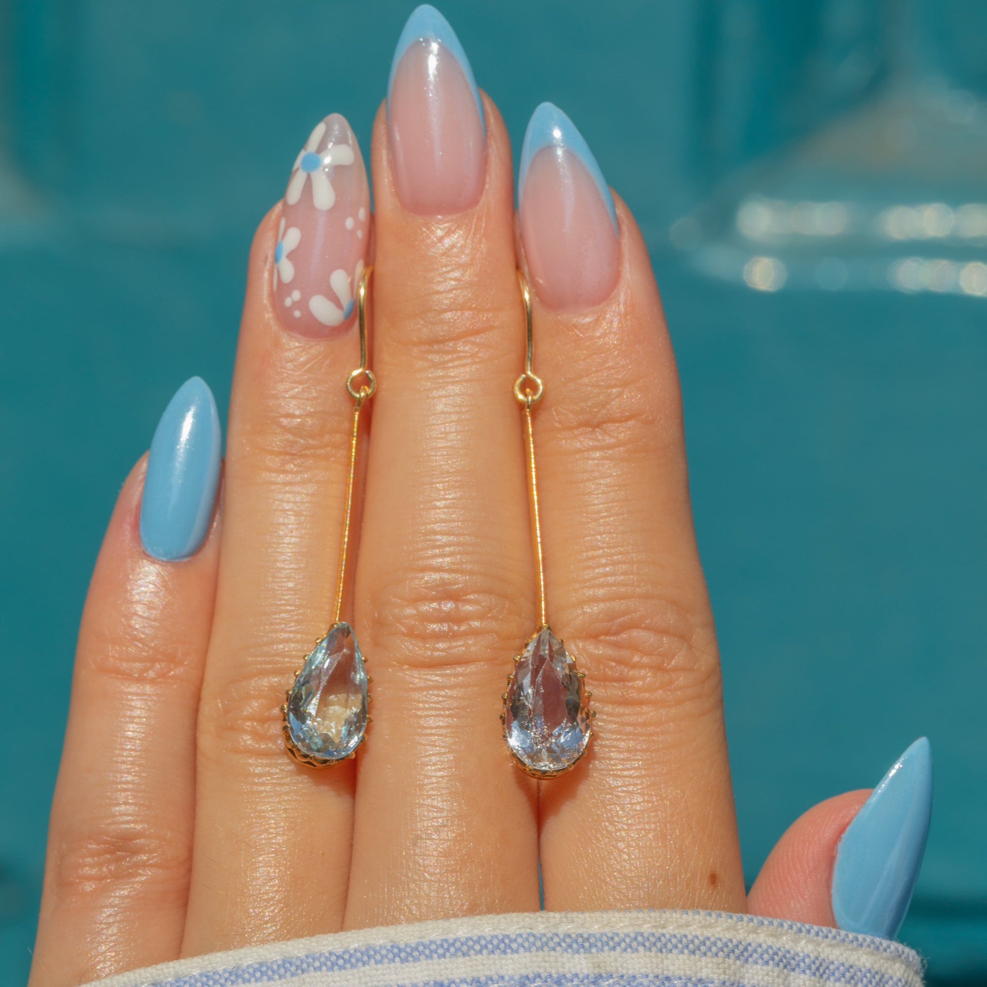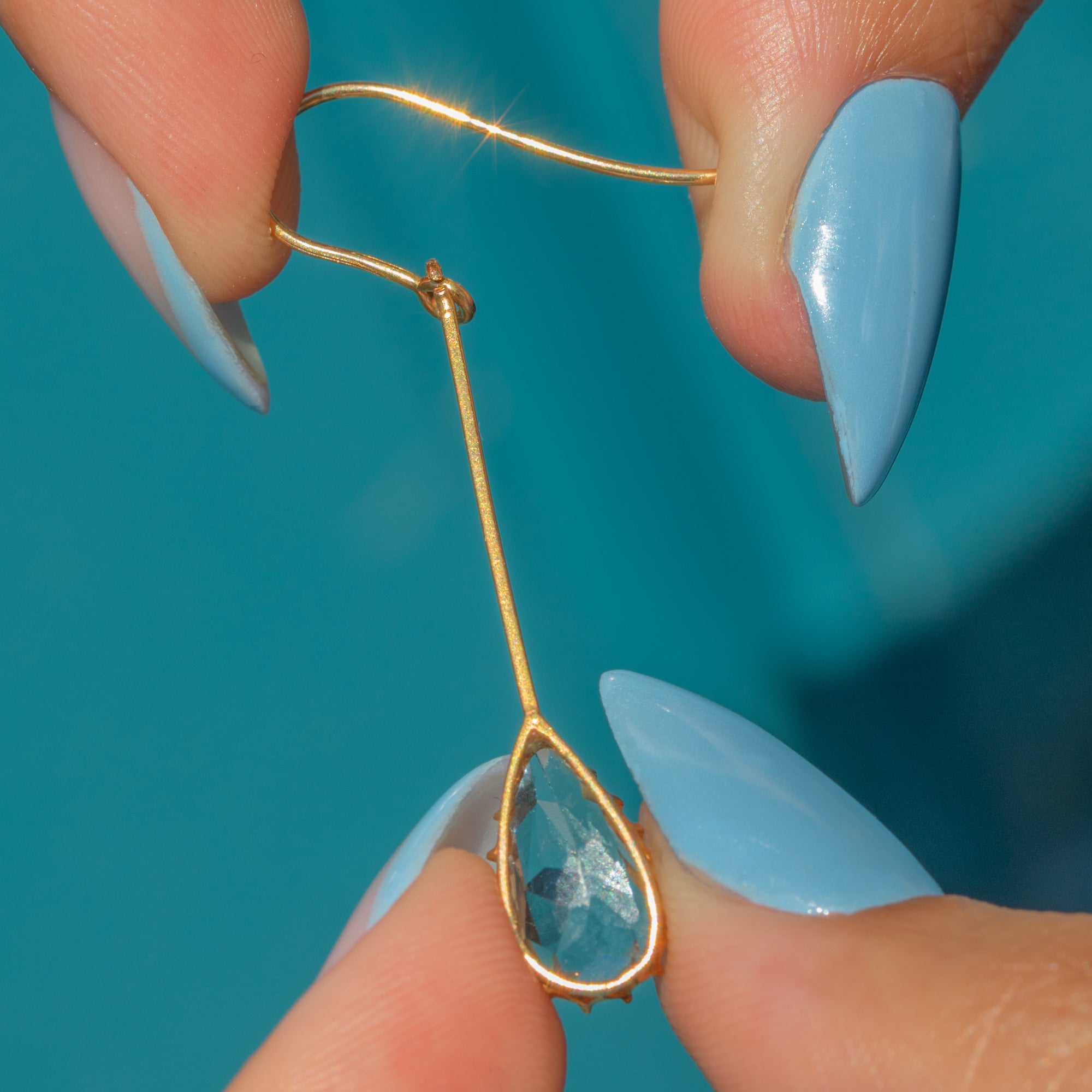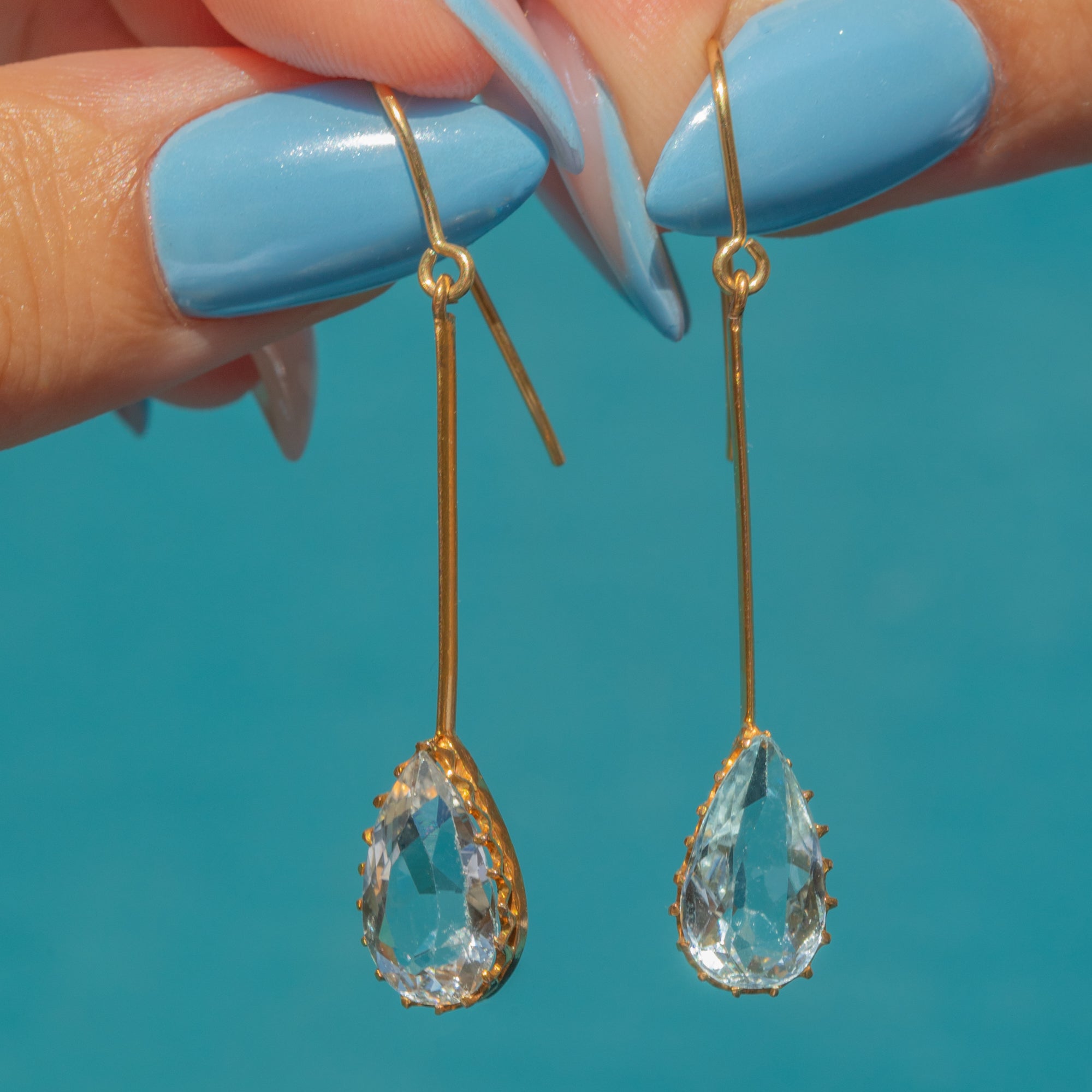 The Aquamarine drops have a lovely crisp hue, perfectly complemented by the glossy 9ct Gold settings and dance with movement as they suspend from your lobes.