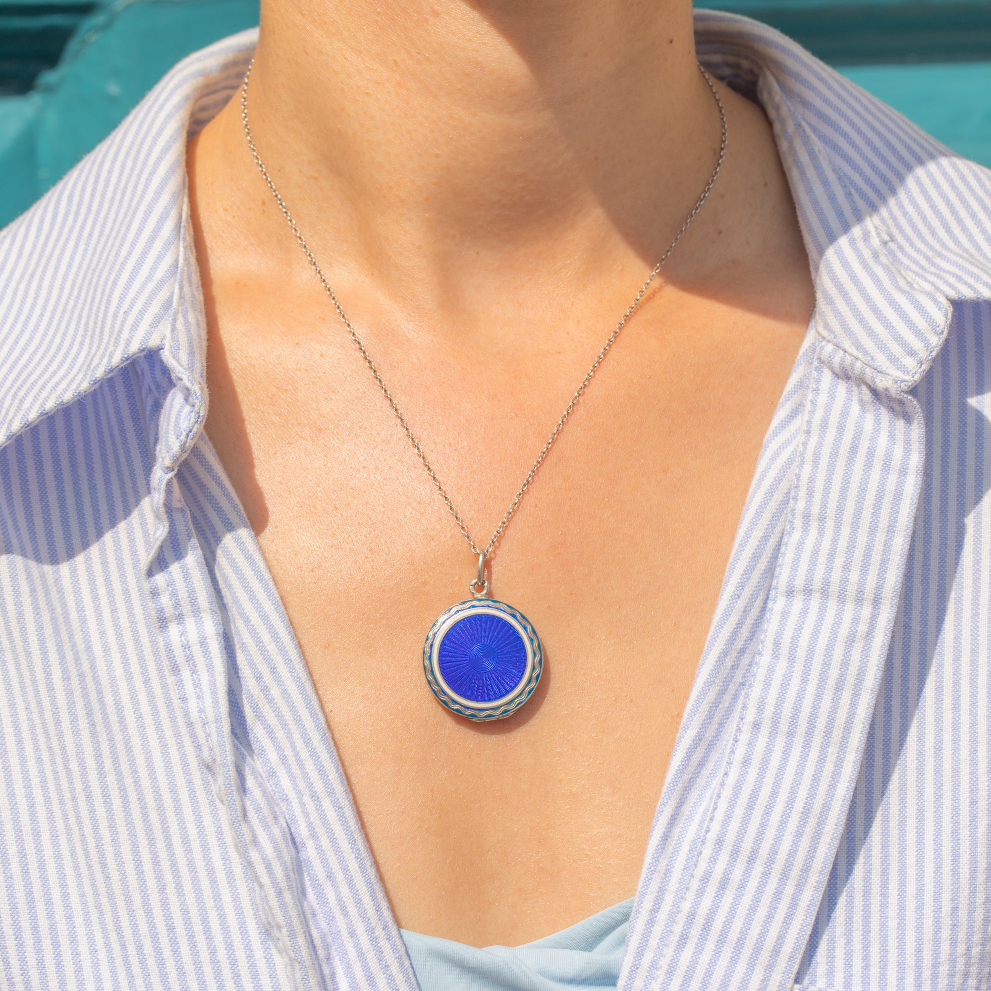 This beautiful Edwardian locket features a striking Royal blue Guilloché Enamel design bordered by a crisp white edge. The vibrant colour and intricate detailing exemplify the fine craftsmanship of the early 20th century, making this piece a true statement of elegance. The interior is gilded, and both frames remain intact, showcasing its careful preservation.