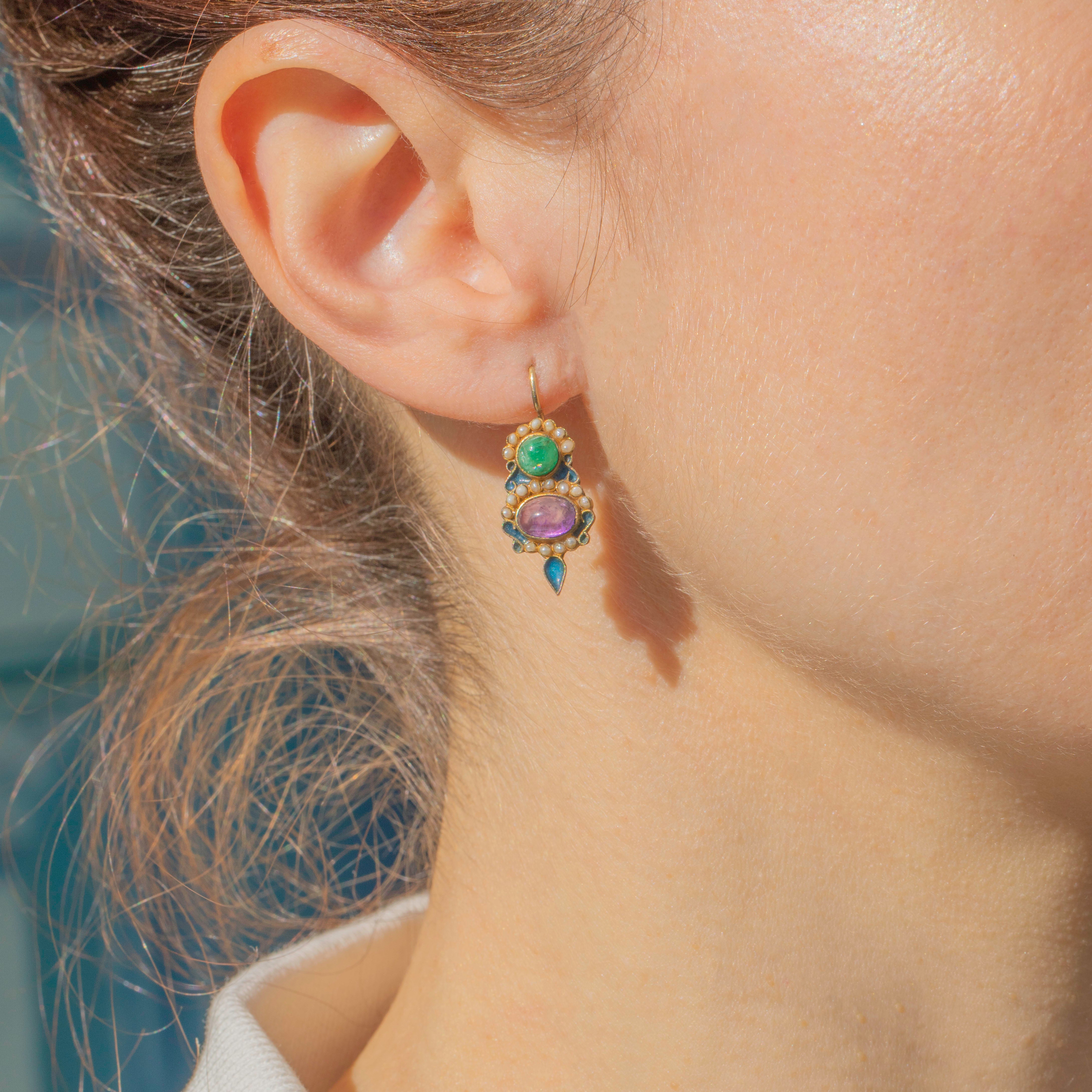 Ornate and decadent in style, these earrings each feature a vibrant green Emerald, complemented by a soft lilac Amethyst below. Each gemstone is harmoniously married by the iridescence of their surrounding seed Pearls and vibrant blue Enamel.