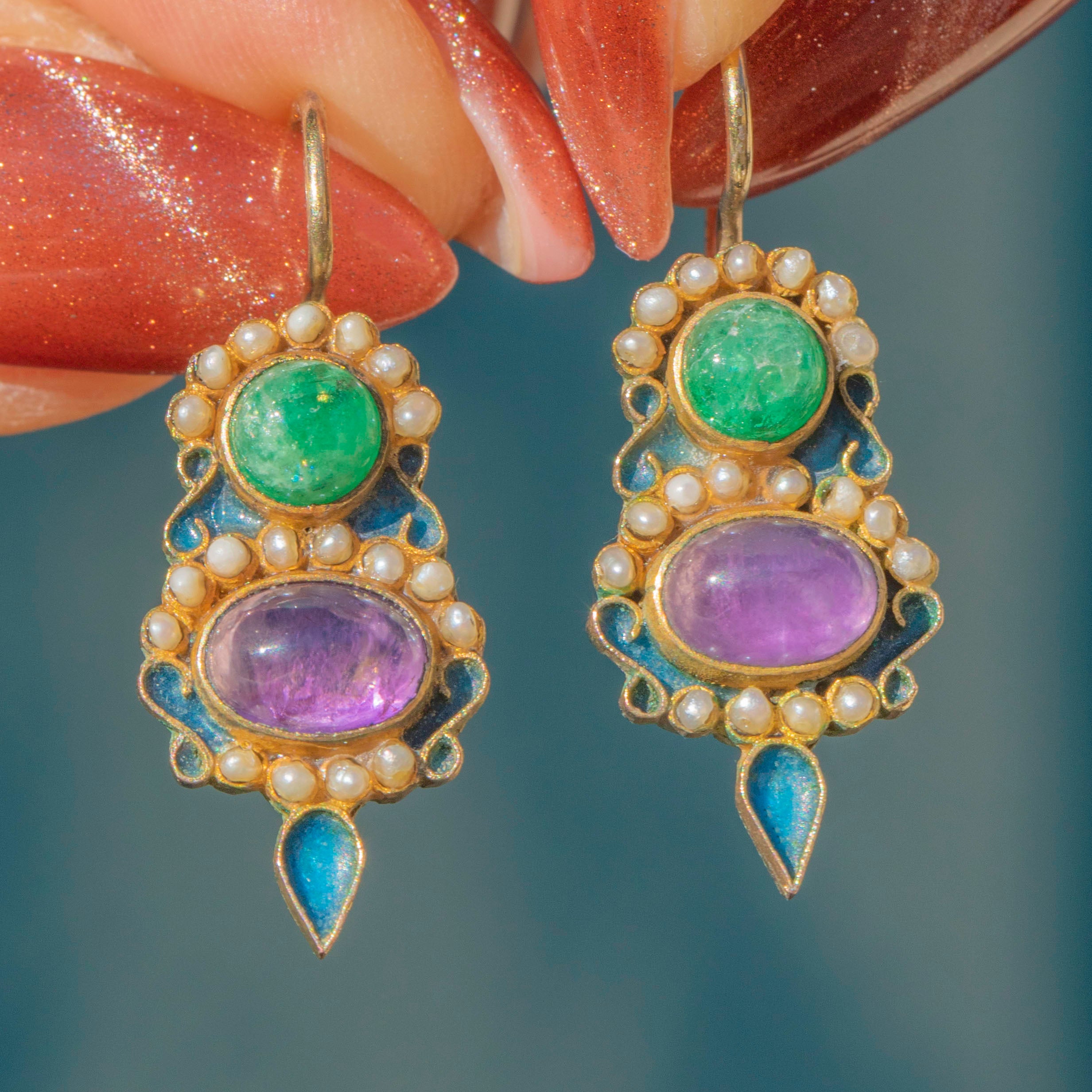 MATERIALS: Silver Gilt hooks, gilded metal bottoms, Amethysts (0.90ct), Emeralds (0.60ct), Seed Pearls, Enamel.