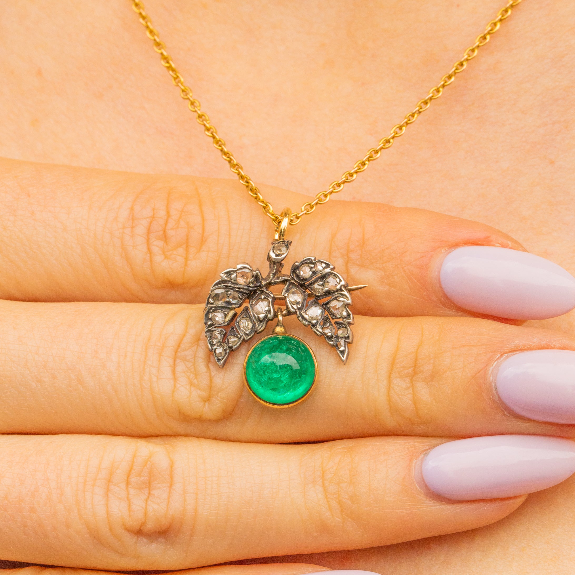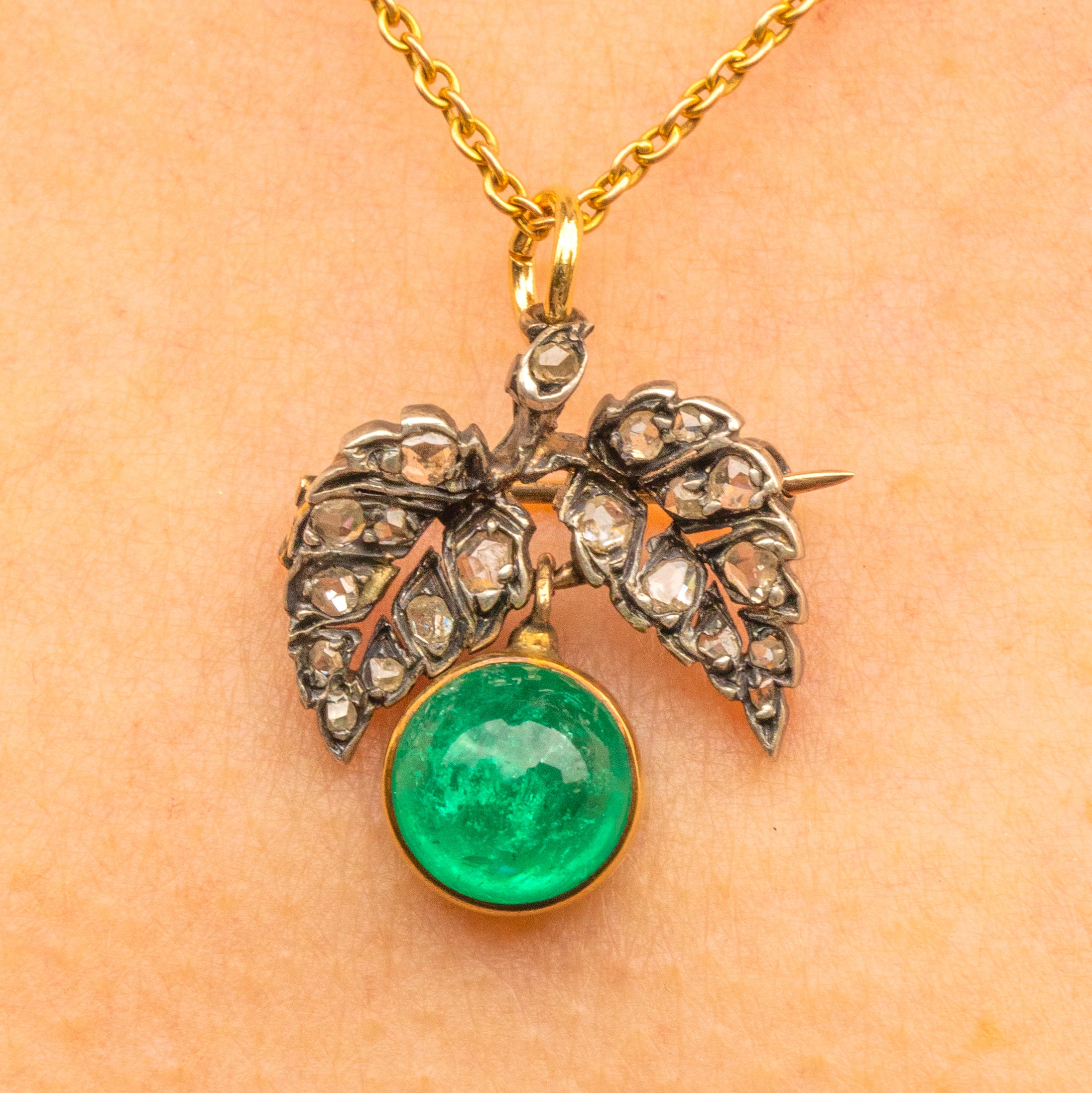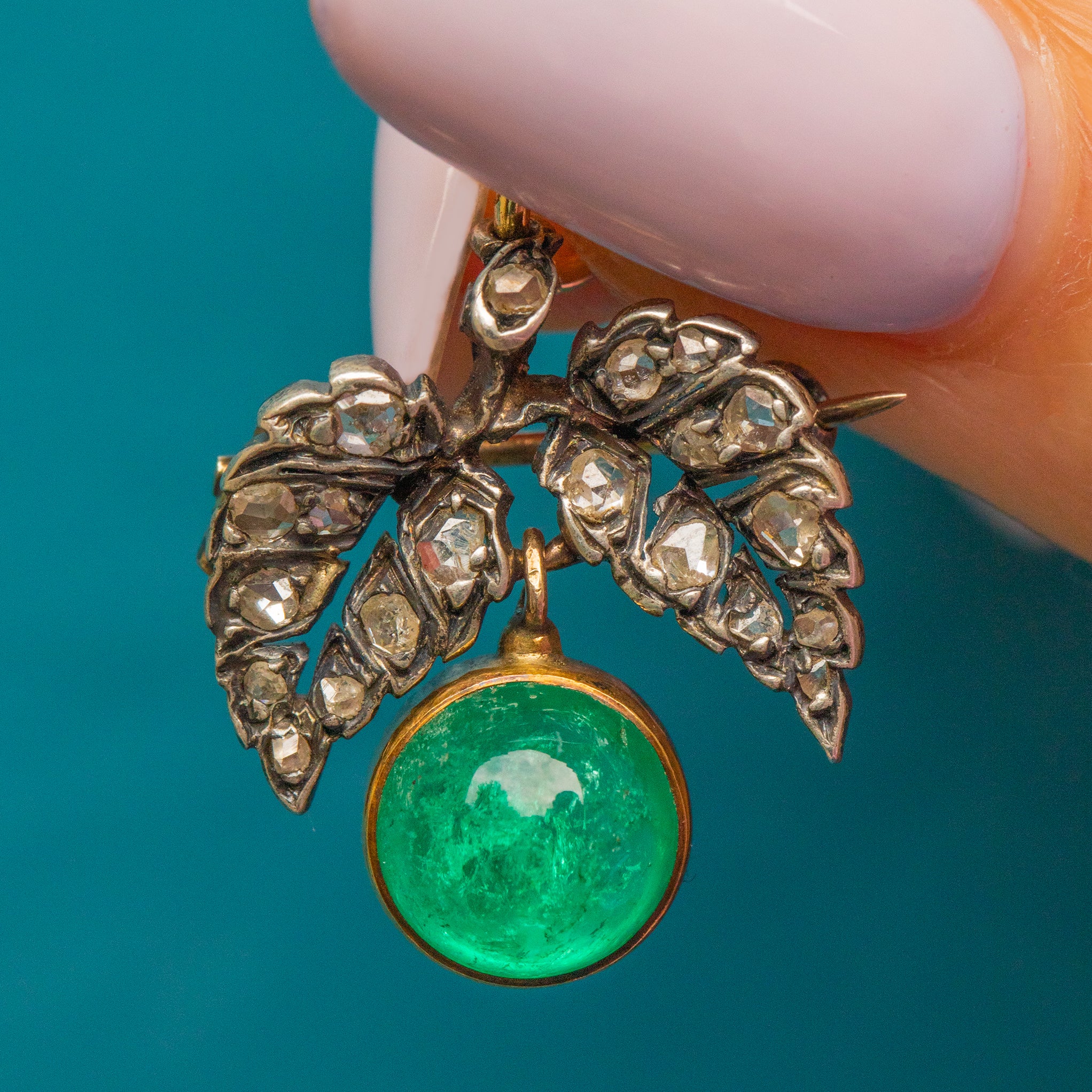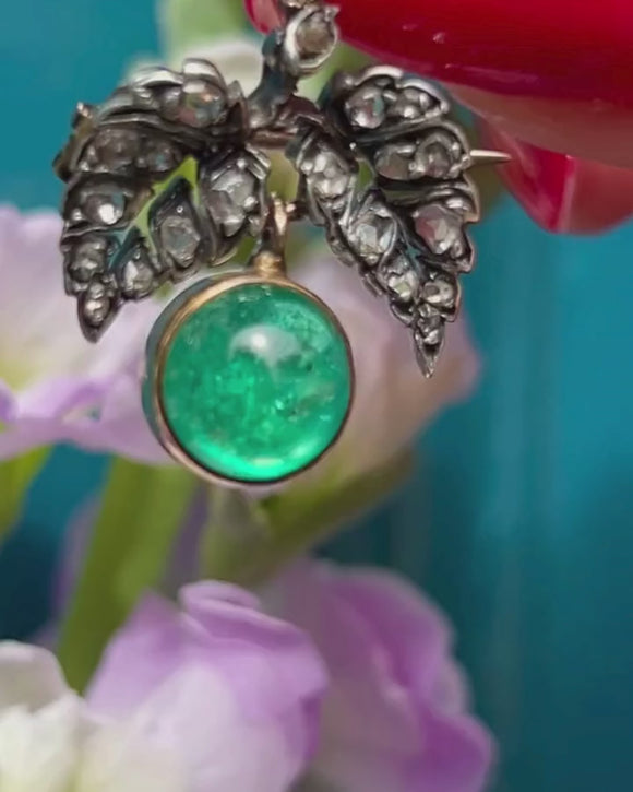EXCELLENT. This antique Emerald and Diamond leaf brooch is in excellent condition! The Diamonds are secure within their settings and each boasts unique facets. The Emerald is also in tip top condition, with wonderful inclusions that can be seen within the smooth cabochon cut. The design of this Victorian brooch is structurally sound and treated with the right care, has many more years to come!