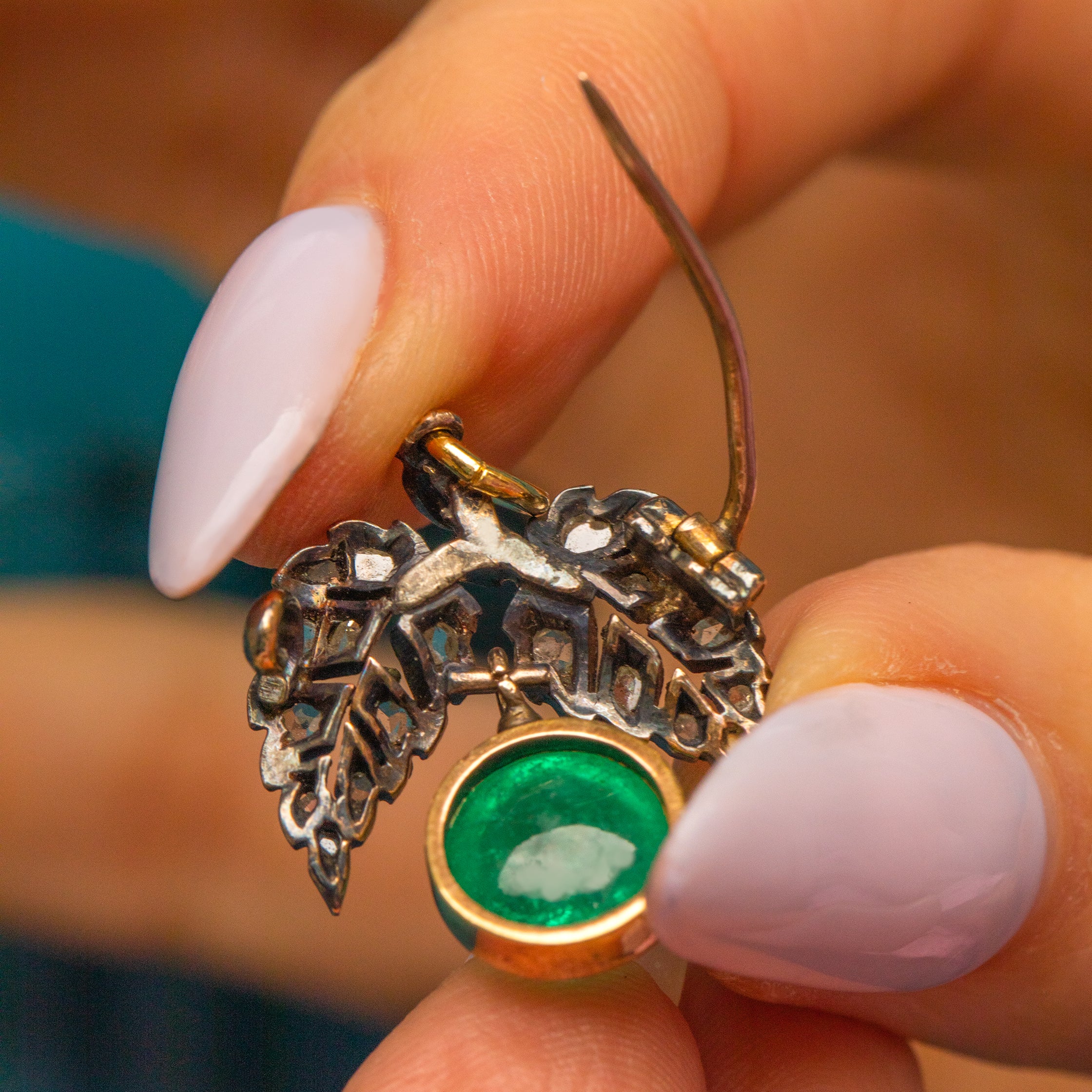 Whether a lover of nature or an antique jewellery enthusiast this antique Emerald and Diamond leaf brooch was made for you! The most splendorous leaves you will ever lay eyes on, their whimsical form is inlaid with an abundance of fabulously faceted rose-cut Diamonds.