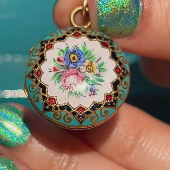 This antique Enamel flower locket will cheer up anyone lucky enough to lay eyes on her! Both her front and back flaunt a bunch of flowers in full bloom, framed by mandala-esque detailing crafted from Enamel.